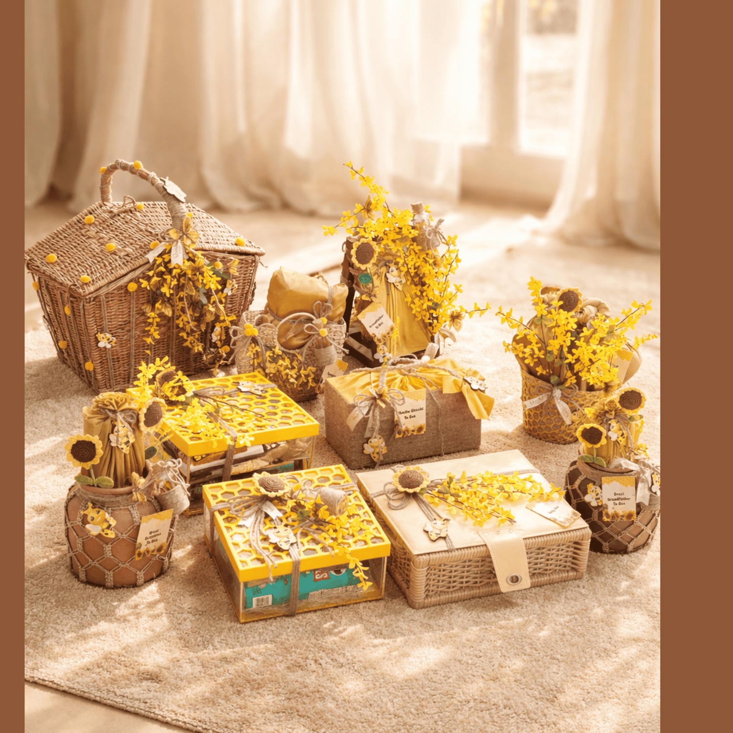 This vibrant gift set features a dusty blue backdrop adorned with detailed...