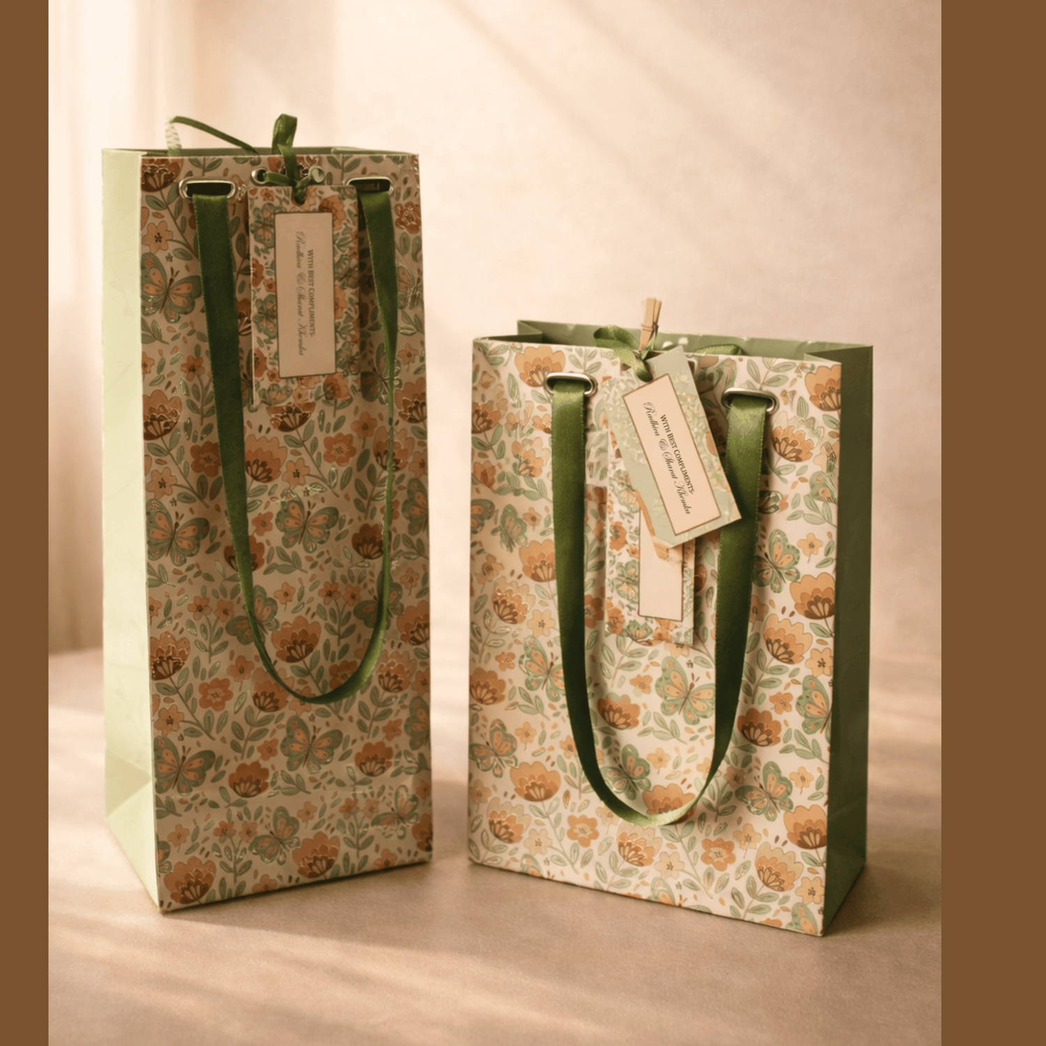 A refined stationery set featuring soft sage envelopes and a delicate floral...