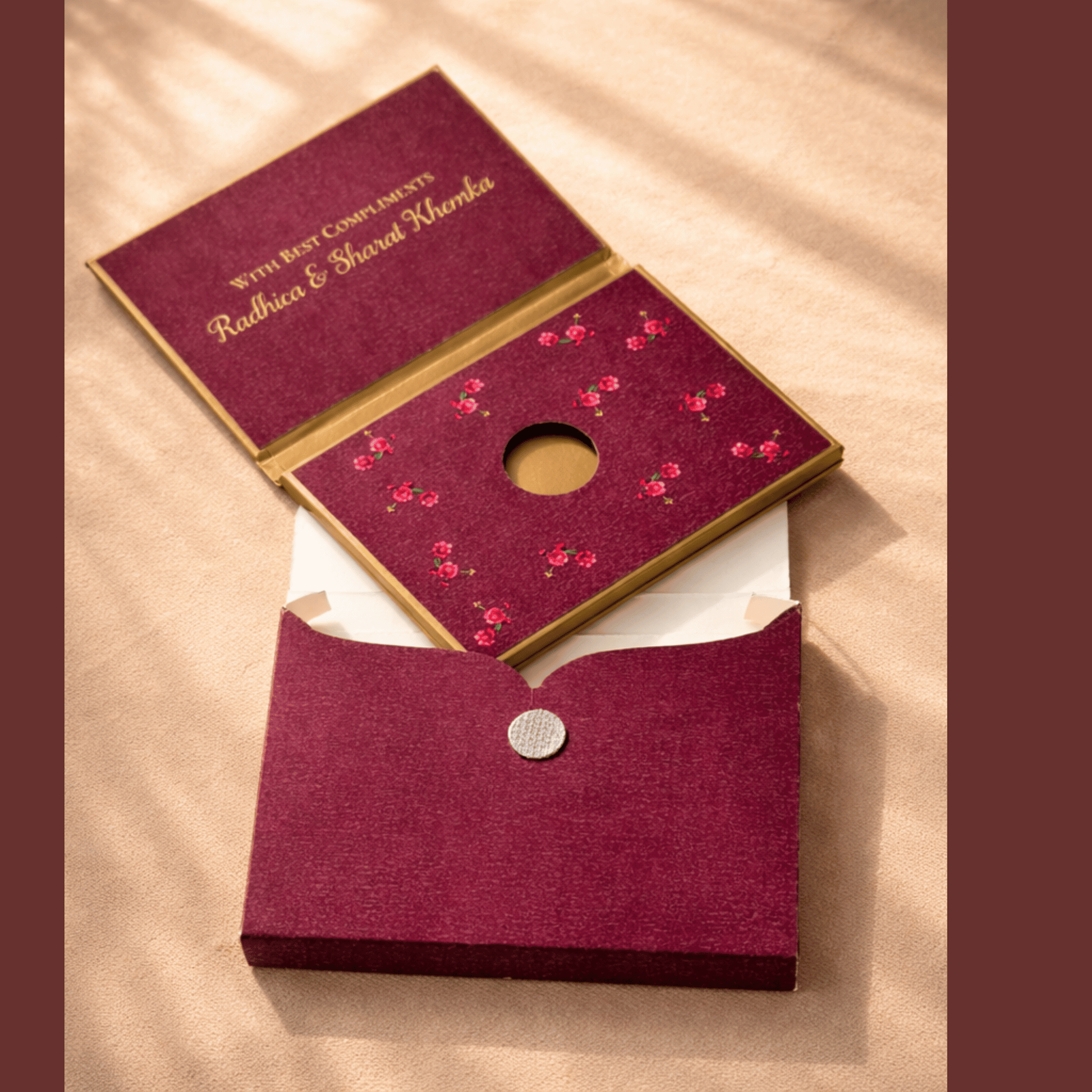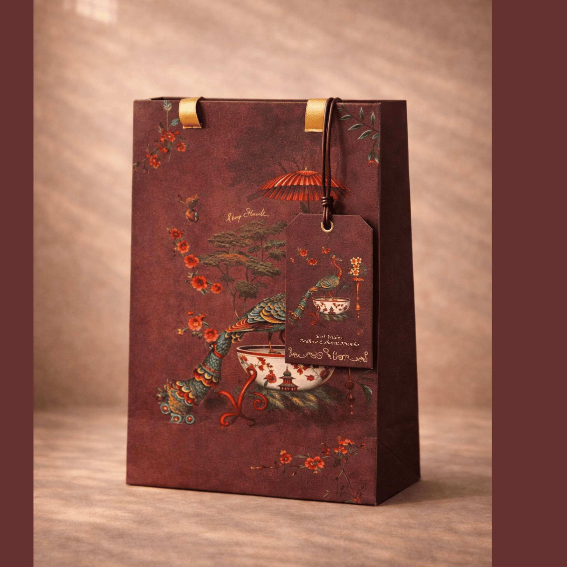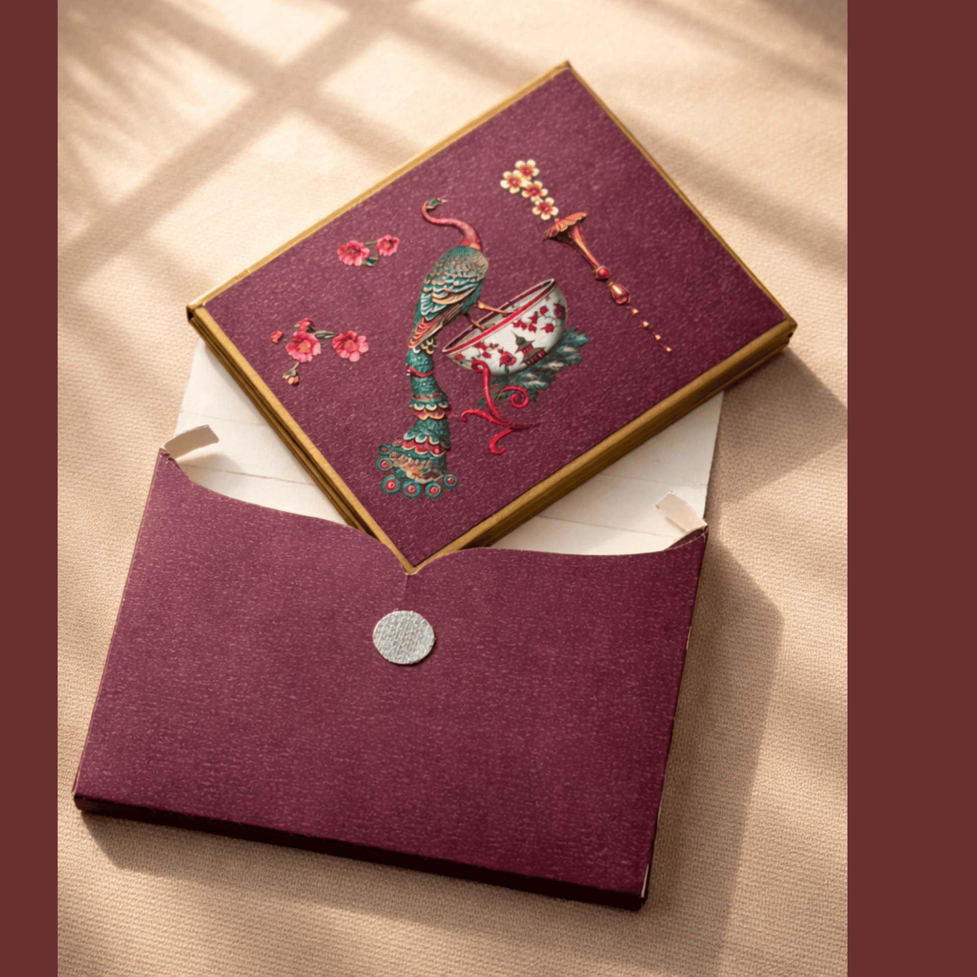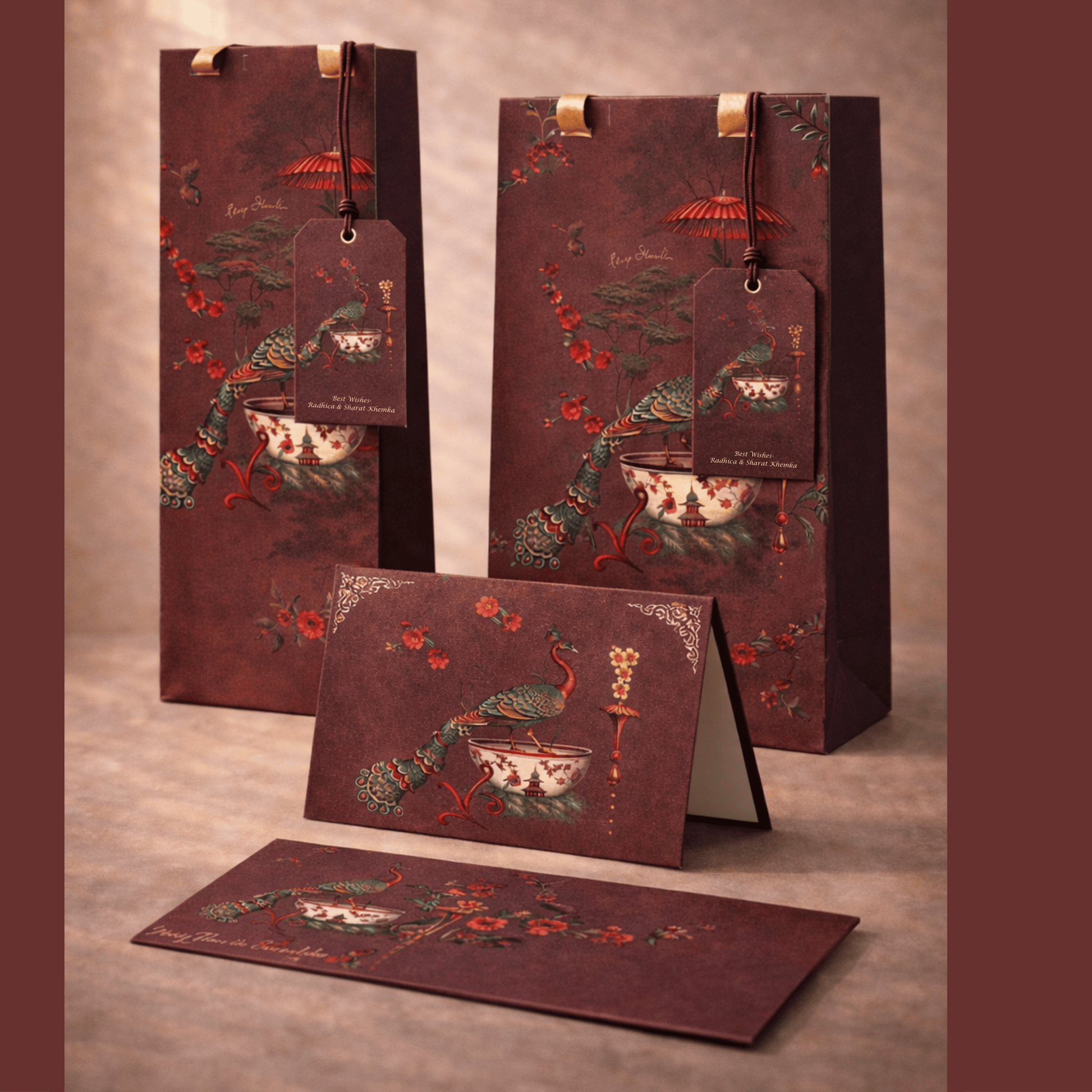 An elegant, vintage-inspired gift set featuring a deep burgundy color palette with intricate peacock and floral illustrations. The collection includes 10 personalized envelopes, 5 gift bags, 5 bottle bags, 5 note cards, 5 gift tags and 1 ginni case, all adorned with Chinoiserie-style motifs and gold accents.