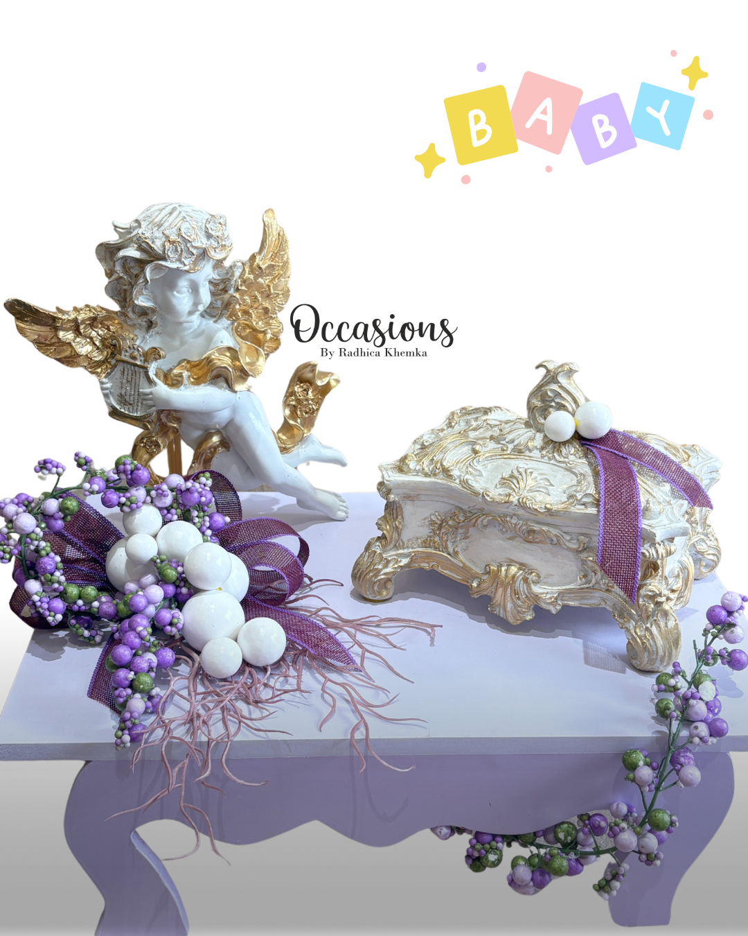 A graceful setup for the mom-to-be, featuring elegant gold-accented decor, soft lilac hues, and charming floral embellishments—perfect for celebrating the miracle on the way.