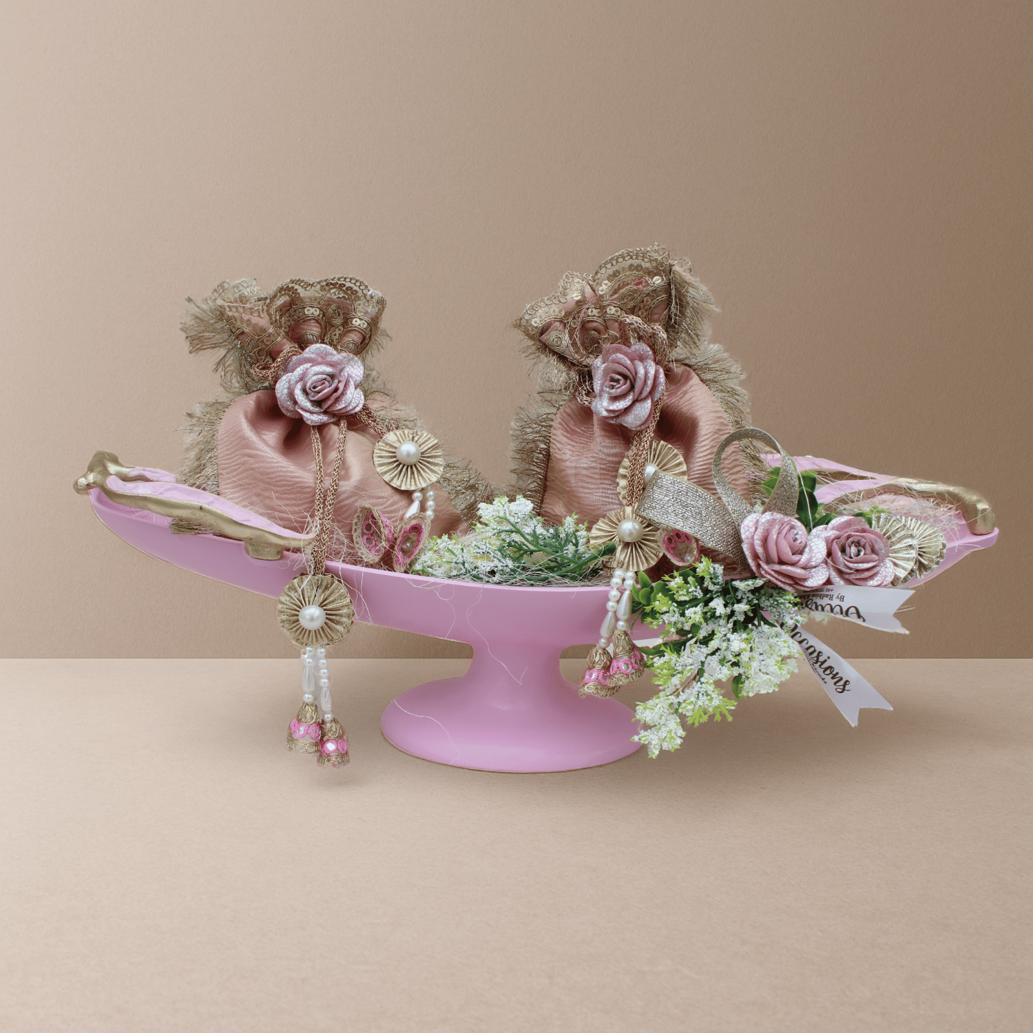 Delicate pink and gold pouches on a pedestal tray, perfect for graceful return favors.