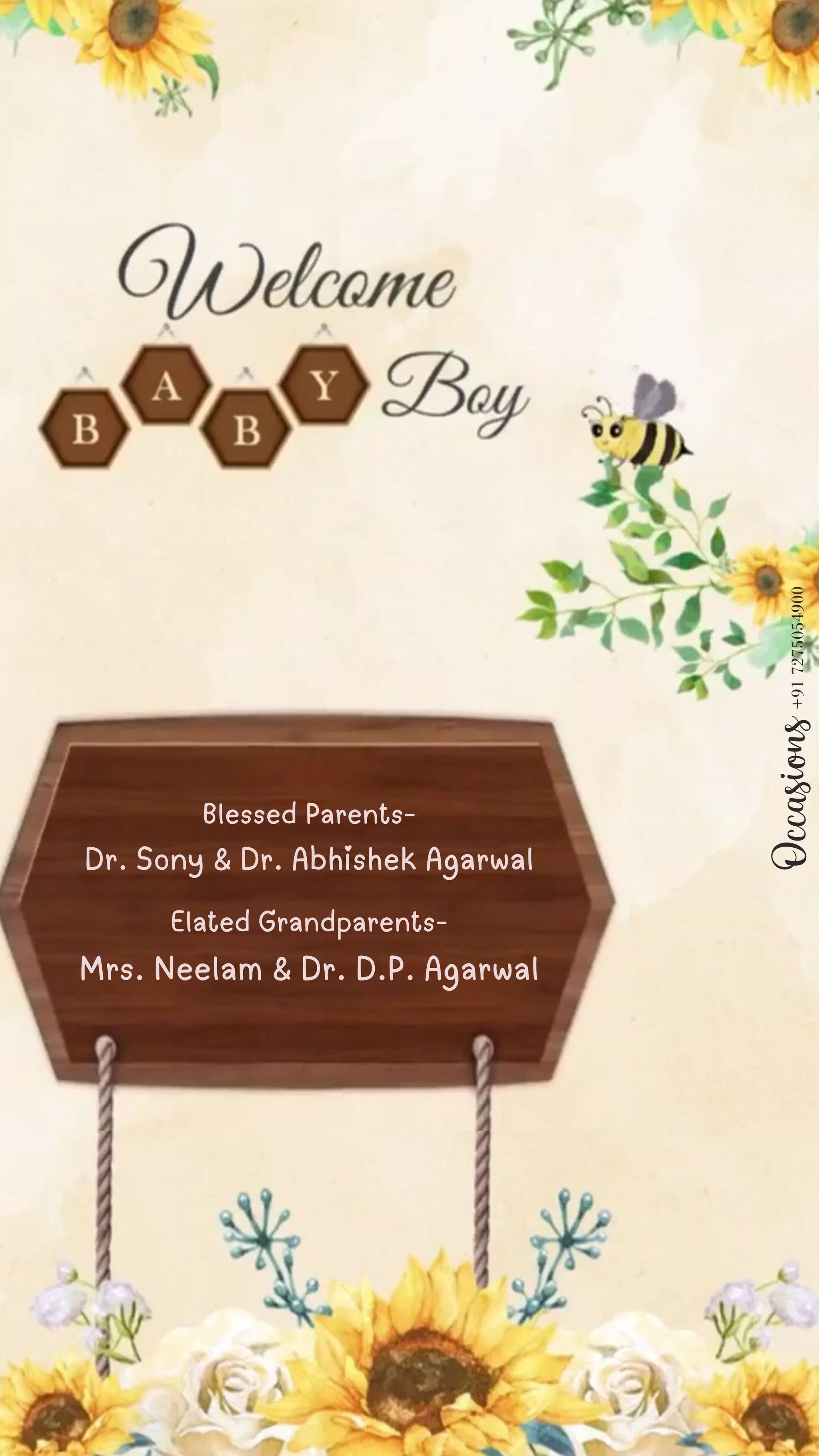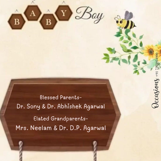 A charming e-invite celebrating the arrival of a baby boy, featuring a warm, nature-inspired design. The design is creatively spelled out with honeycomb tiles, while a buzzing bee adds a playful touch. Bright sunflowers and lush green leaves frame the invite, creating a fresh, rustic, and heartwarming aesthetic—perfect for welcoming a new little life.