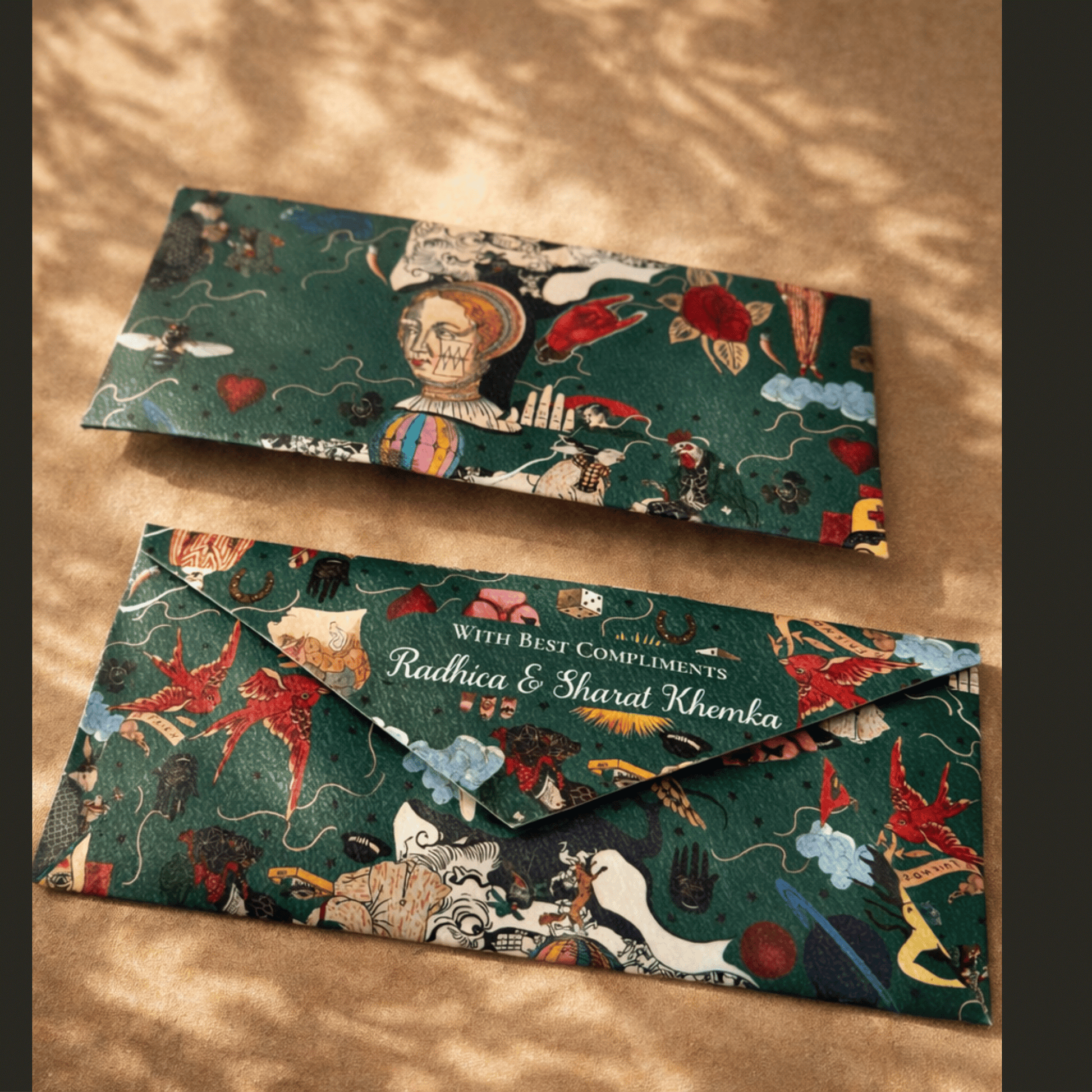 A stylish money envelope adorned with artistic illustrations and rich green tones, designed to elevate festive and special-occasion gifting.