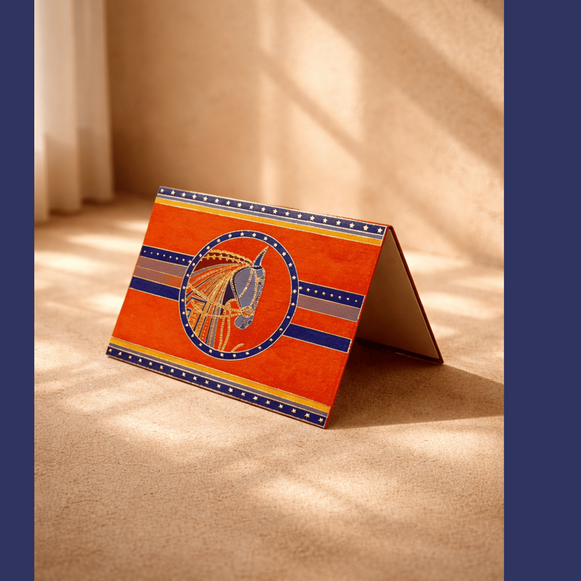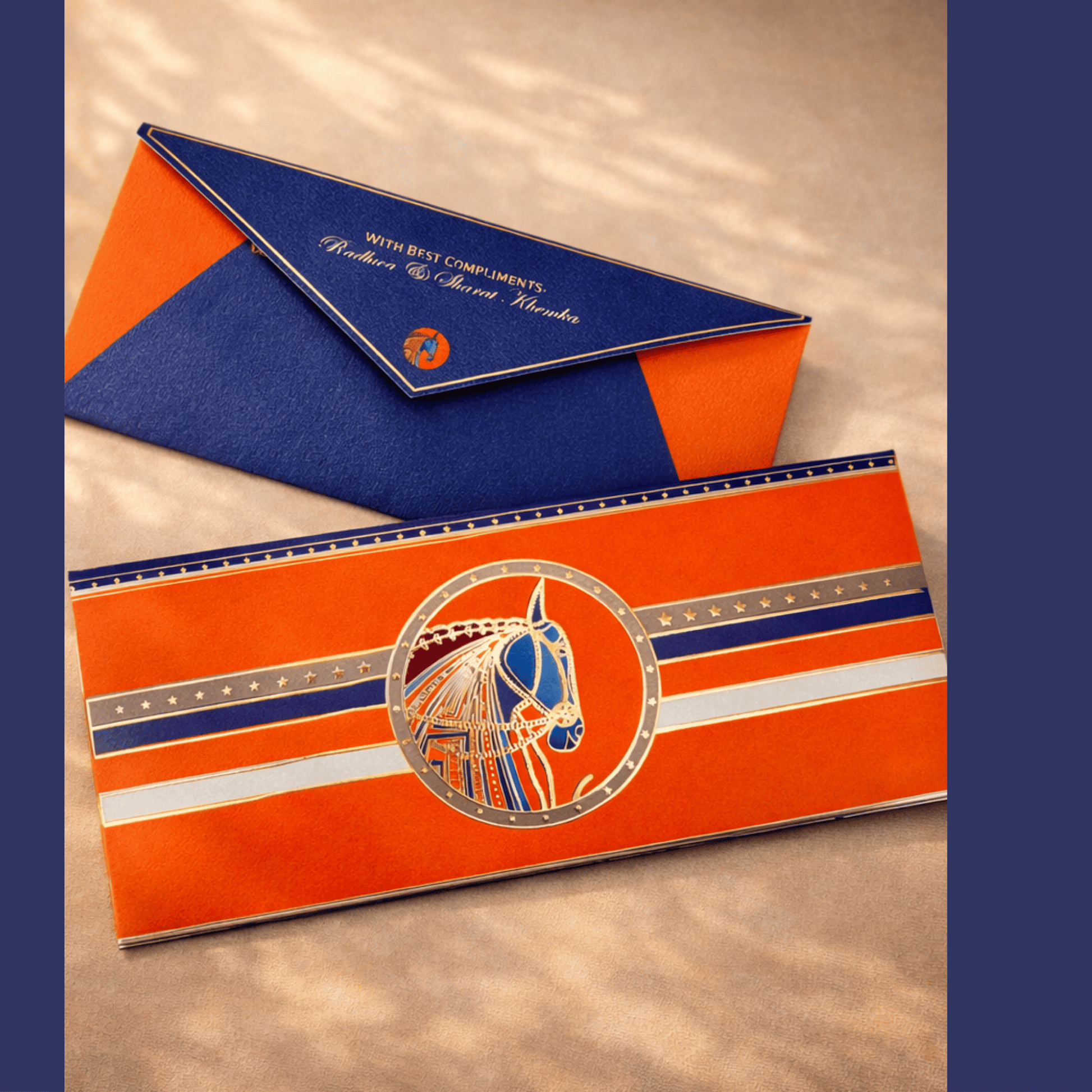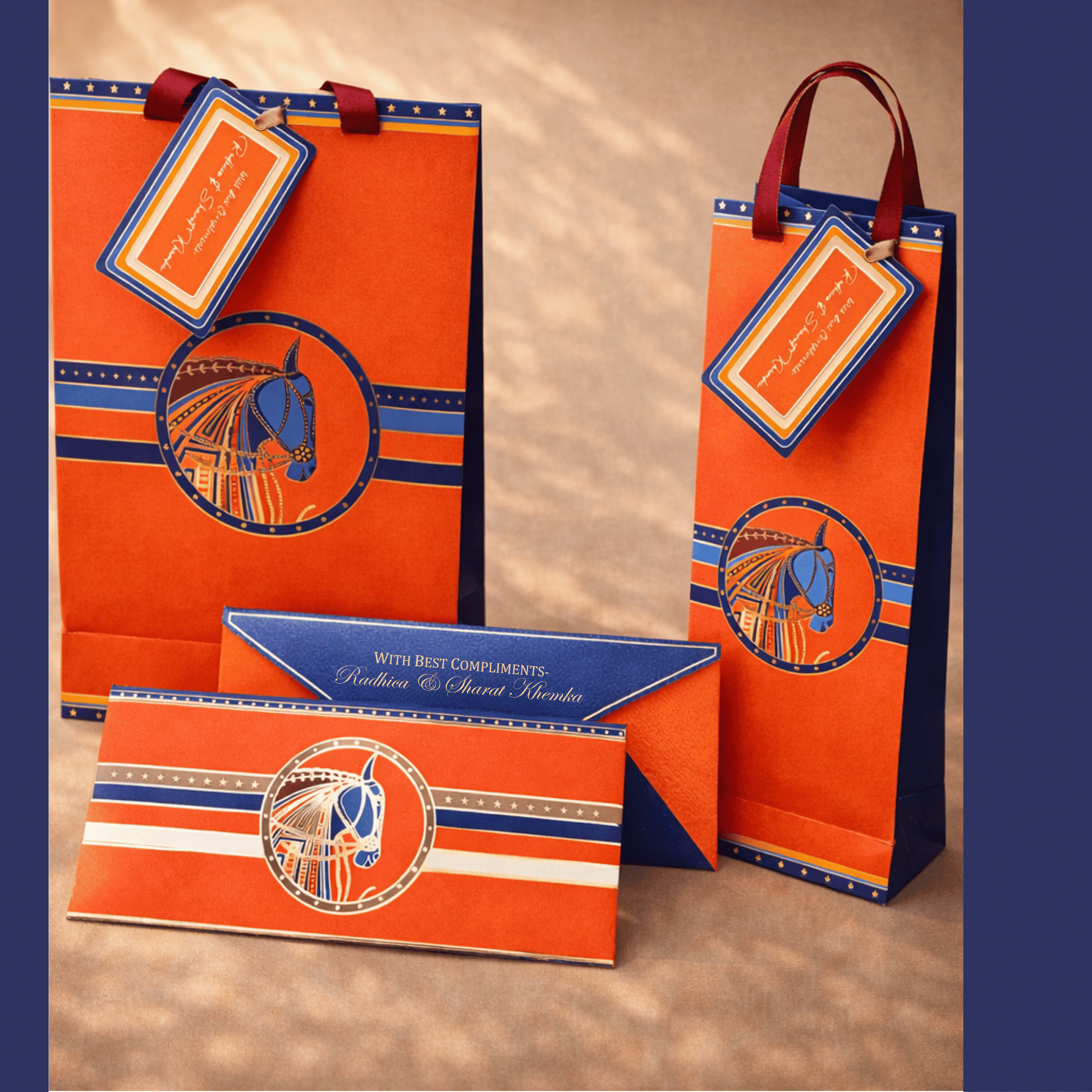 This comprehensive collection features a coordinated set of premium stationery and packaging, including 10 personalized envelopes, 5 gift bags, 5 bottle bags, 5 note cards, 5 gift tags and 1 ginni case. The entire suite is unified by a striking royal blue and vibrant orange palette and a majestic, gold-accented horse emblem, providing a cohesive and luxurious presentation for every gifting need.