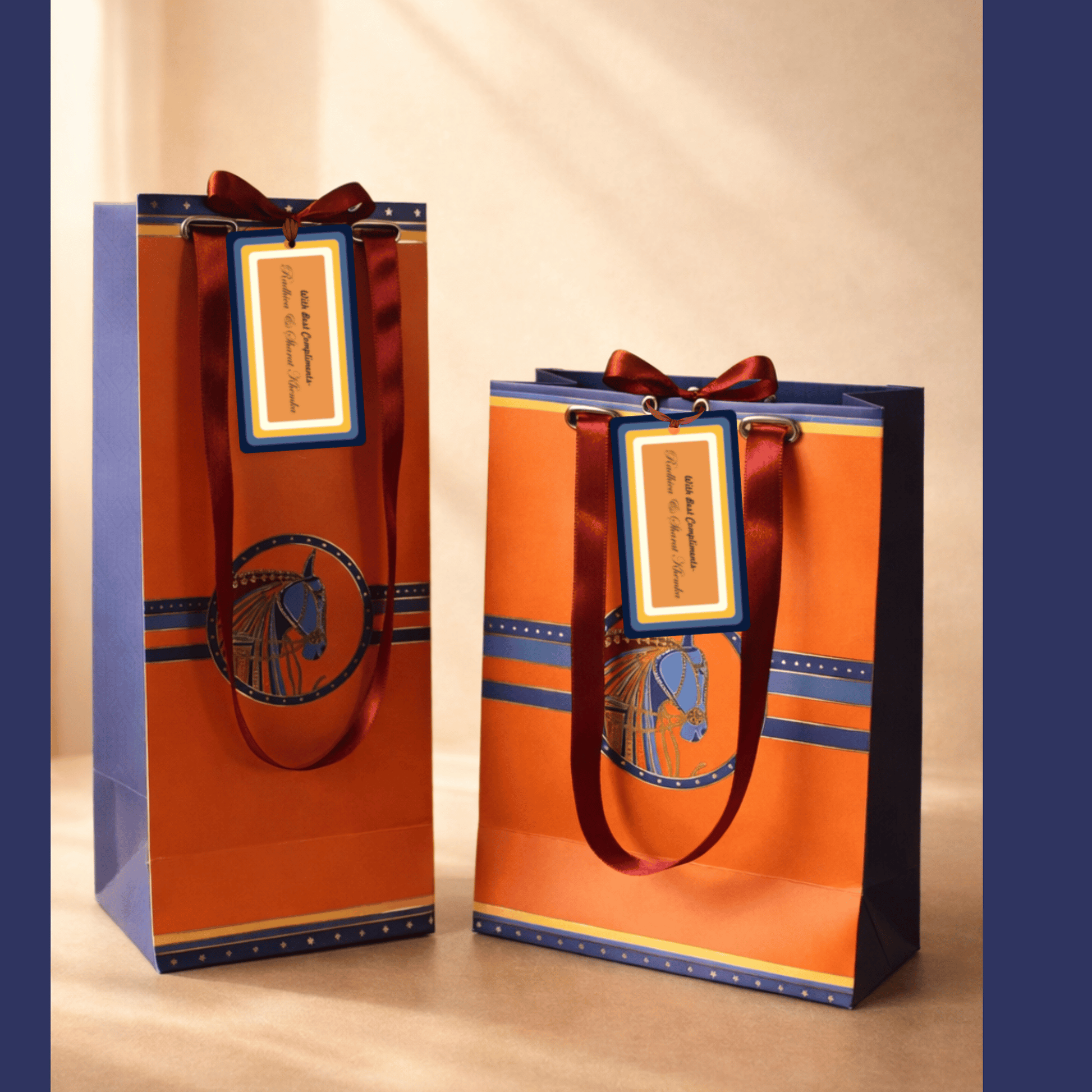 Set of Bold orange and blue gift bags featuring a regal horse motif, accented with rich ribbon handles and a neat tag—ideal for premium gifting with a touch of tradition and elegance.