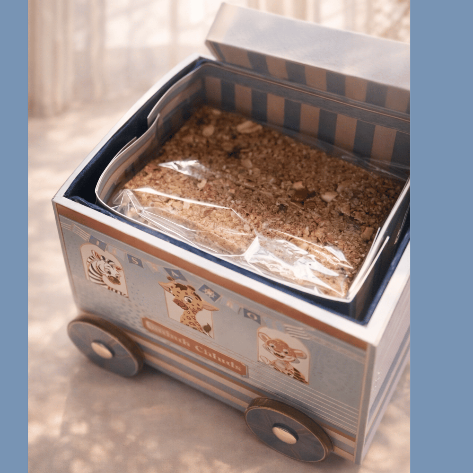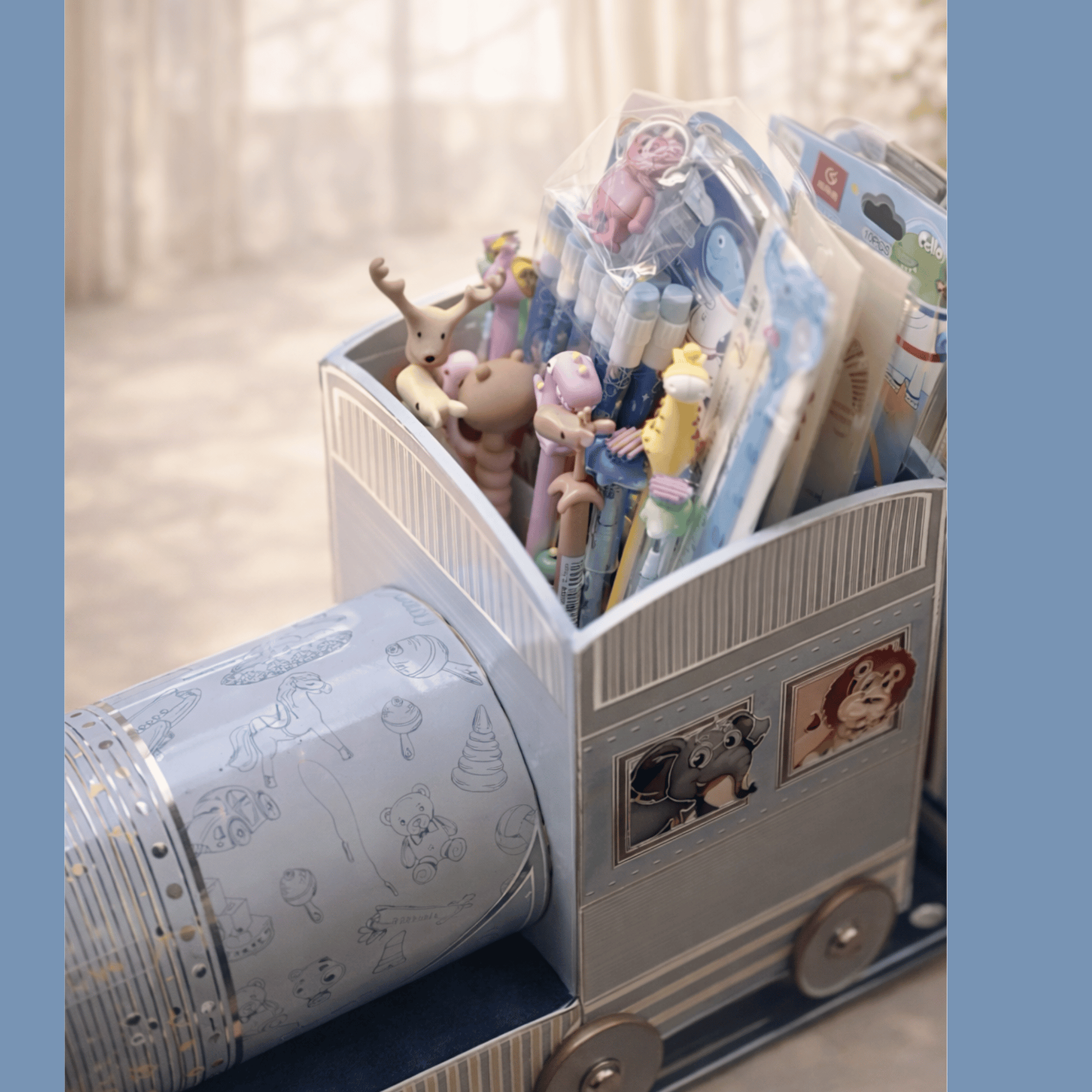 All aboard the wildest baby announcement yet! This handcrafted wooden train chugs through the jungle, with animals dancing in delight to welcome the baby boy. The three-part set includes an engine filled with kids’ stationery and two bogies carrying sweet bakery surprises—all packed in customized boxes featuring the baby’s initials. Resting on a rail track-style platter and finished with jungle-themed enamel, this keepsake is both playful and practical. A joyful journey in every detail, ready to roll into hearts!