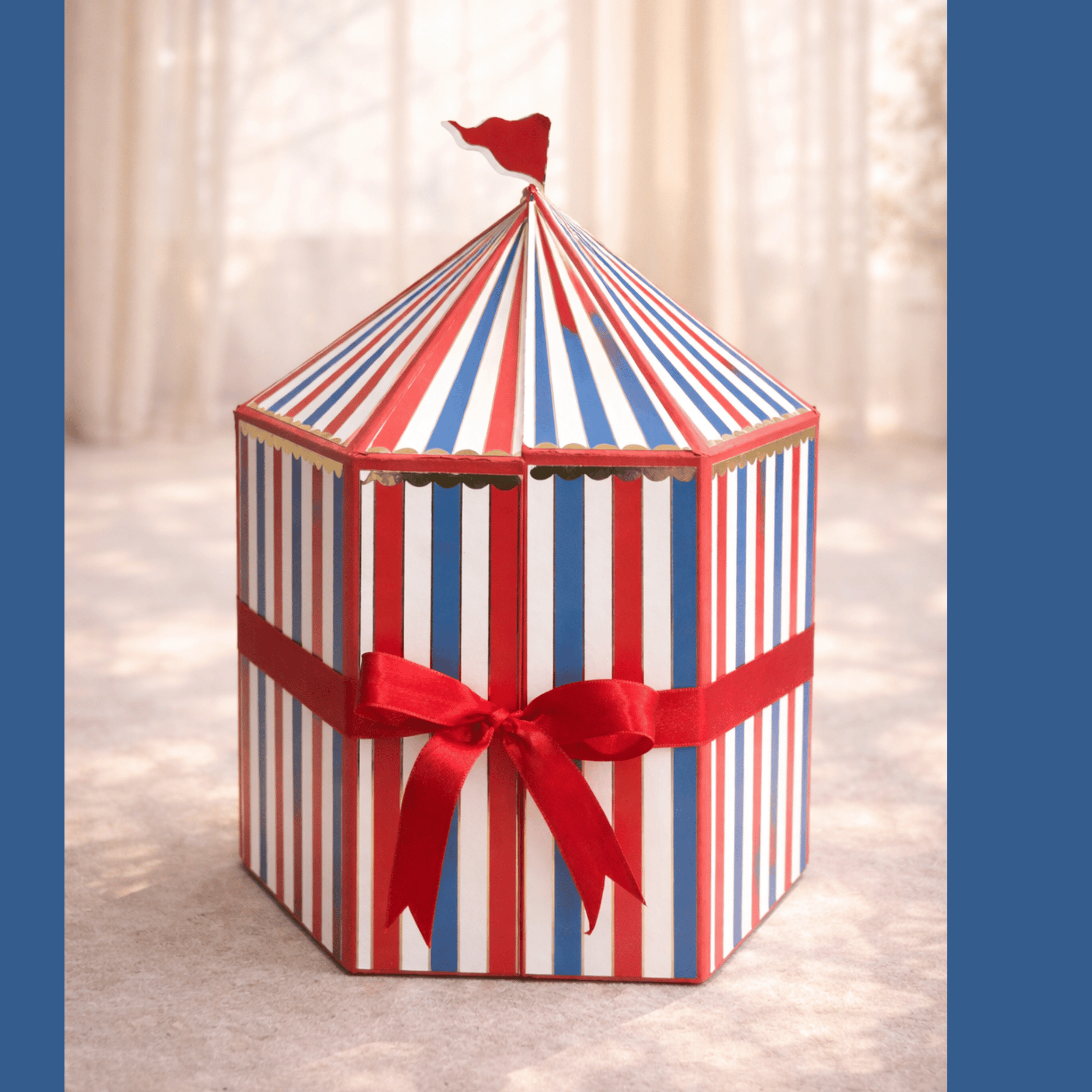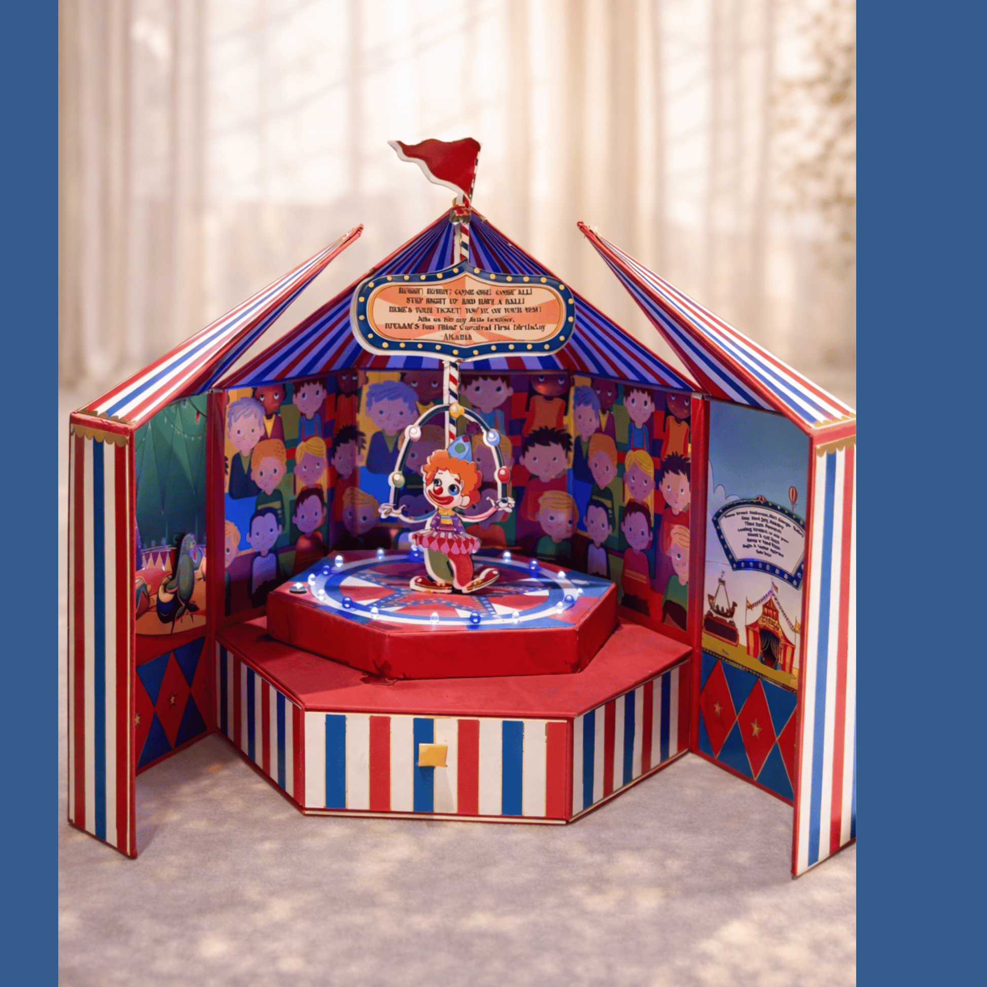 A carnival of lights, music, and joy, this circus-themed announcement is pure magic. Untie the ribbon and watch the show begin—a cheerful clown takes center stage under glowing red and blue LEDs, with music that plays and a whole mini circus scene that comes alive. Hidden beneath the stage is a drawer filled with goodies, making it as fun as it is functional. With every detail thoughtfully designed, this box brings the wonder of the big top to your baby’s big debut!