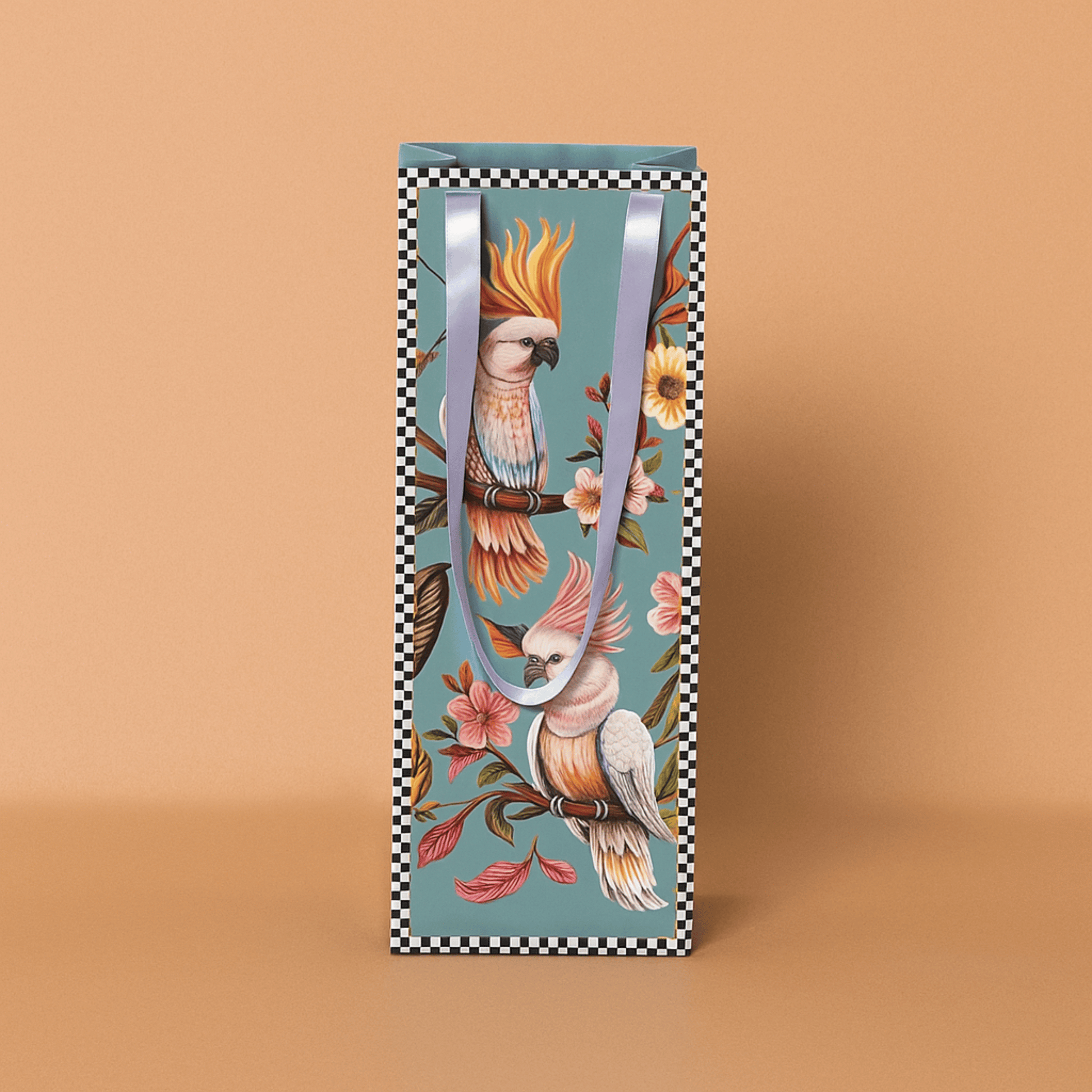 A delightful gift bag set adorned with vibrant cockatoos and blooming florals, perfect for adding a whimsical touch to your gifting.