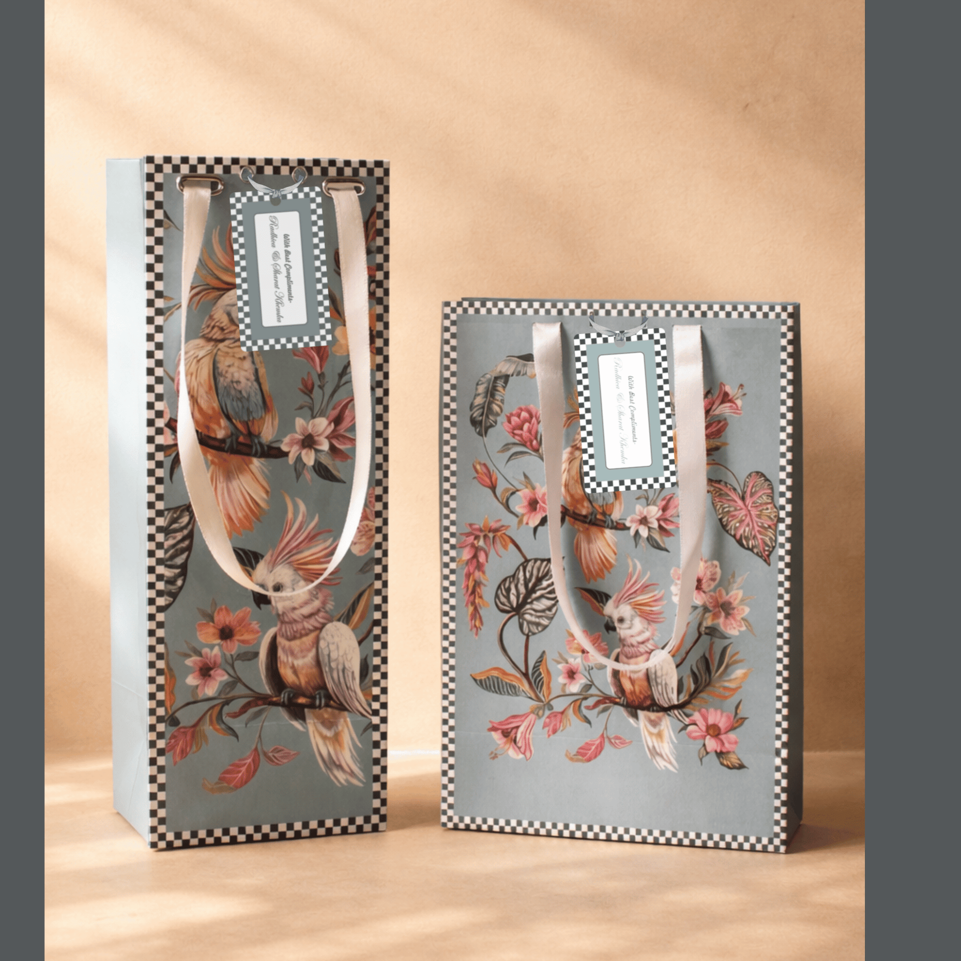 Set of Charming pastel gift bags featuring elegant parrot illustrations framed with subtle patterns and soft ribbon handles—perfect for graceful, nature-inspired gifting.
