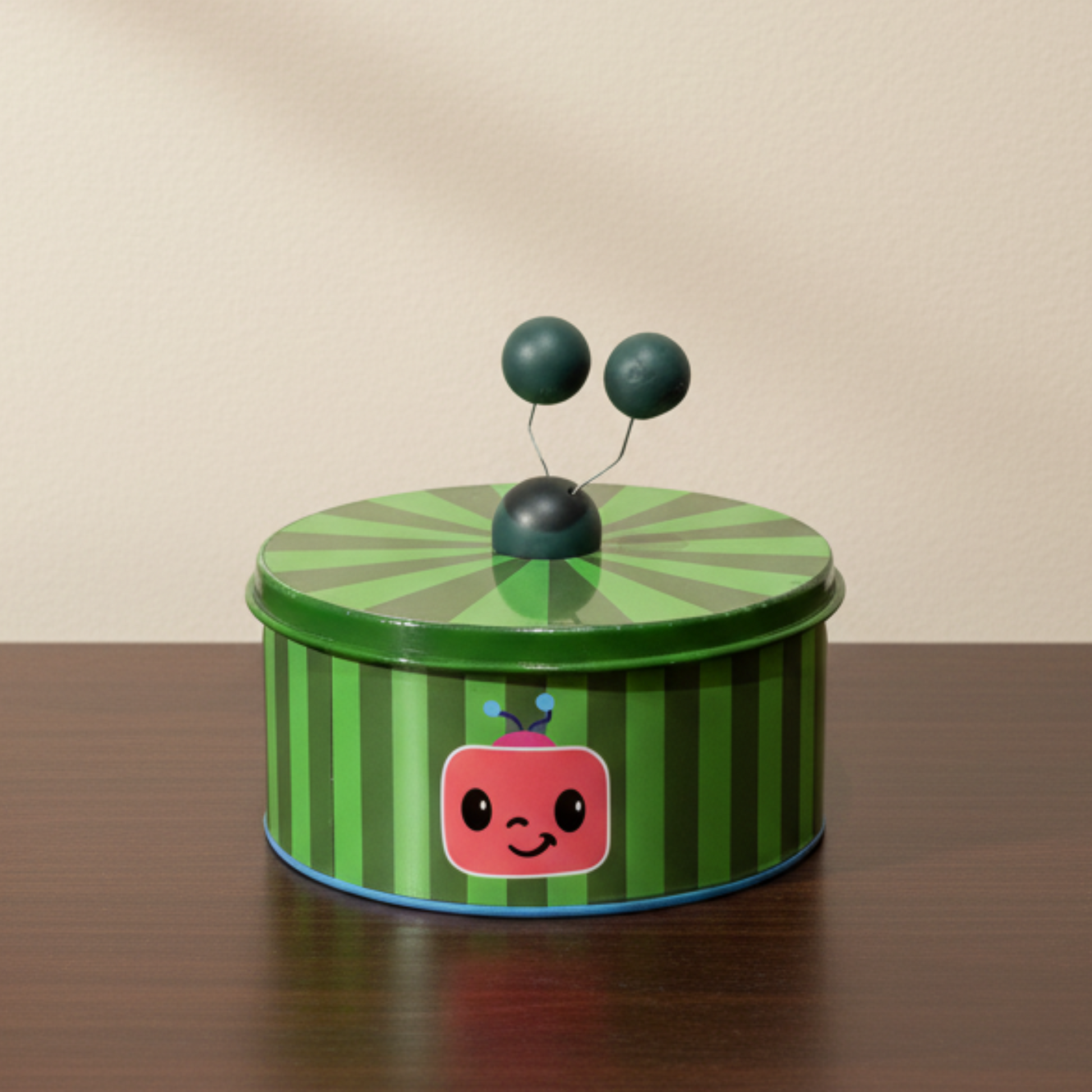 This Coco Melon-themed baby shower decoration features a green striped tin with a cheerful Cocomelon face on the front. The lid is topped with a playful antenna design made from dark green balls on wire, mimicking the signature look of the beloved character. Bright and whimsical, it's a perfect centerpiece for a fun and festive baby shower celebration!
