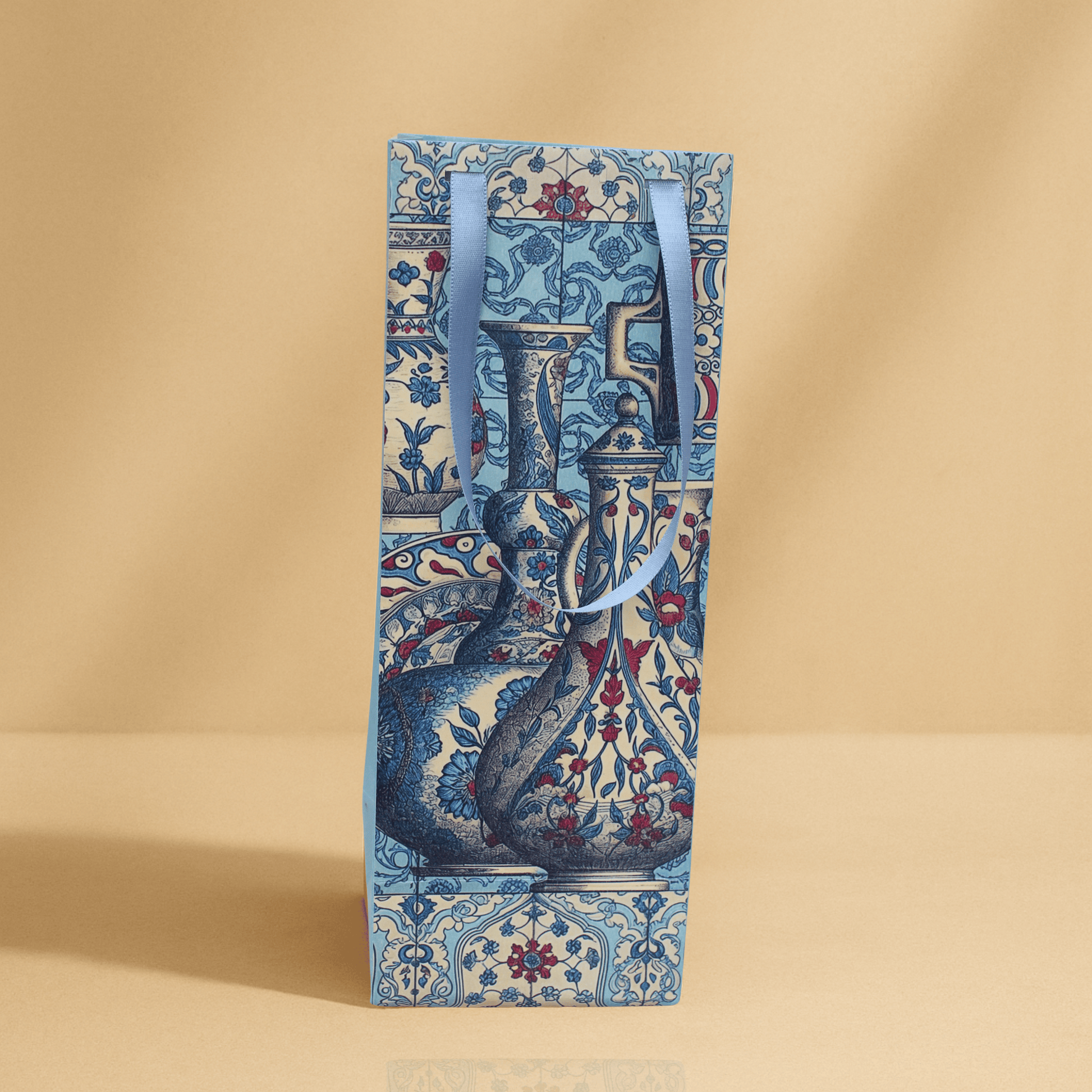 Luxurious medium gift bag in rich red with intricate laser-cut detailing and matching satin handles, perfect for festive gifting.