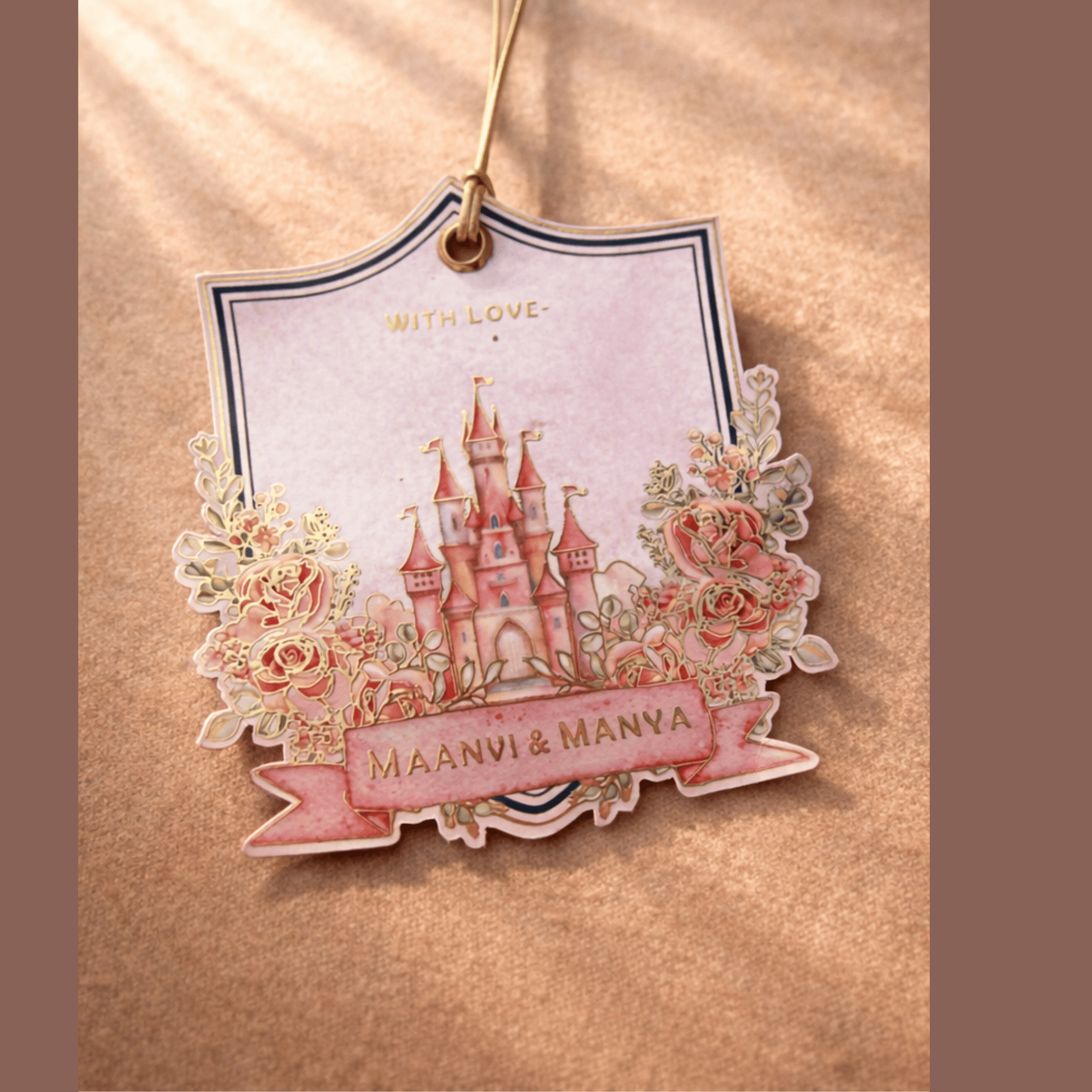Whimsical personalized tags featuring a fairytale castle and floral accents, perfect for adding a magical touch to children's gifts.