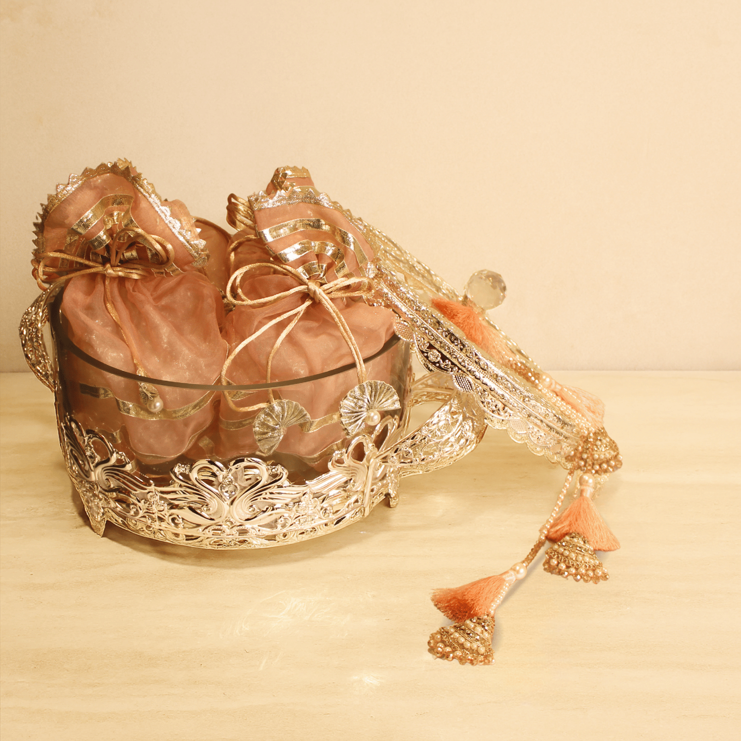 Elegant glass and gold-toned tray with peach pouches and beaded tassels, perfect for return favors.