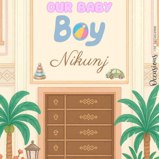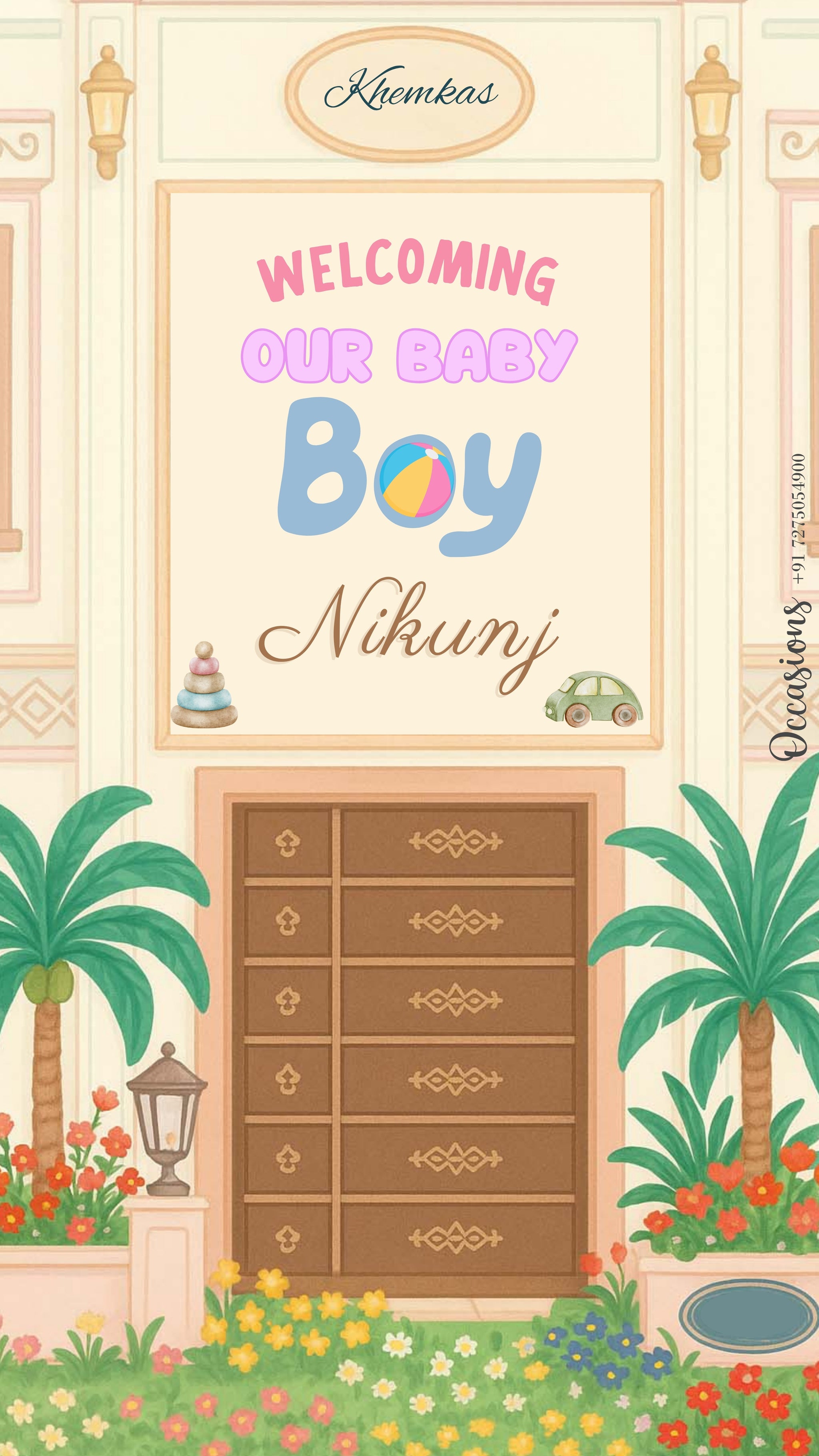 A sweet pastel-themed baby boy announcement styled like a cozy bakery window. Adorned with a bunny and a crowned pink cat surrounded by cupcakes and treats, this charming scene is framed by soft blue curtains and festive bunting. Elegant door designs, palm plants, and vibrant floral accents complete the joyful setting—perfect for sharing love and happiness with family, friends, and well-wishers around the world.
