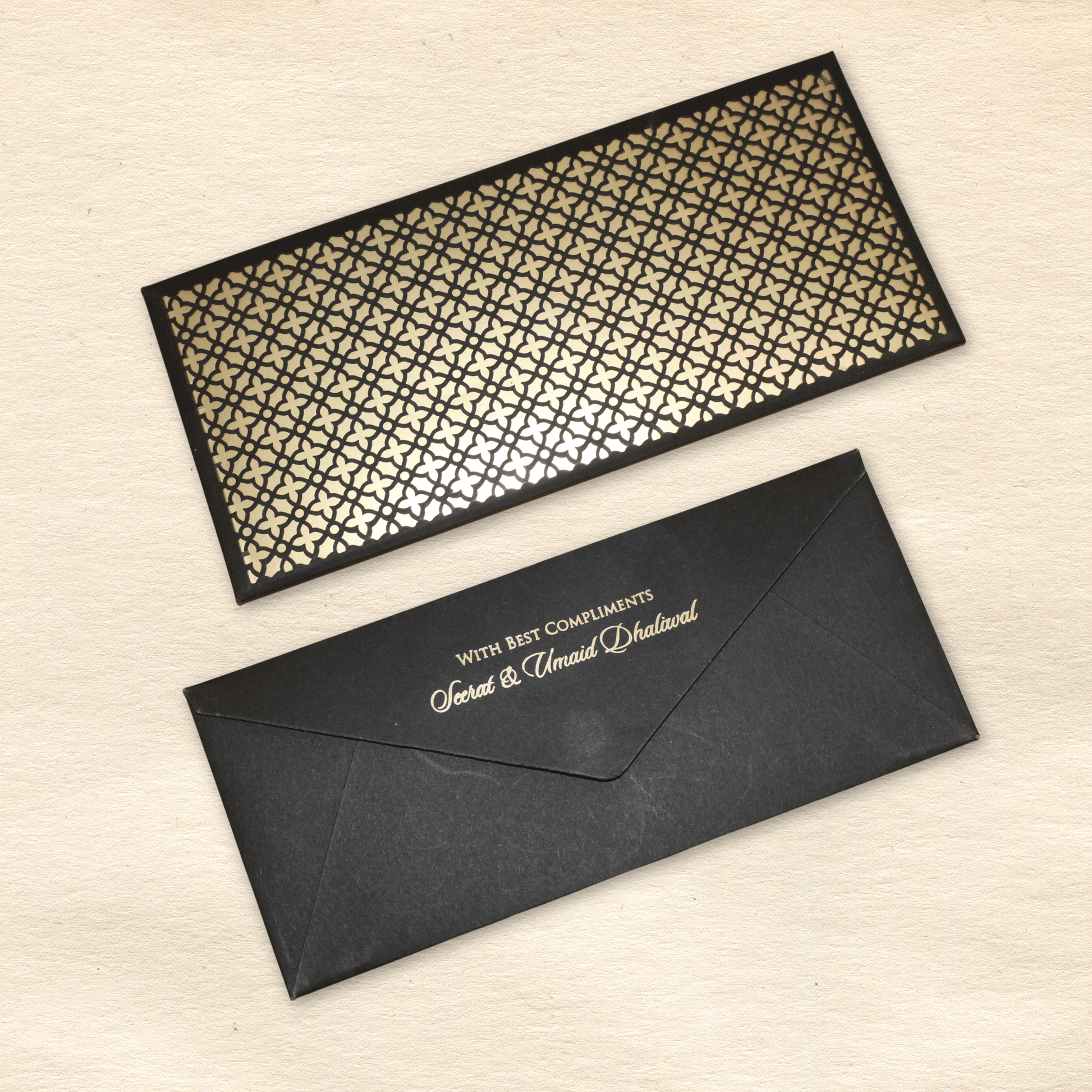 Elegant money envelope with intricate black lattice cutout over shimmering gold—ideal for premium gifting.
