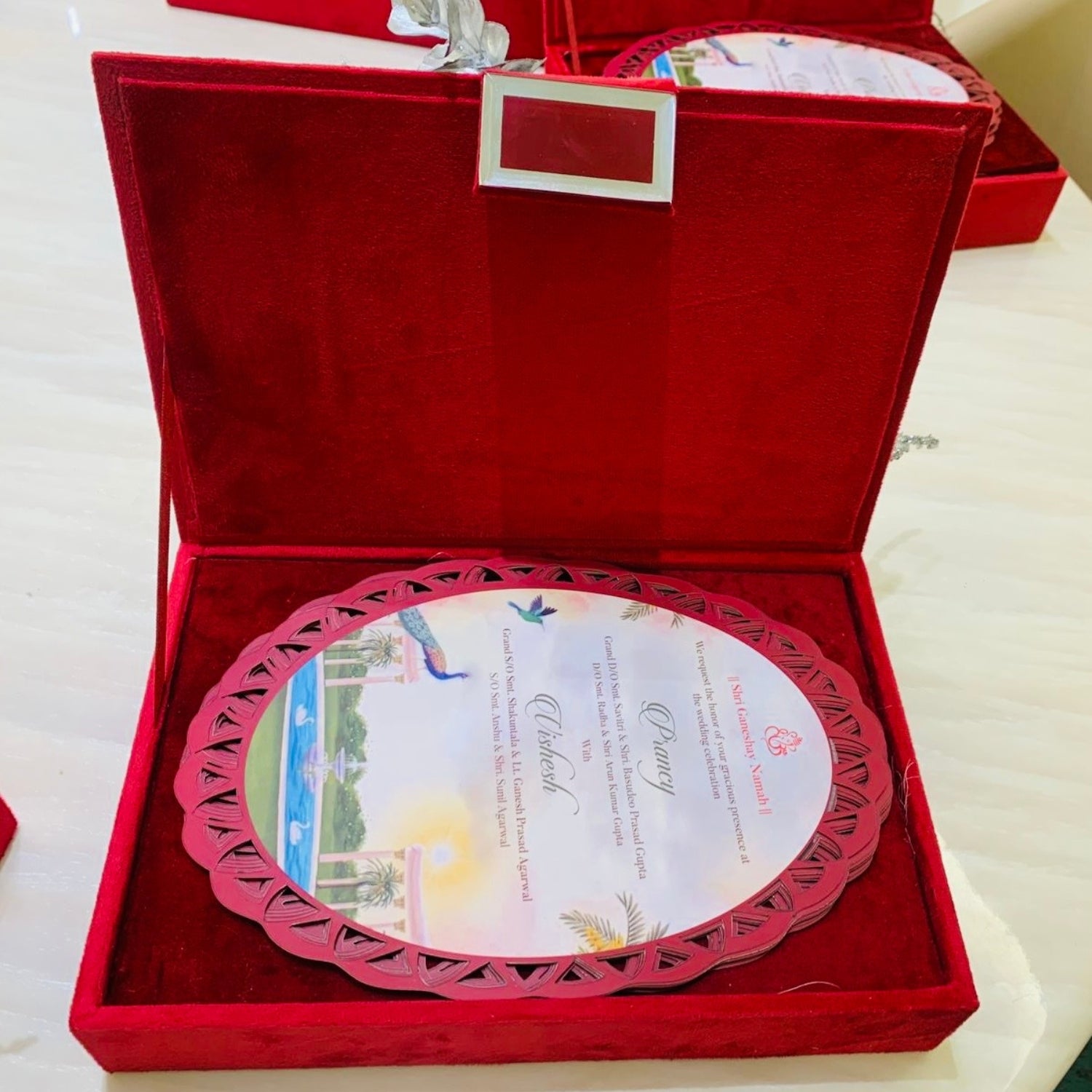 A luxurious red velvet wedding invite box holds a silver-plated oval container with a floral design, nestled in white fibers. The container is garnished with edible silver foil, saffron, and a yellow rose, surrounded by decorative stones. This opulent and culturally rich presentation, typical of Indian or South Asian weddings, suggests the inclusion of sweets or symbolic gifts, making it a memorable keepsake.
