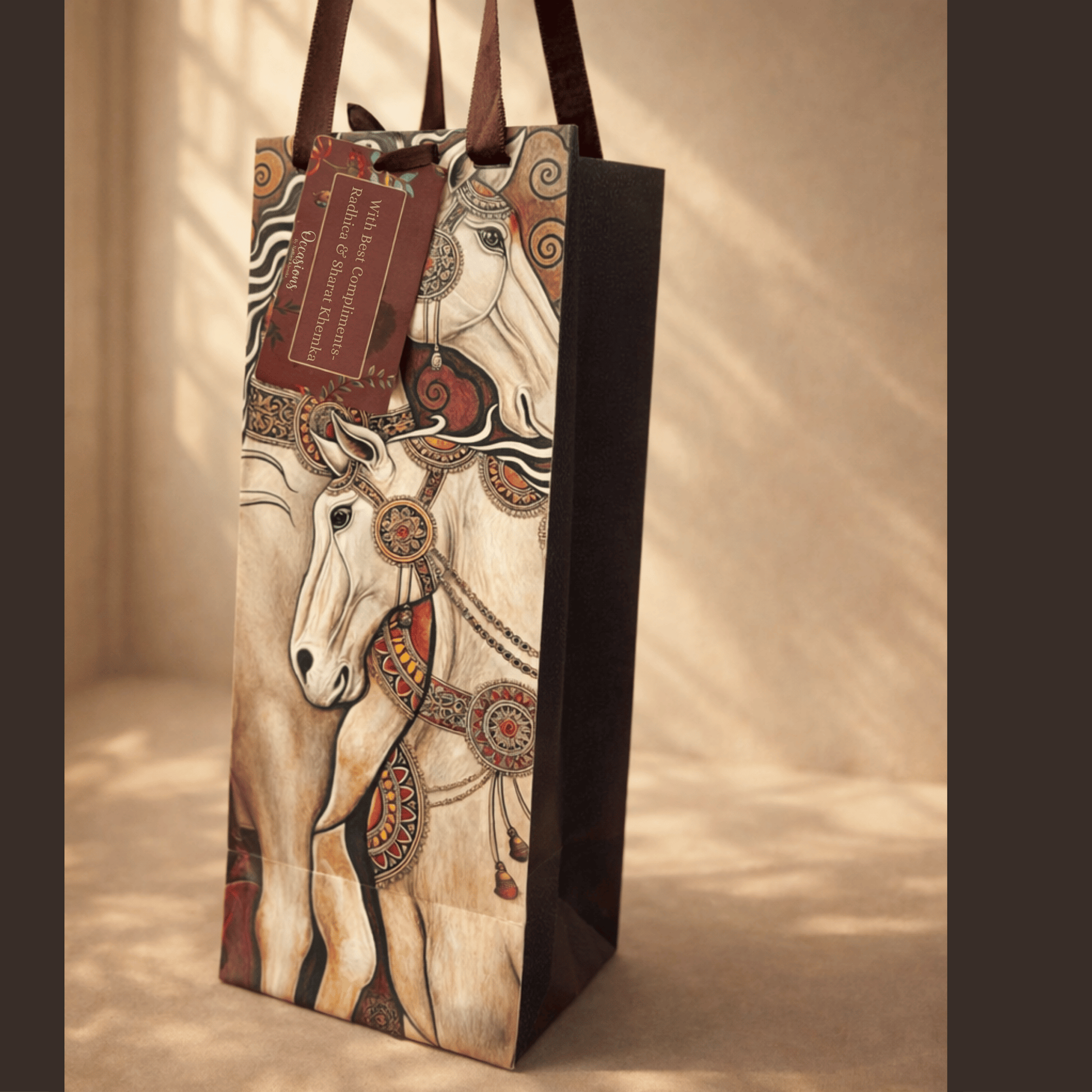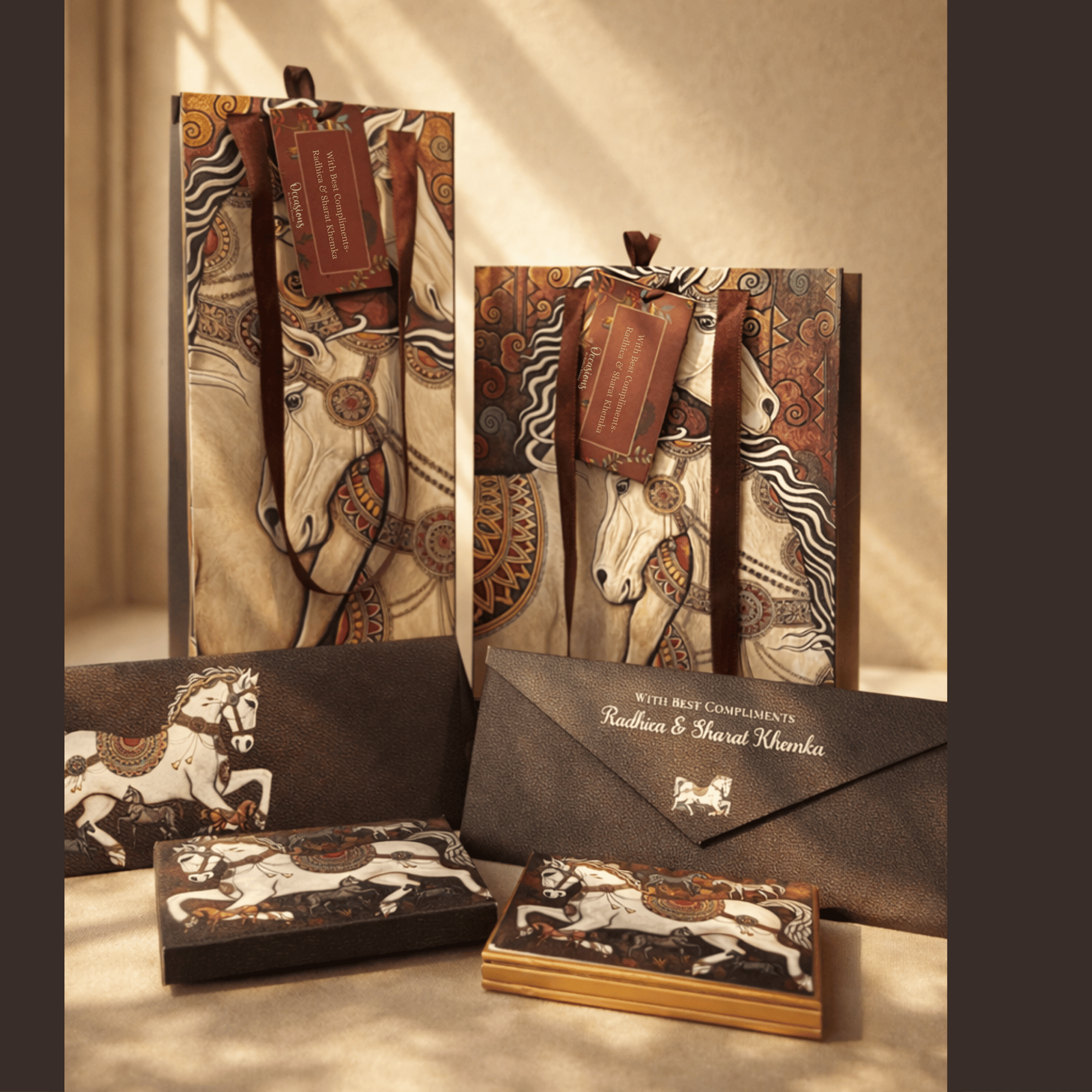 This comprehensive luxury gift set features a coordinated suite of premium items, including high-end 10 personalized envelopes, 5 gift bags, 5 bottle bags, 5 note cards, 5 gift tags and 1 ginni case. Each piece showcases a sophisticated Indian miniature painting of a majestic white horse against a rich, textured espresso and gold palette, creating a cohesive and regal aesthetic for all your gifting and correspondence needs.