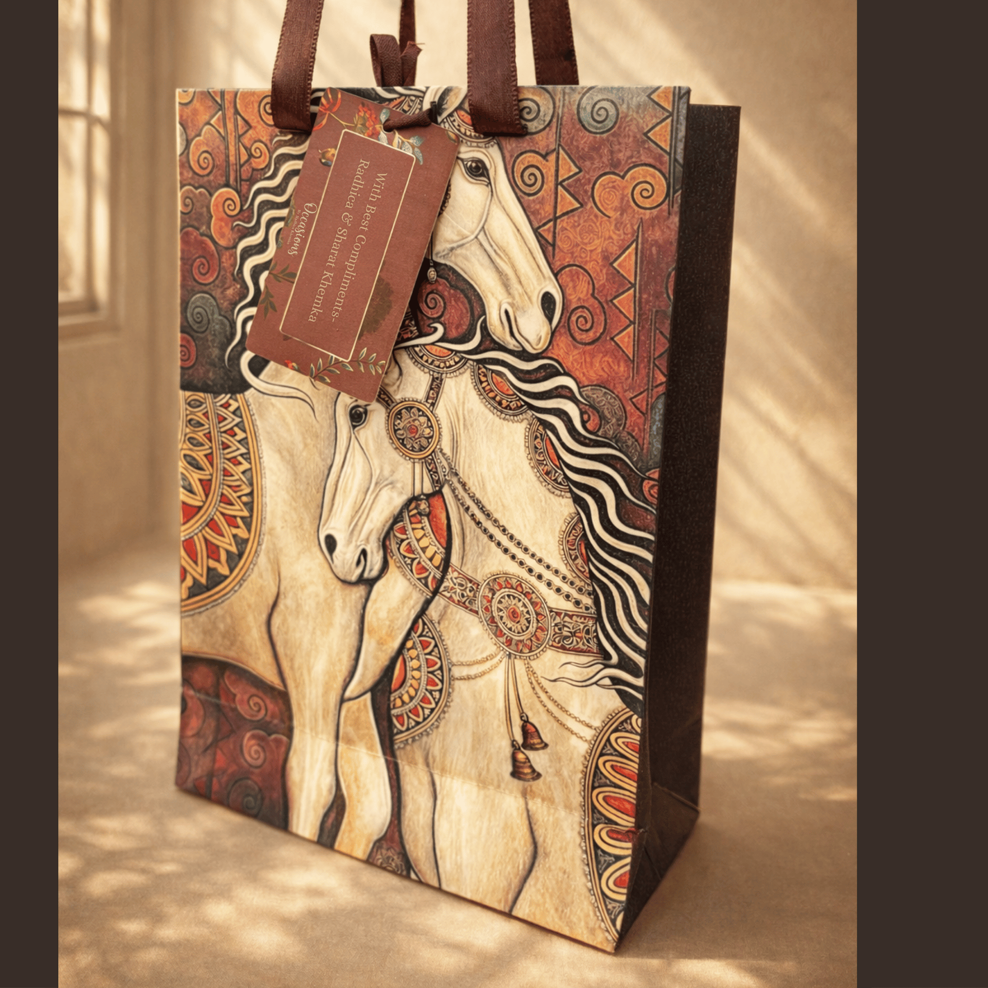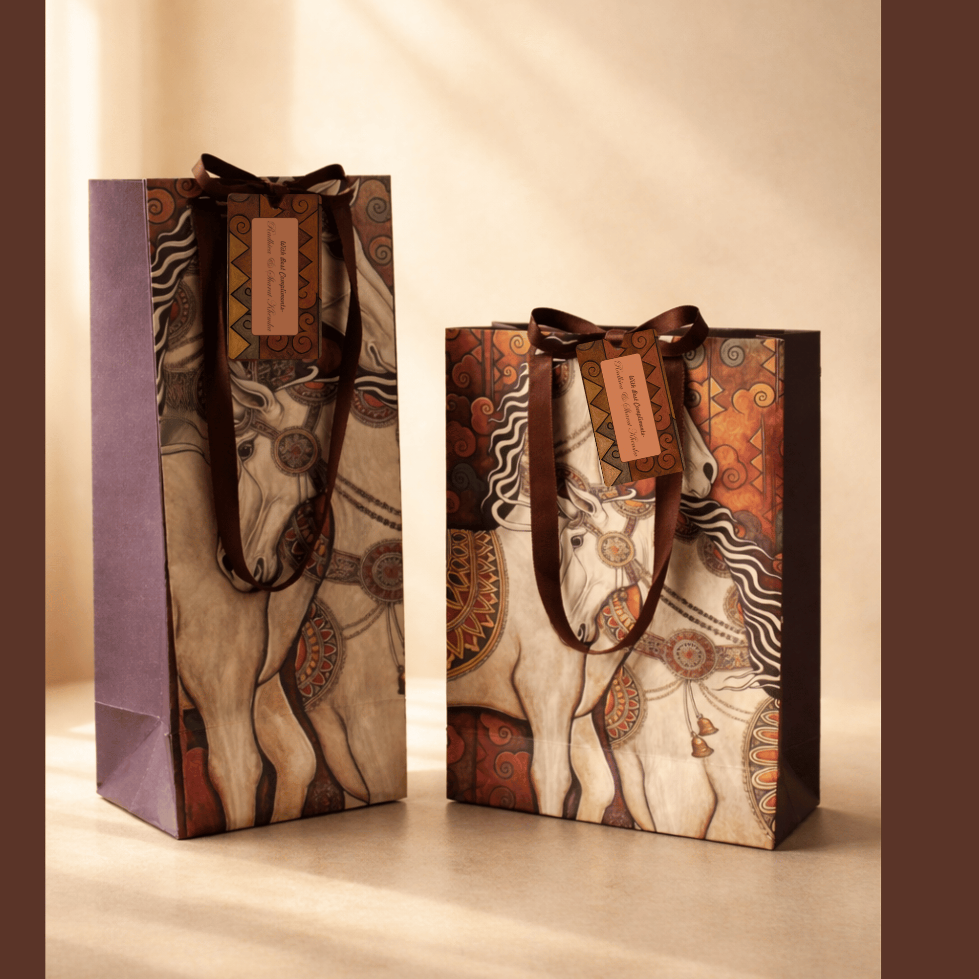 Set of Artistic gift bags showcasing a majestic horse illustration in warm earthy tones, finished with satin ribbon handles—perfect for luxurious, statement-style gifting.