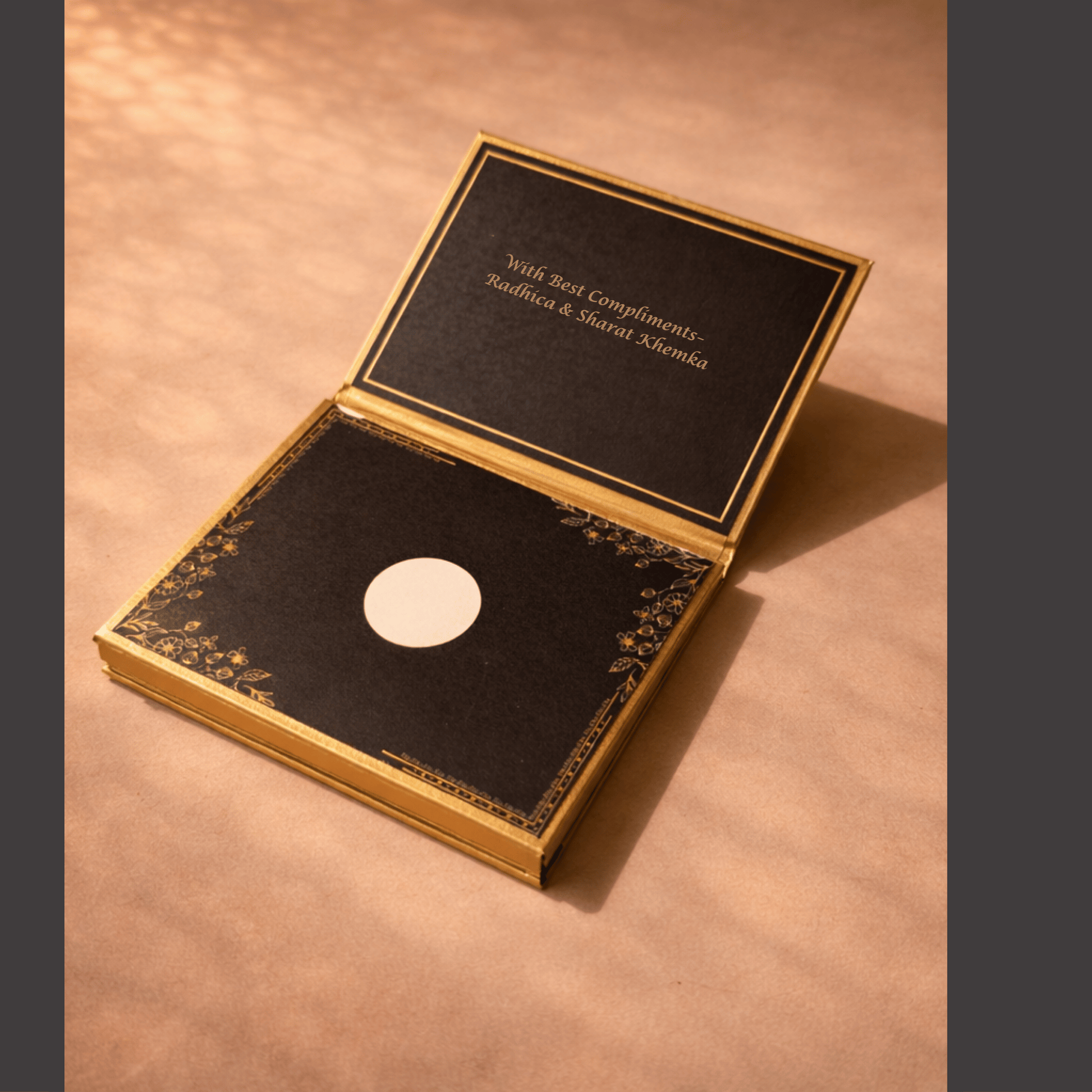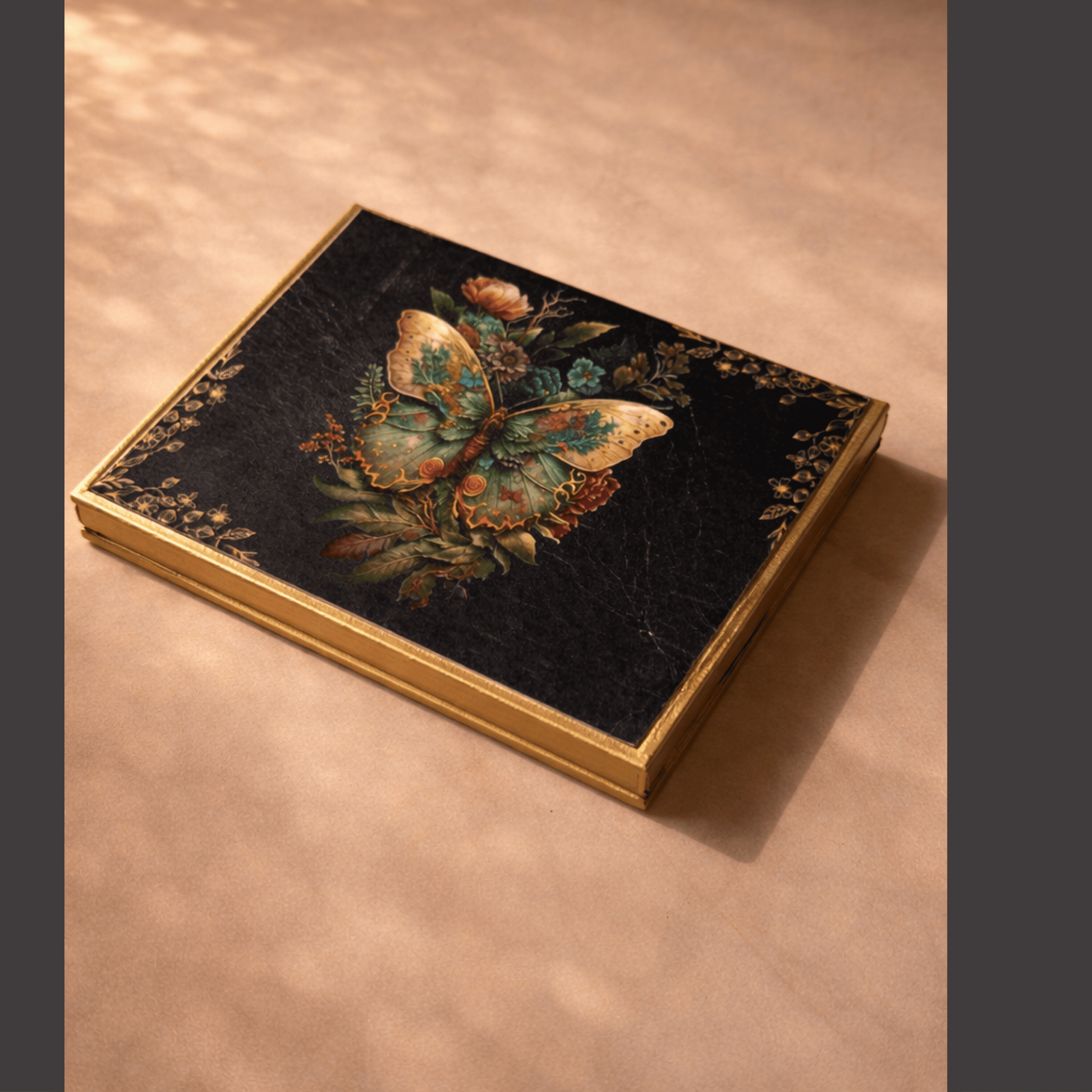This elegant stationery set features a striking, vintage-inspired butterfly illustration set against a textured, dark slate backdrop. Accented with warm golden color and delicate floral details, the collection—which includes 10 personalized envelopes, 5 gift bags, 5 bottle bags, 5 note cards, 5 gift tags and 1 ginni case—exudes a sense of refined luxury and timeless charm.