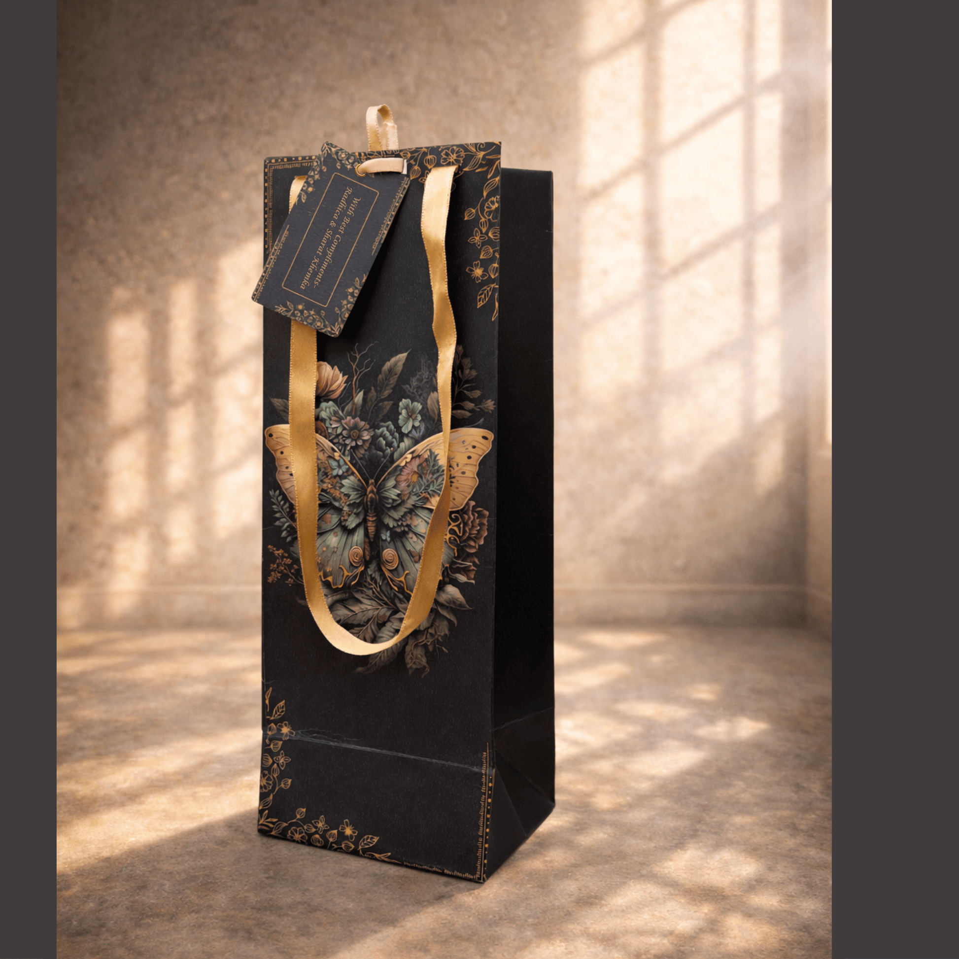 This slim, sophisticated bottle bag features a tall, structured silhouette adorned with a vintage-inspired butterfly and floral motif against a rich, dark textured background. Complete with elegant gold ribbon handles and a matching personalized gift tag, it offers a luxurious and artistic presentation for gifting fine wine or spirits.