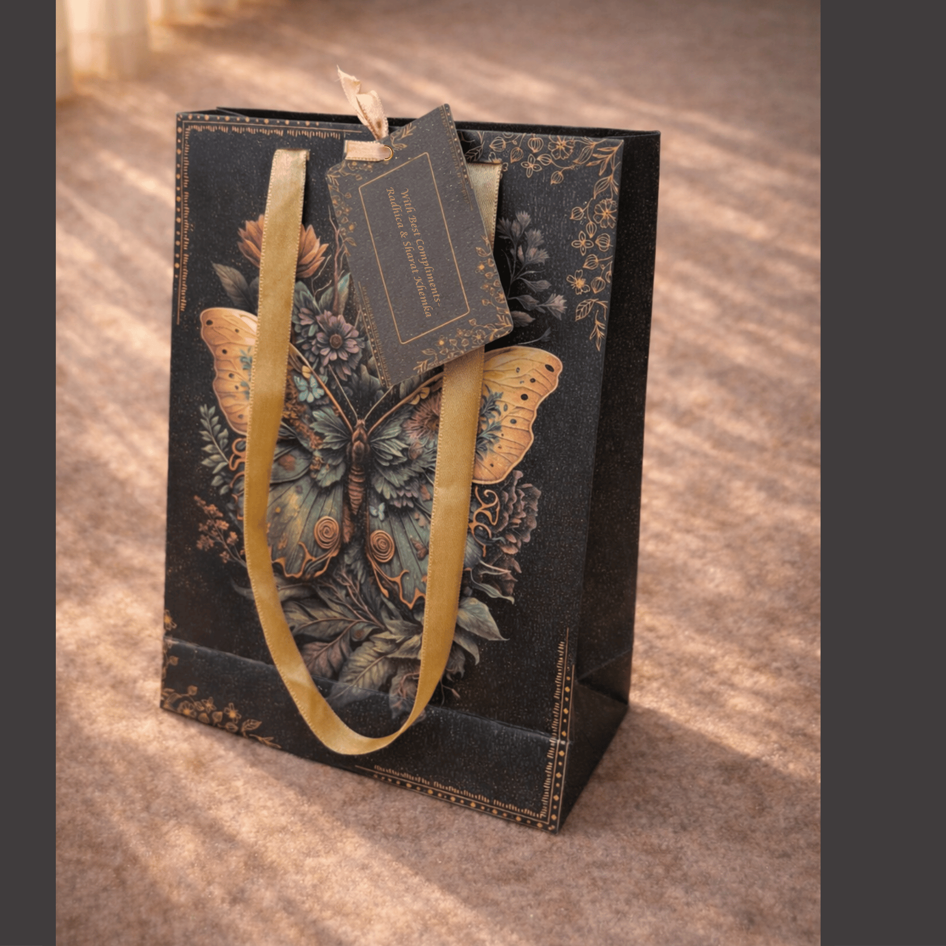 These luxurious gift bags feature a detailed, vintage-style butterfly and floral illustration printed on a premium, charcoal-textured base. Complete with elegant satin gold handles and a matching personalized gift tag, they provide a sophisticated and artistic touch for high-end gifting.