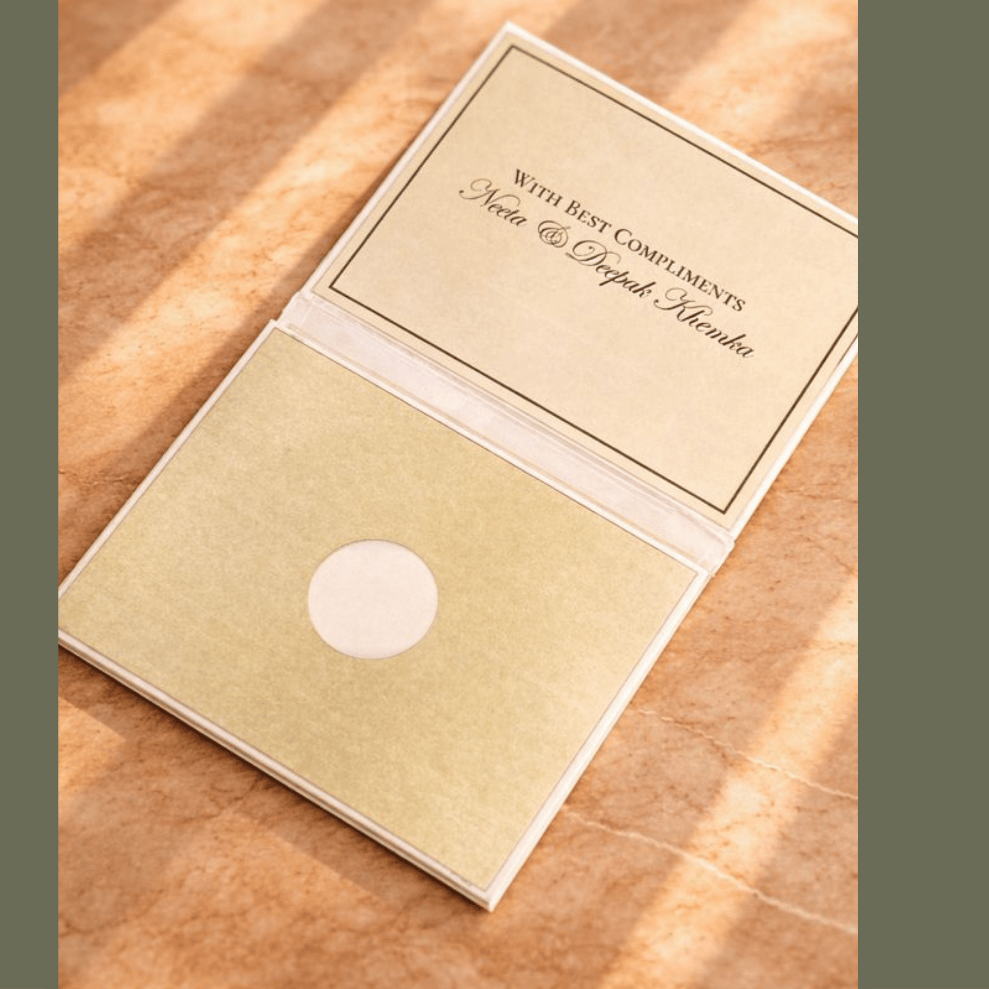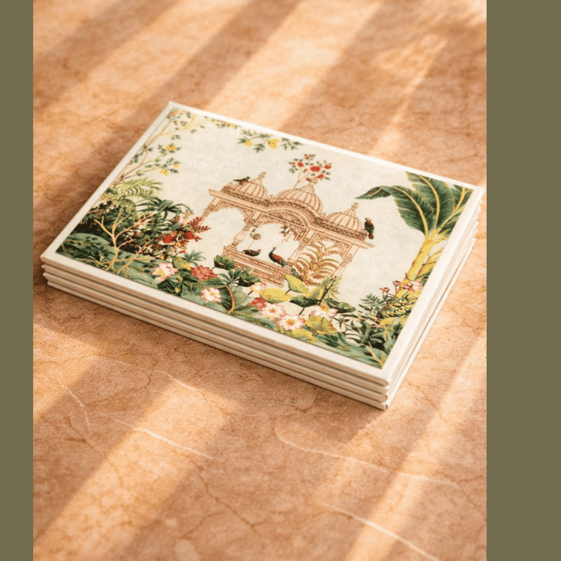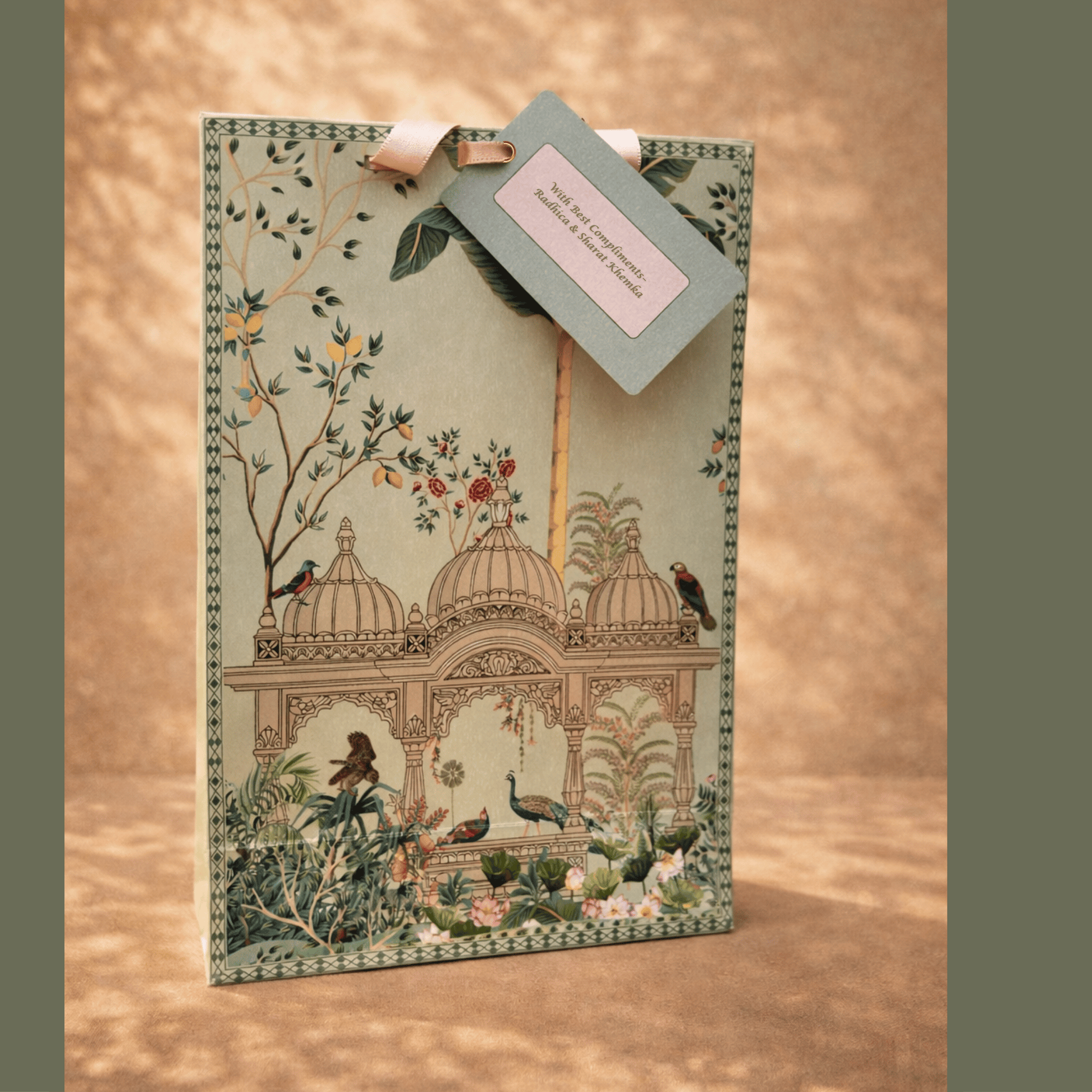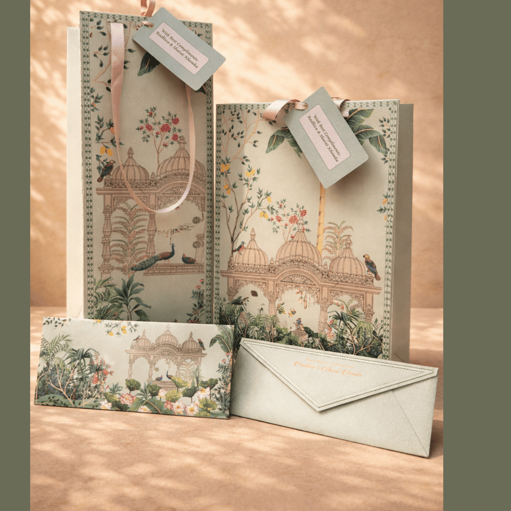 This luxury collection features a serene sage green palette illustrating a grand arched pavilion set amidst a lush tropical garden. The set includes a 10 personalized envelopes, 5 gift bags, 5 bottle bags, 5 note cards, 5 gift tags and 1 ginni case.
