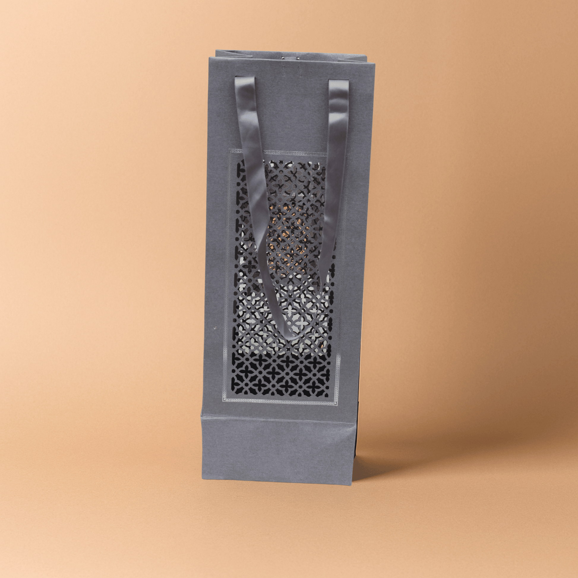 Sophisticated wine gift bag in deep grey with an intricate laser-cut pattern and sleek satin handles—perfect for elegant gifting.