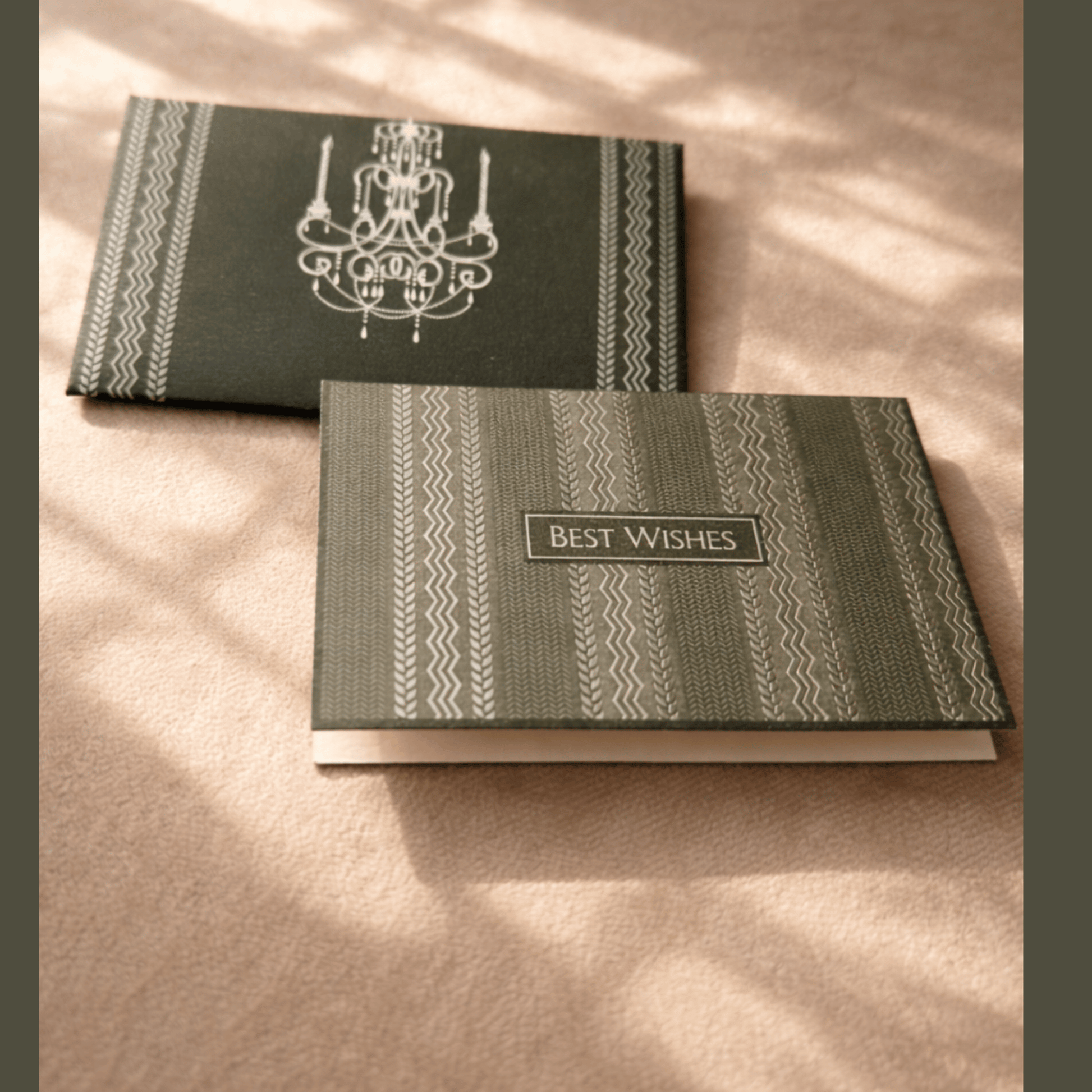 Sophisticated olive-toned notecards with subtle patterns—perfect for elegant wishes and formal notes.
