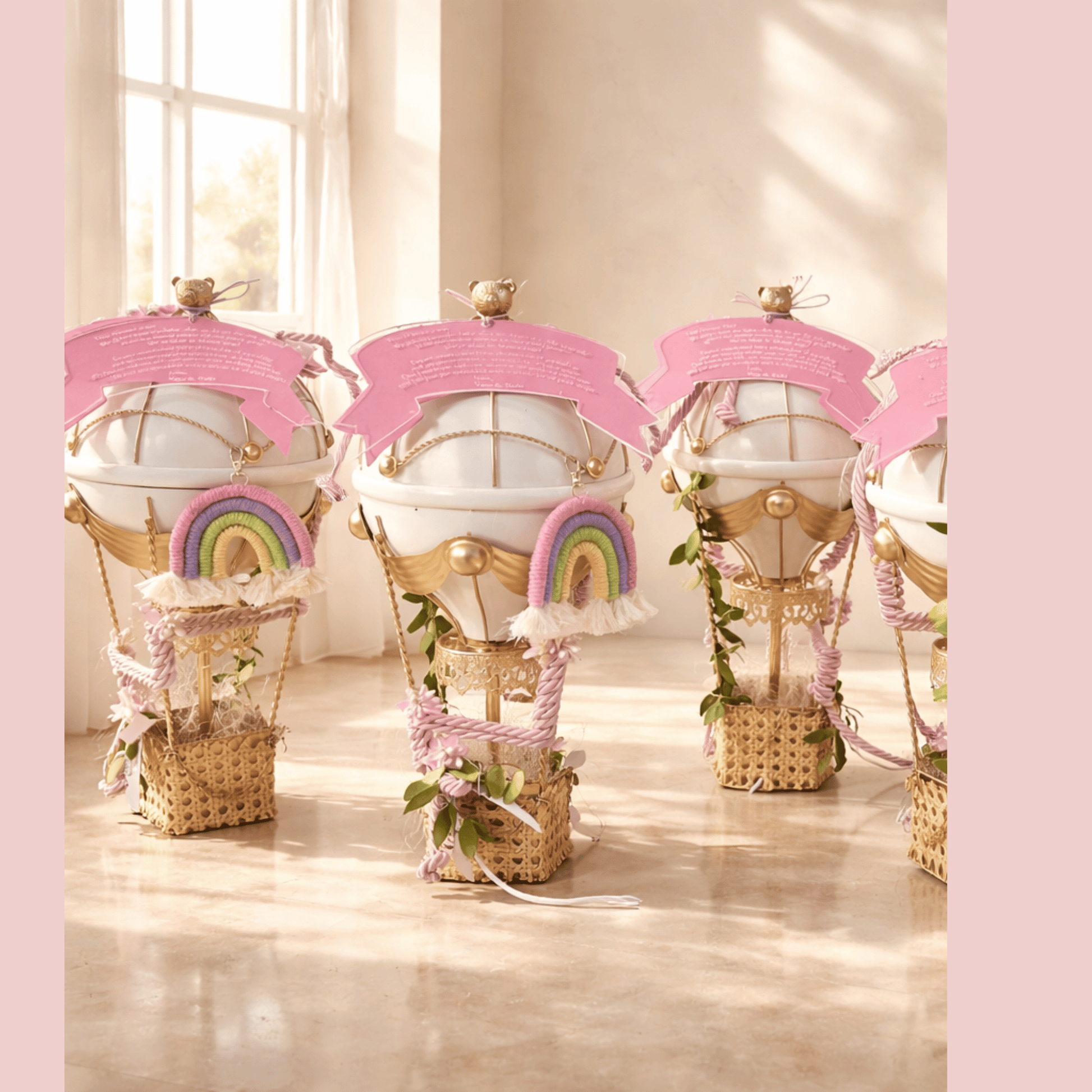 Celebrate the arrival of our little bundle of joy with this whimsical hot air balloon-themed baby girl announcement! Topped with a pink parachute-style banner and adorned with pastel rainbows and delicate greenery, each handcrafted piece carries the joyous message of her arrival into the world. A dreamy way to share our precious news with loved ones—because she’s already lifting hearts sky-high!