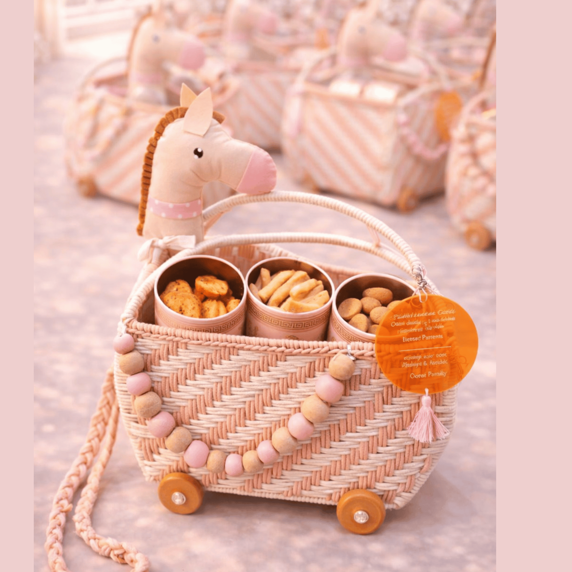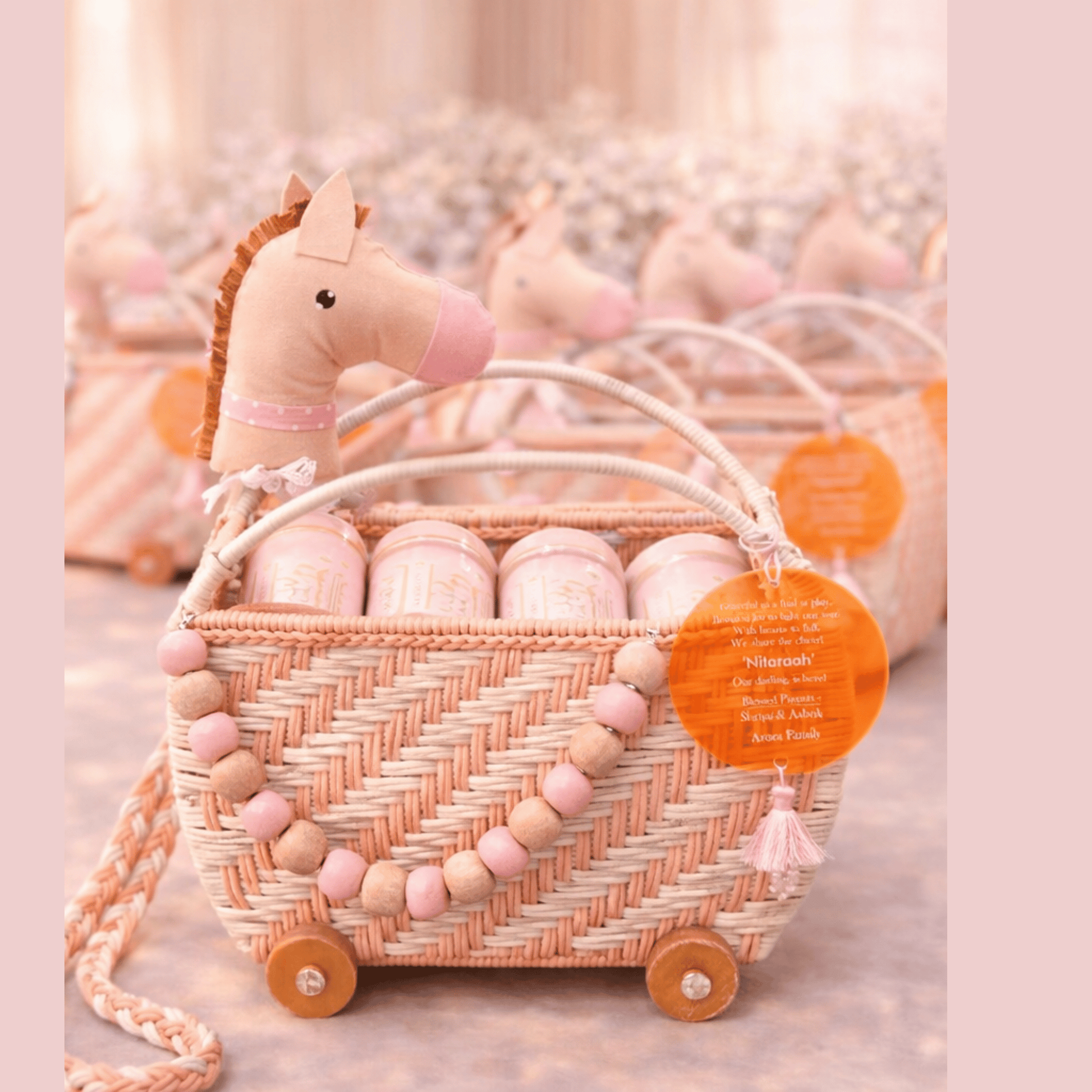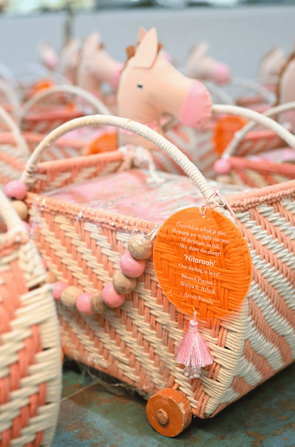 This adorable baby girl announcement features a handcrafted pink and cream woven wagon adorned with wooden wheels and pink bead garlands. Topped with a soft horse head and filled with sweet goodies, each wagon includes a personalized tag announcing the arrival of Baby Girl. A charming and thoughtful keepsake that beautifully celebrates the joy of a new little girl!