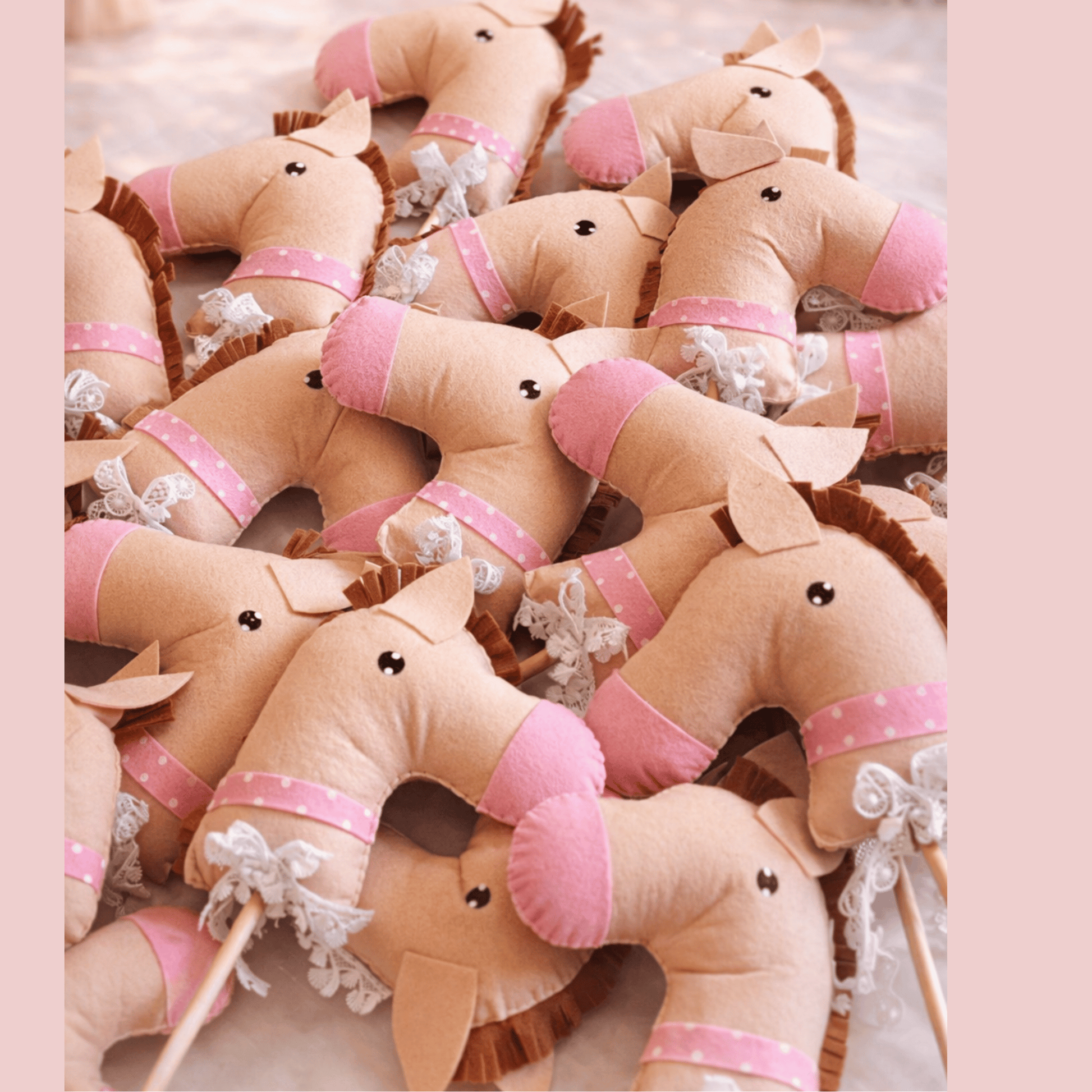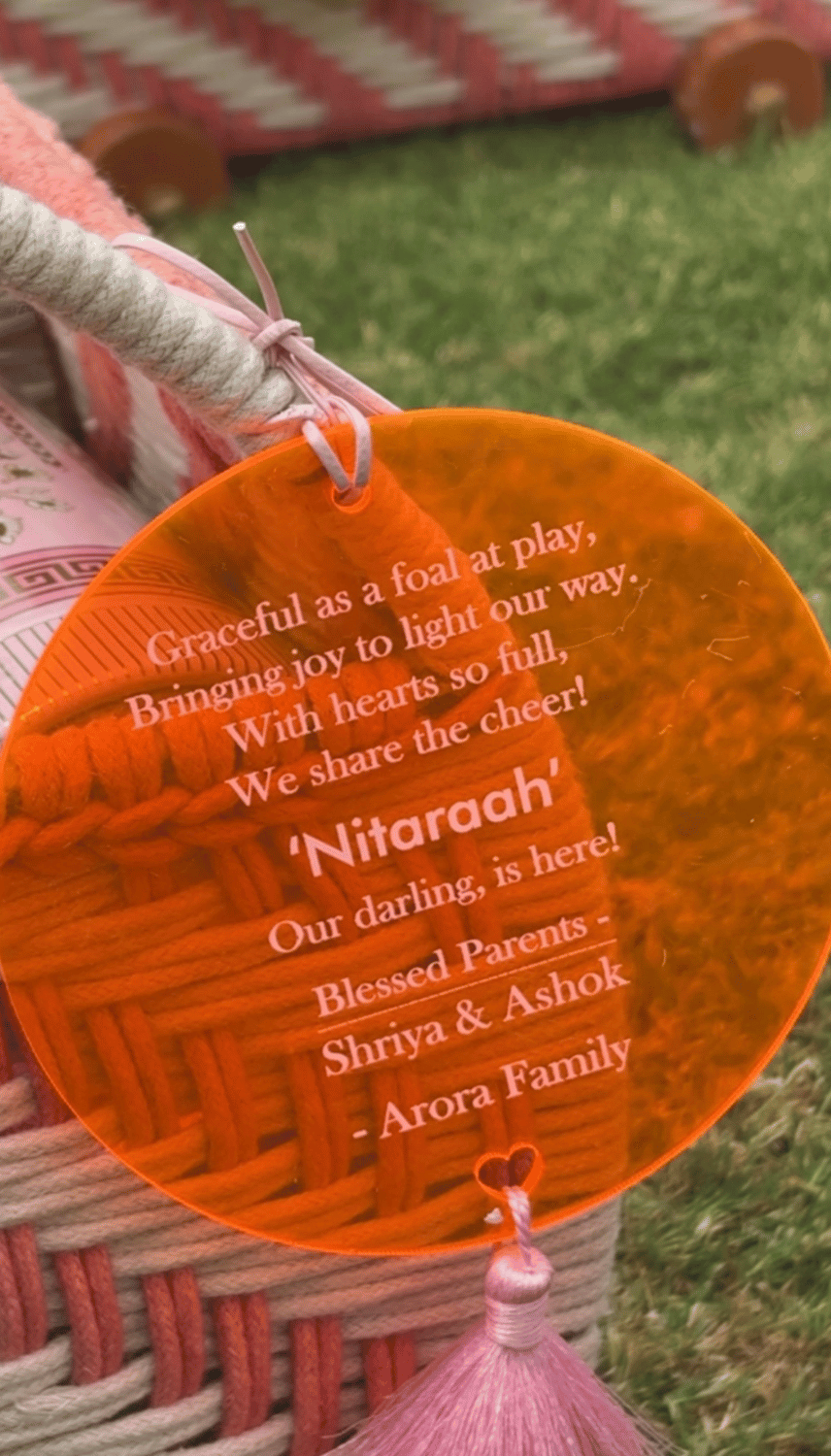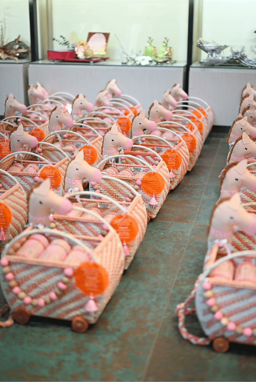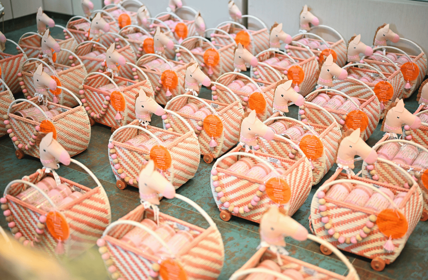 This adorable baby girl announcement features a handcrafted pink and cream woven wagon adorned with wooden wheels and pink bead garlands. Topped with a soft horse head and filled with sweet goodies, each wagon includes a personalized tag announcing the arrival of Baby Girl. A charming and thoughtful keepsake that beautifully celebrates the joy of a new little girl!