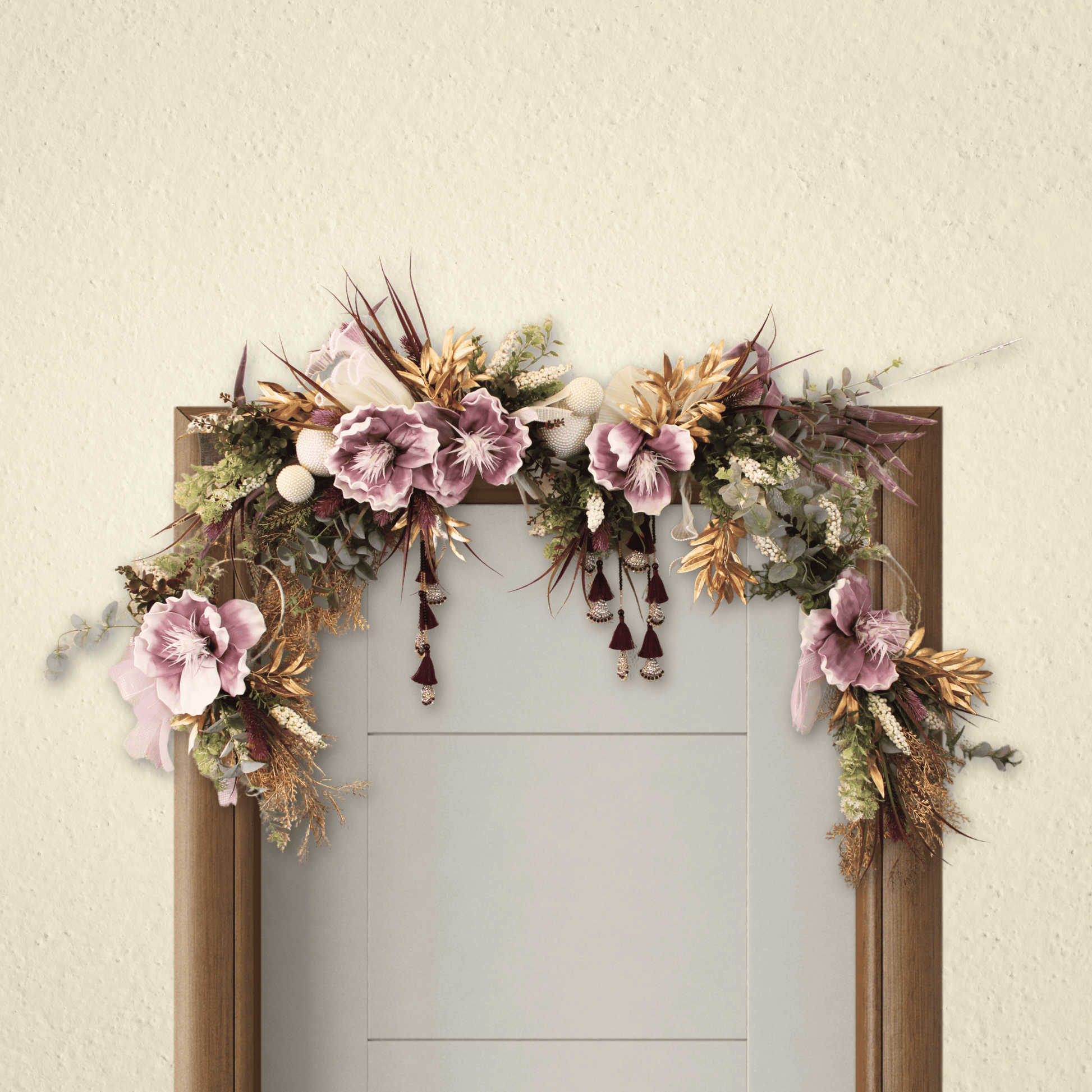 A luxurious blend of mauve flowers, golden leaves, and pearl accents, this bandhanwar adds a touch of elegance to festive entrances.