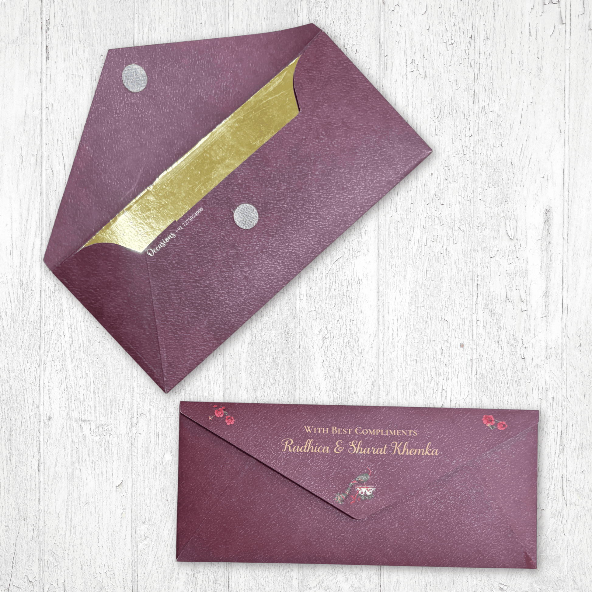 A rich maroon money envelope adorned with a majestic peacock, floral motifs, and intricate traditional elements—perfect for weddings or festive gifting.