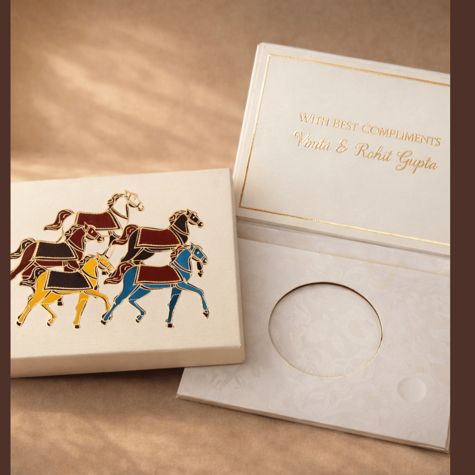 This elegant Ginni case features a vibrant folk-art illustration of galloping horses, a traditional symbol of success and vitality. The design is enclosed in a classic striped border on a cream base, offering a regal and secure way to present gold coins or precious keepsakes.