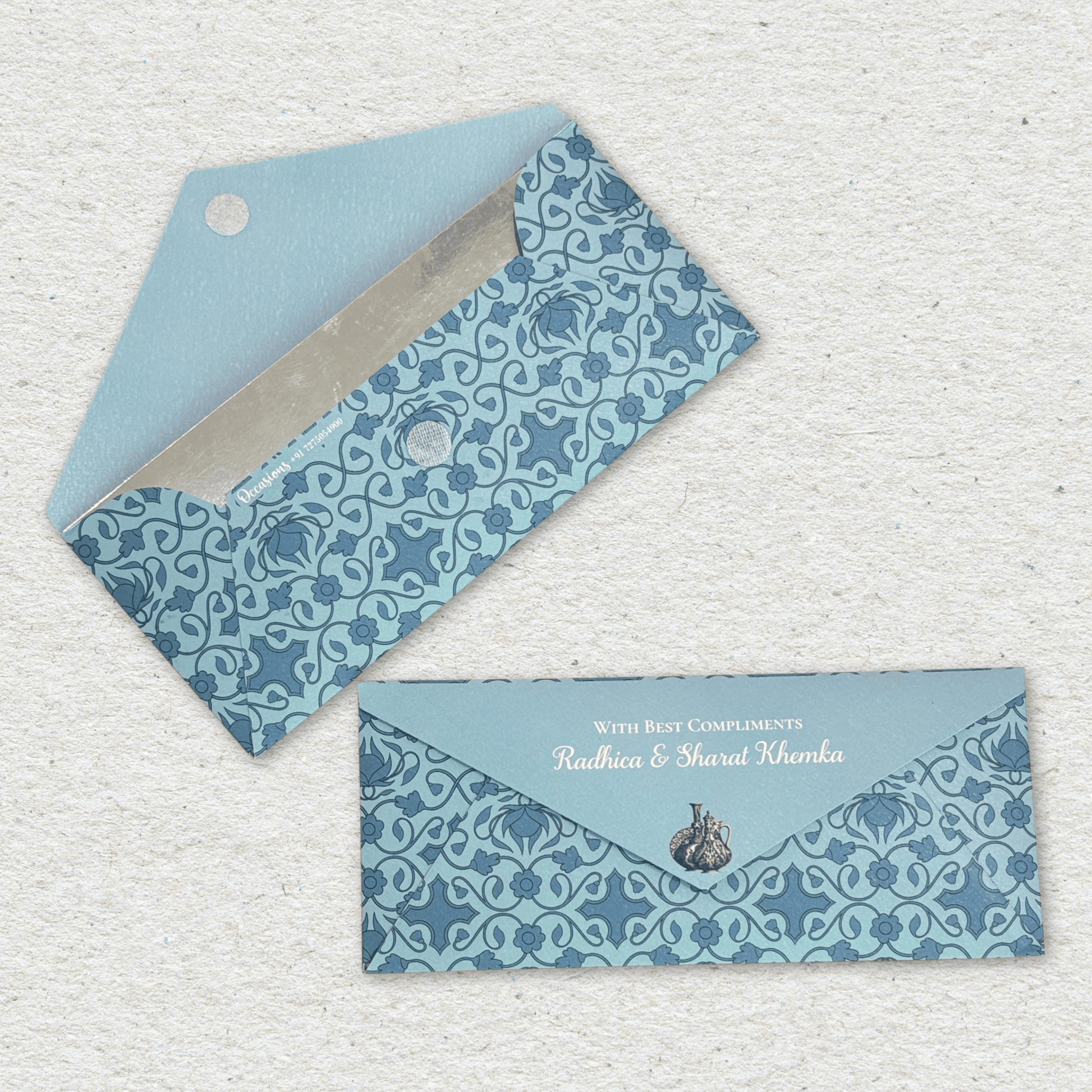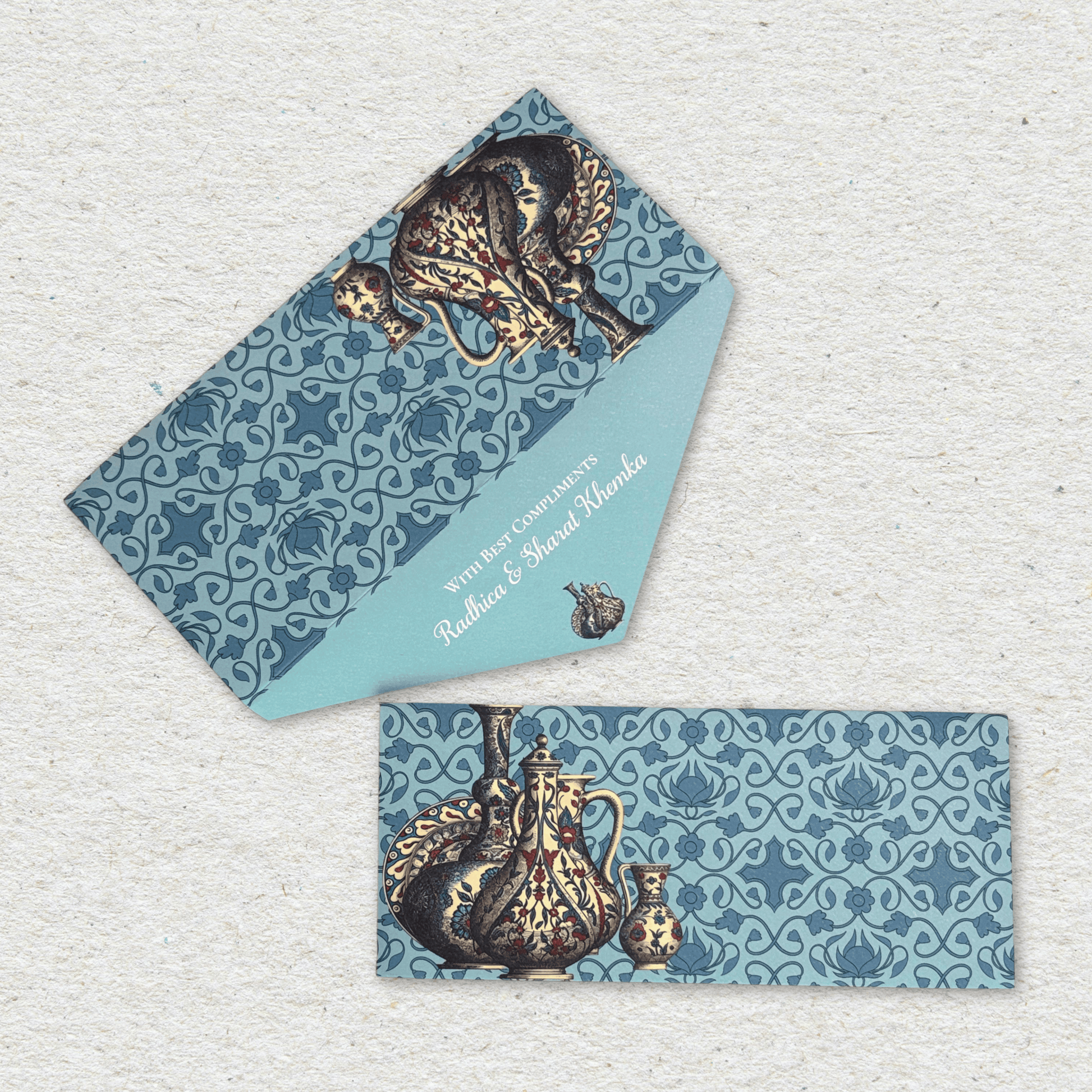 A luxurious blue envelope featuring ornate vintage pitchers—perfect for regal and memorable gifting.