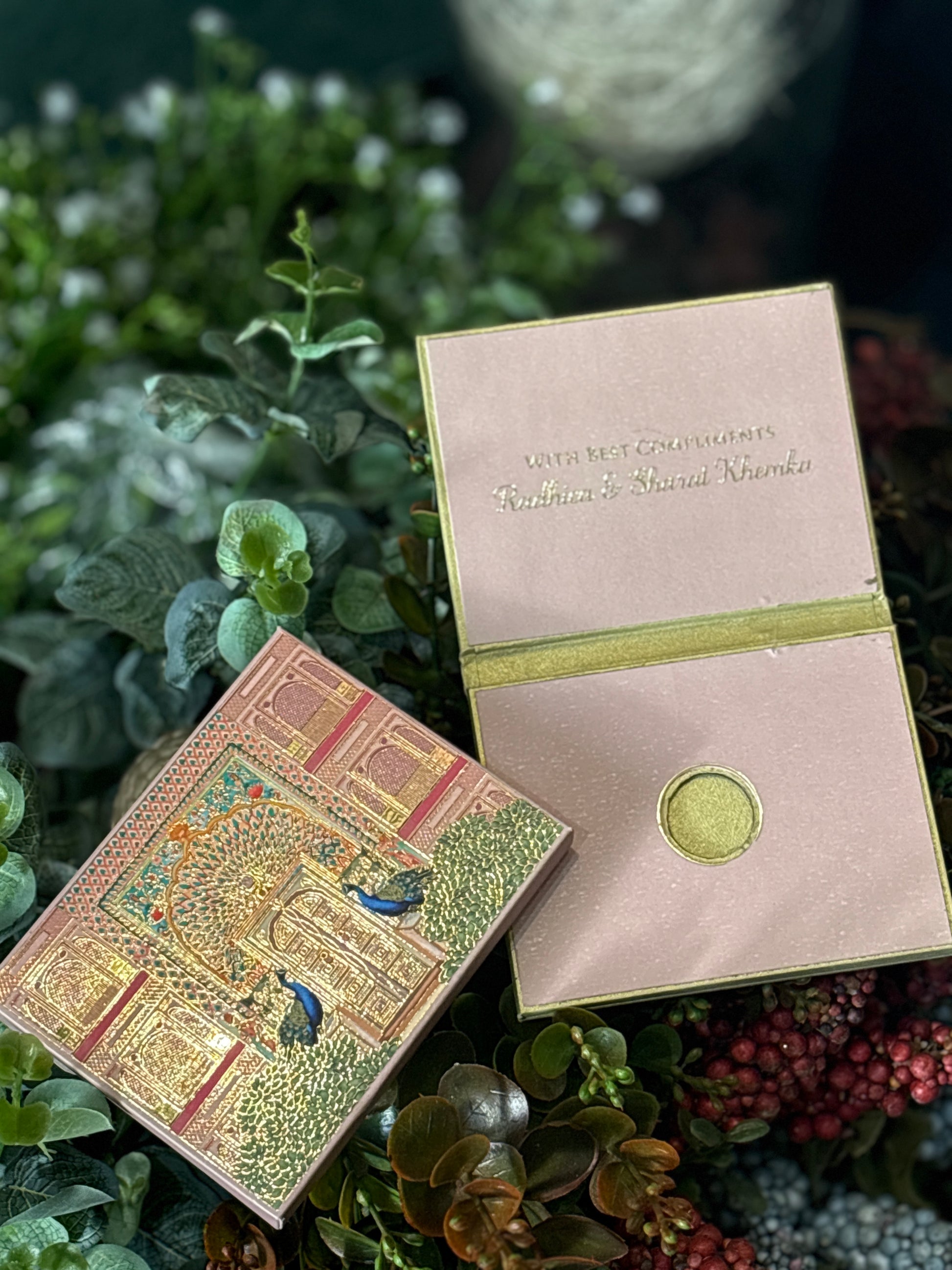 A pastel pink ginni case adorned with majestic peacocks and intricate palace doorway artwork—perfect for a regal presentation of blessings.
