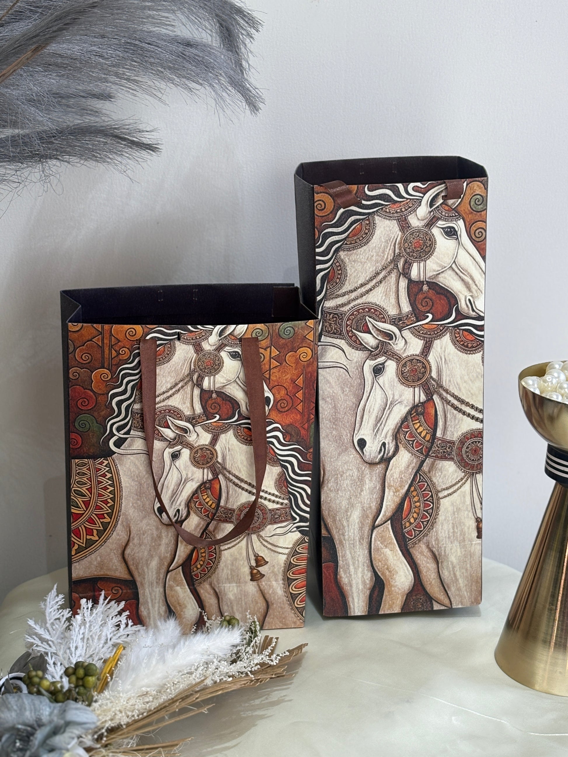 A majestic gift bag set adorned with detailed horse illustrations in earthy tones and ethnic motifs, perfect for regal and artistic gifting.