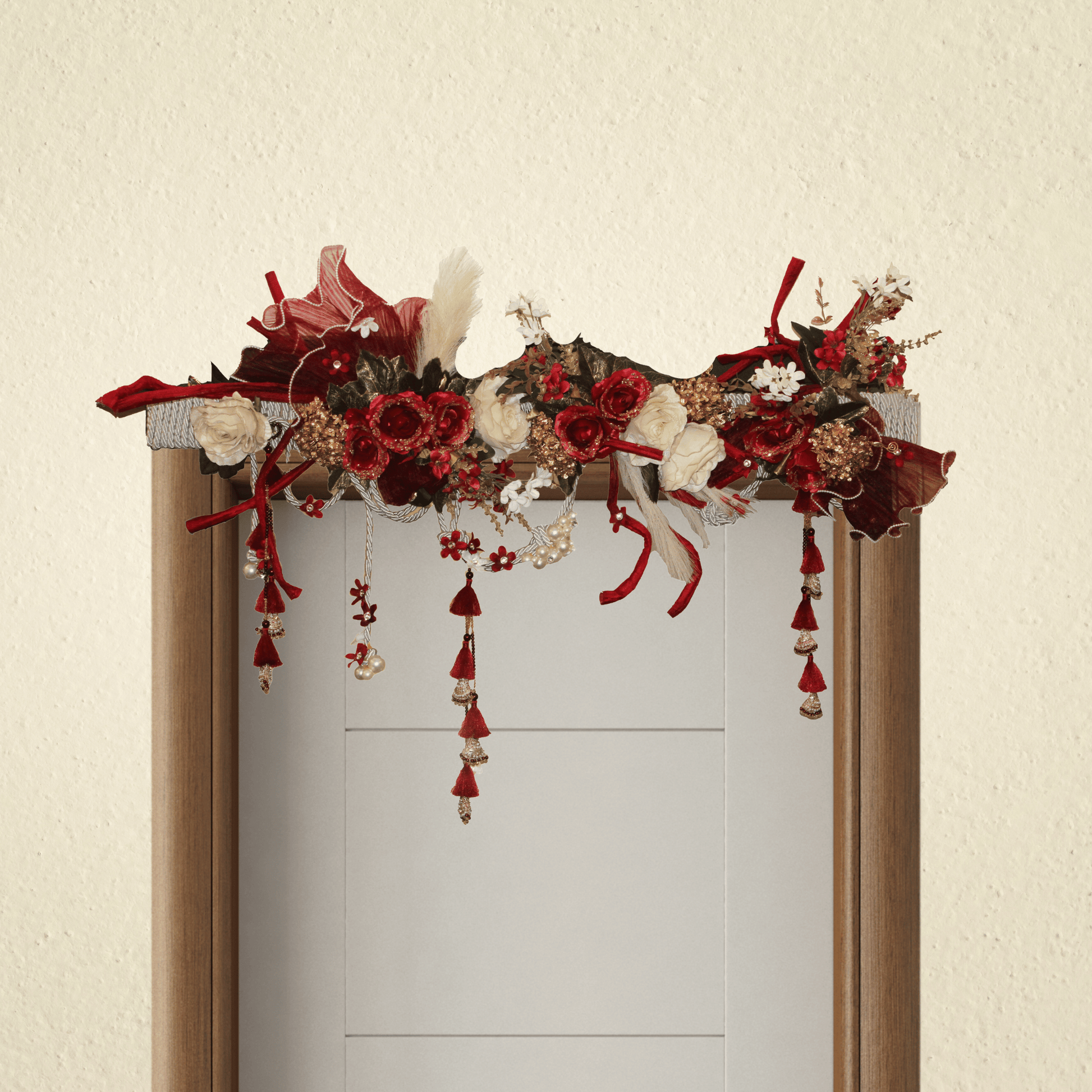 A luxurious bandhanwar featuring deep red and ivory blooms with tassel drops, perfect for grand festive entrances.