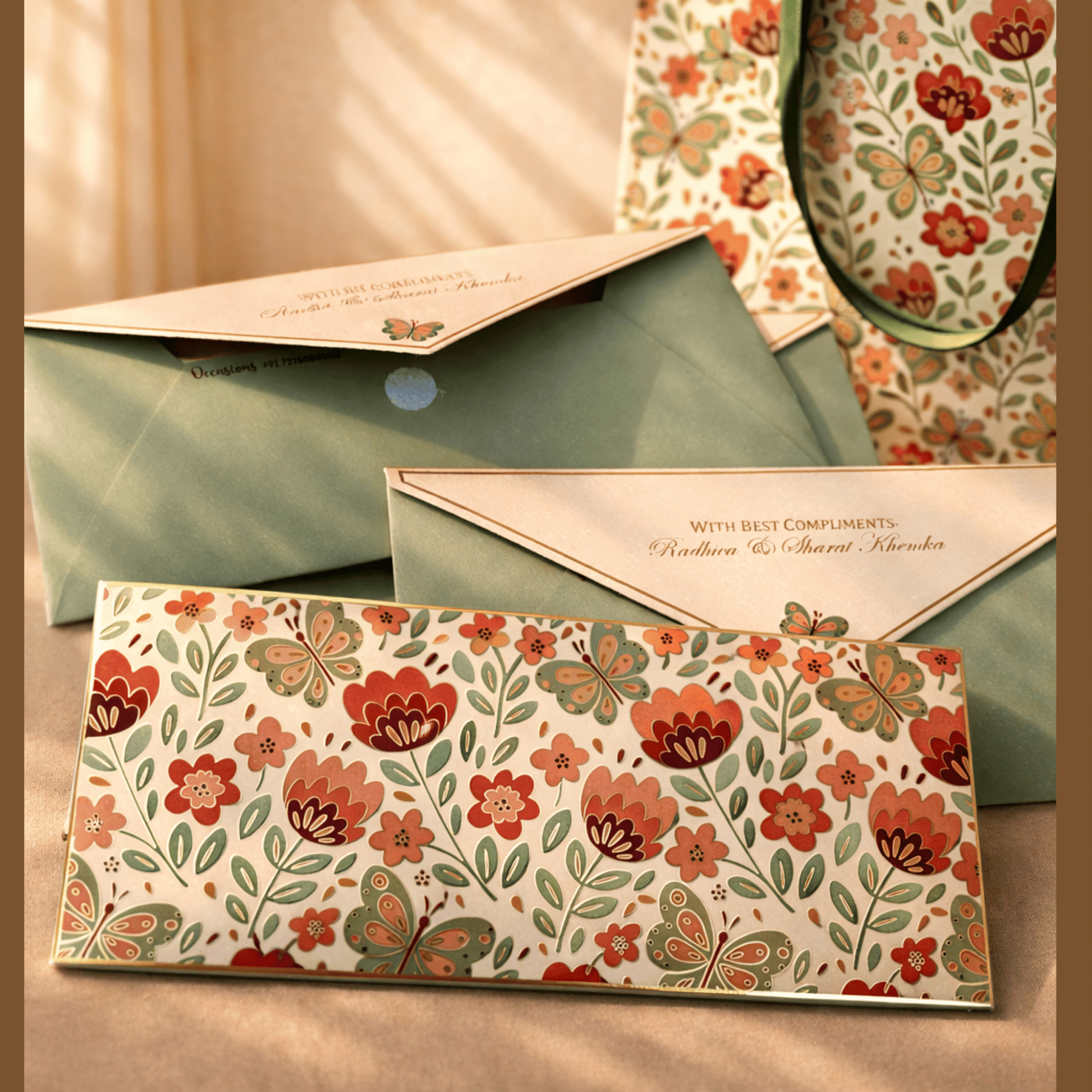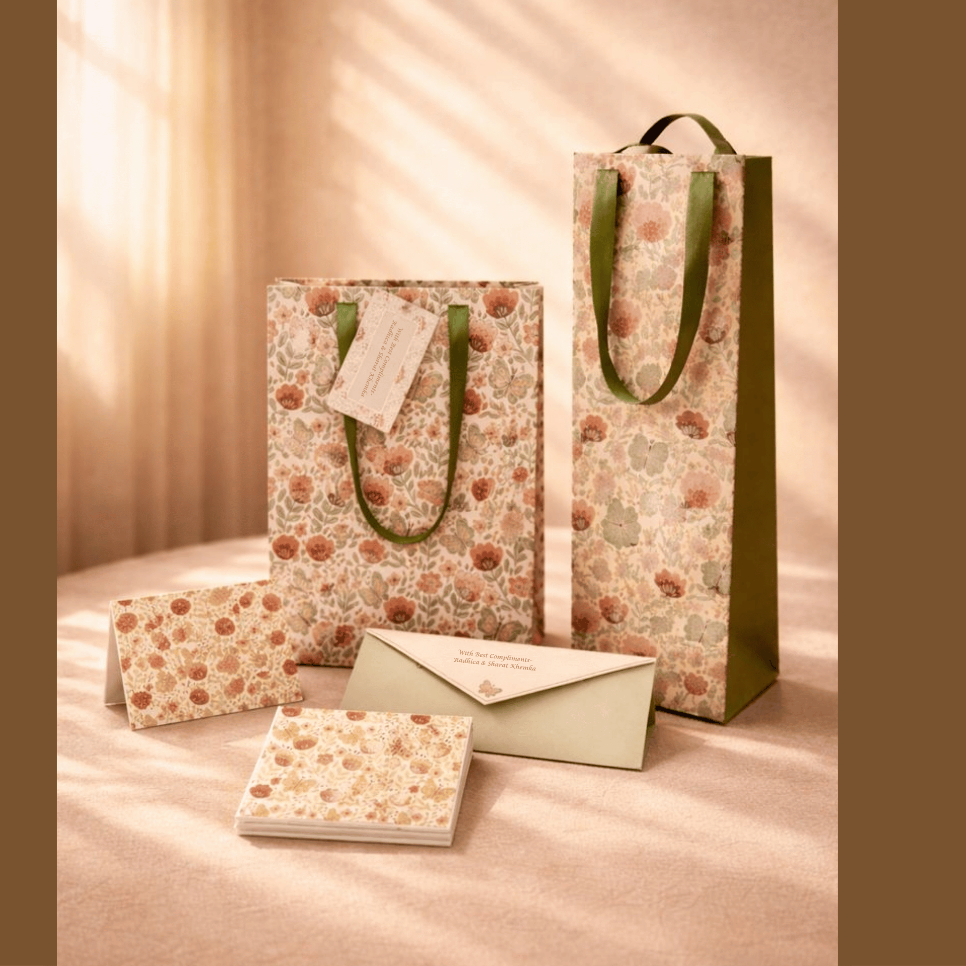 A refined stationery set featuring 10 personalized envelopes, 5 gift bags, 5 bottle bags, 5 note cards, 5 gift tags and 1 ginni case, a delicate floral motif, perfect for tasteful gifting and graceful correspondence.