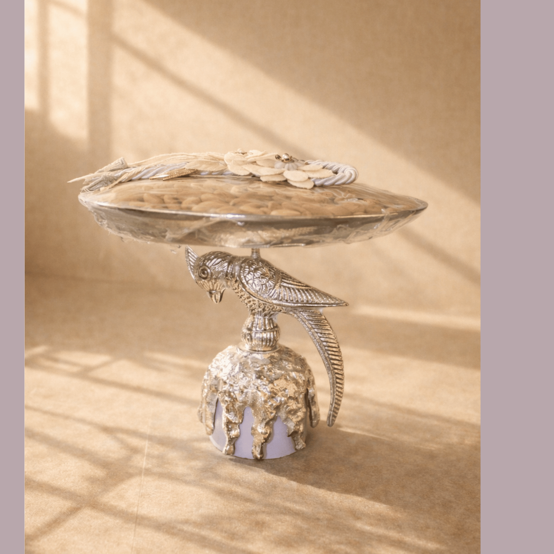 This regal wedding favor features a polished silver-toned platter supported by a detailed parrot figurine pedestal. Perfect for presenting premium nuts or sweets, the arrangement is finished with a delicate cream floral accent and a twisted cord border for a touch of classic charm.