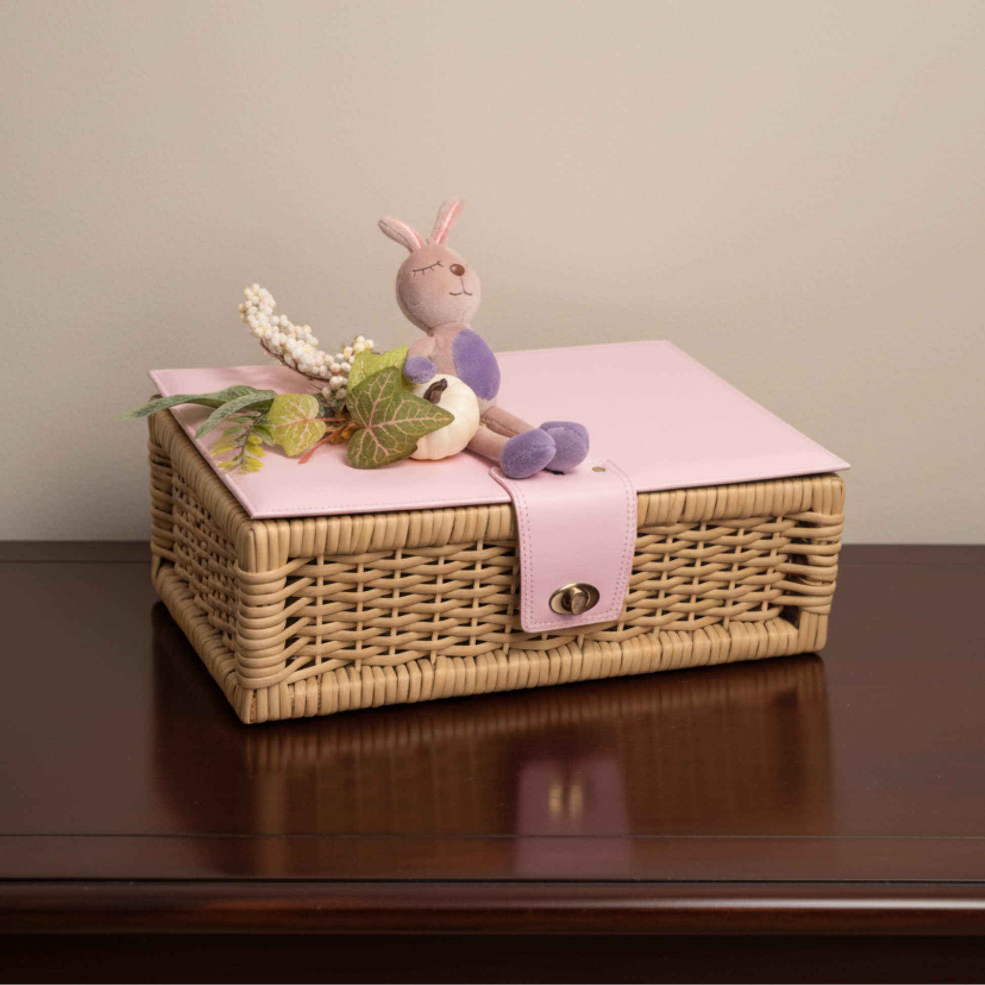 A soft pink folder adorned with a plush pony, delicate florals, and lush greenery rests gently on a wooden table beneath a sun-dappled forest canopy. This serene visual captures the playful charm and gentle beauty of spring, evoking a sense of peace, warmth, and youthful wonder.