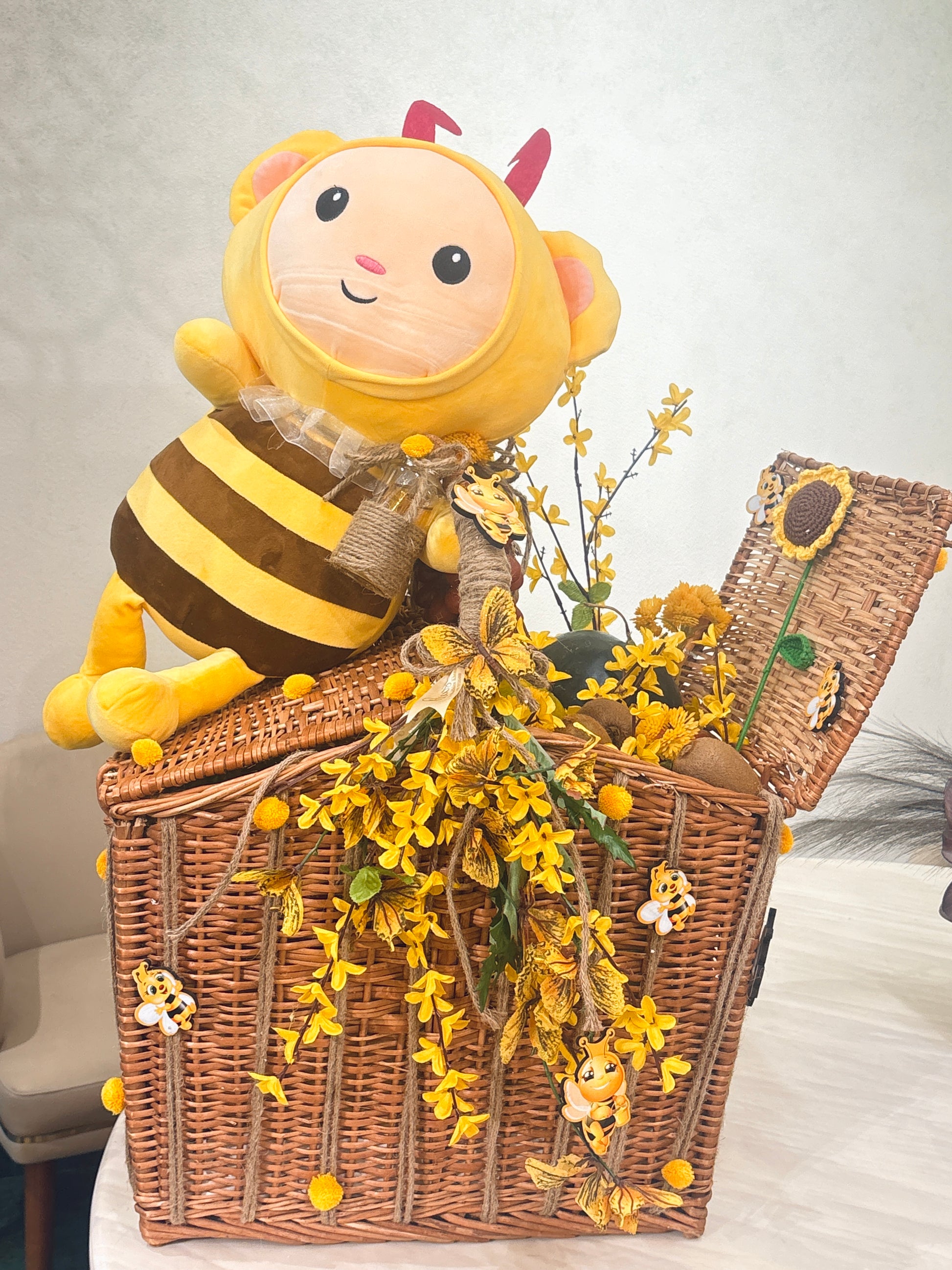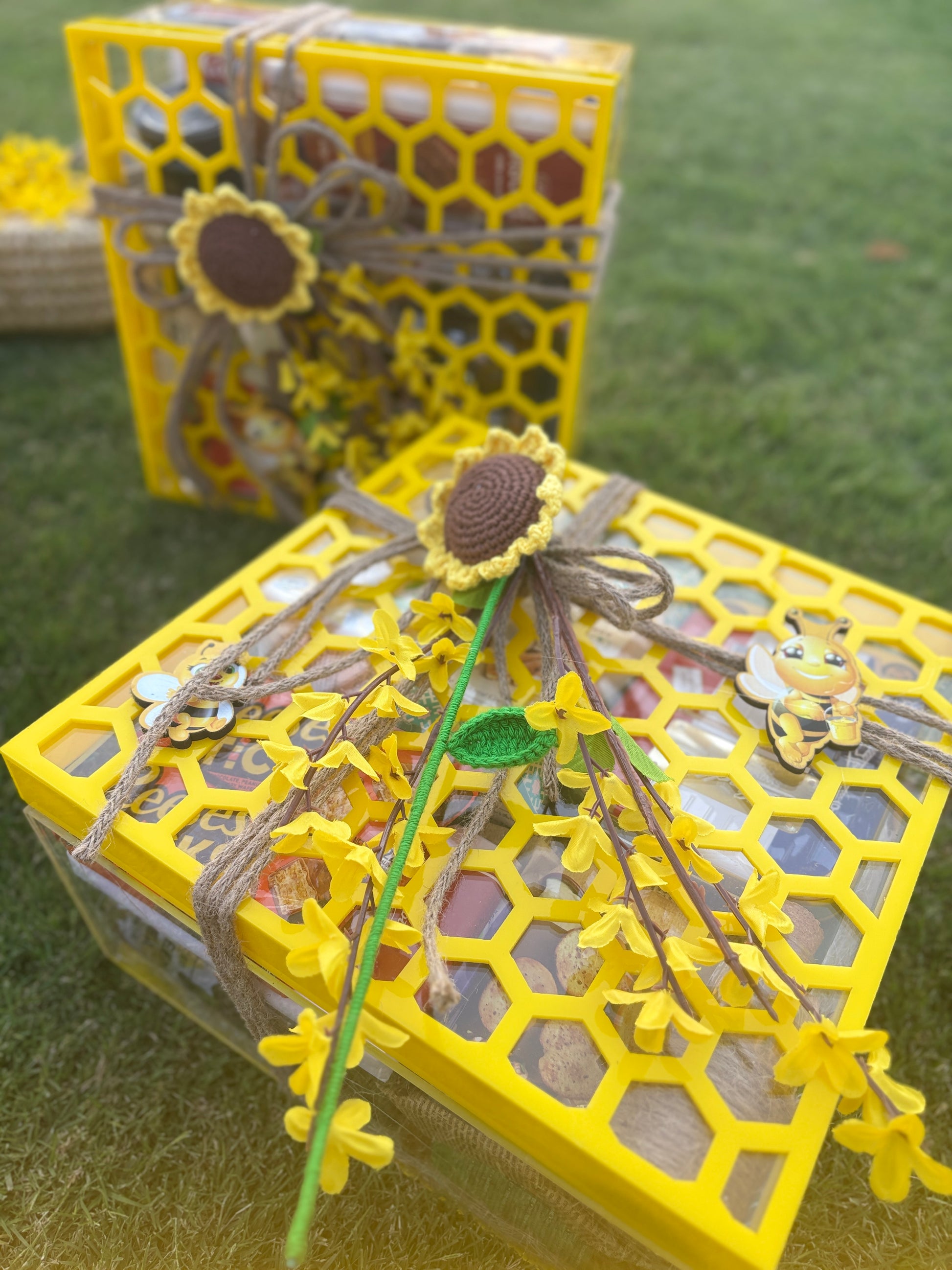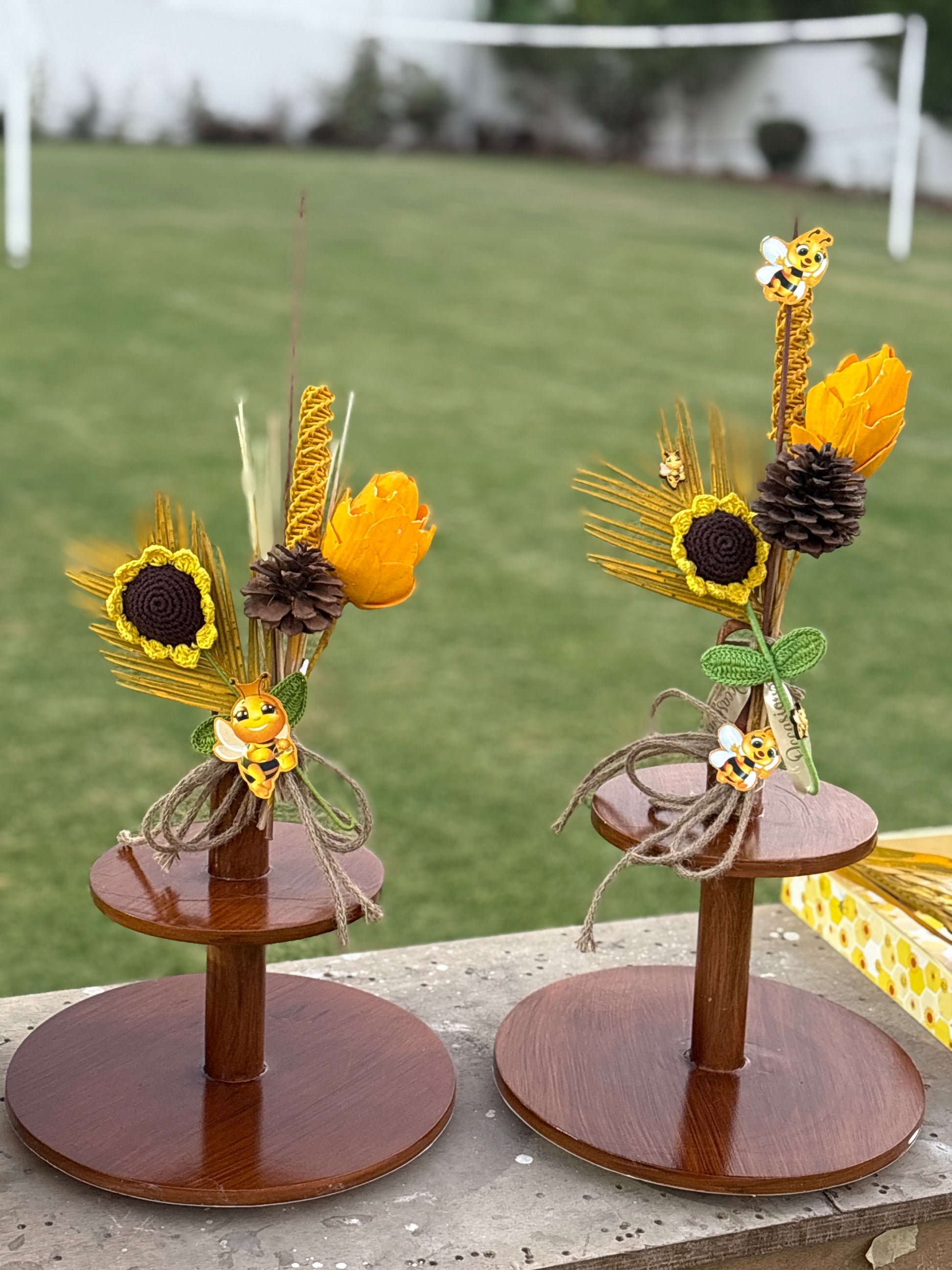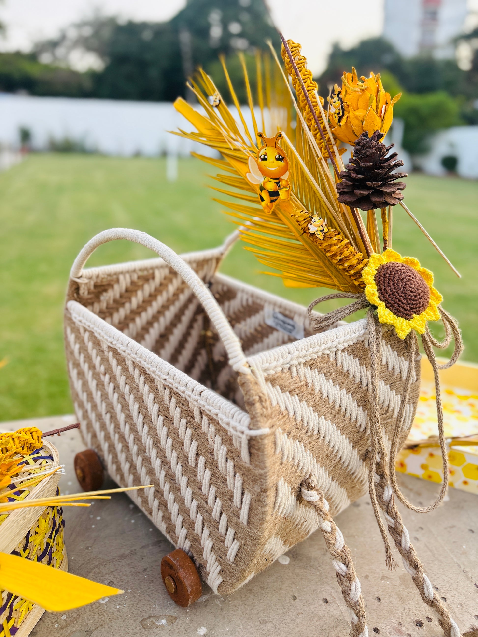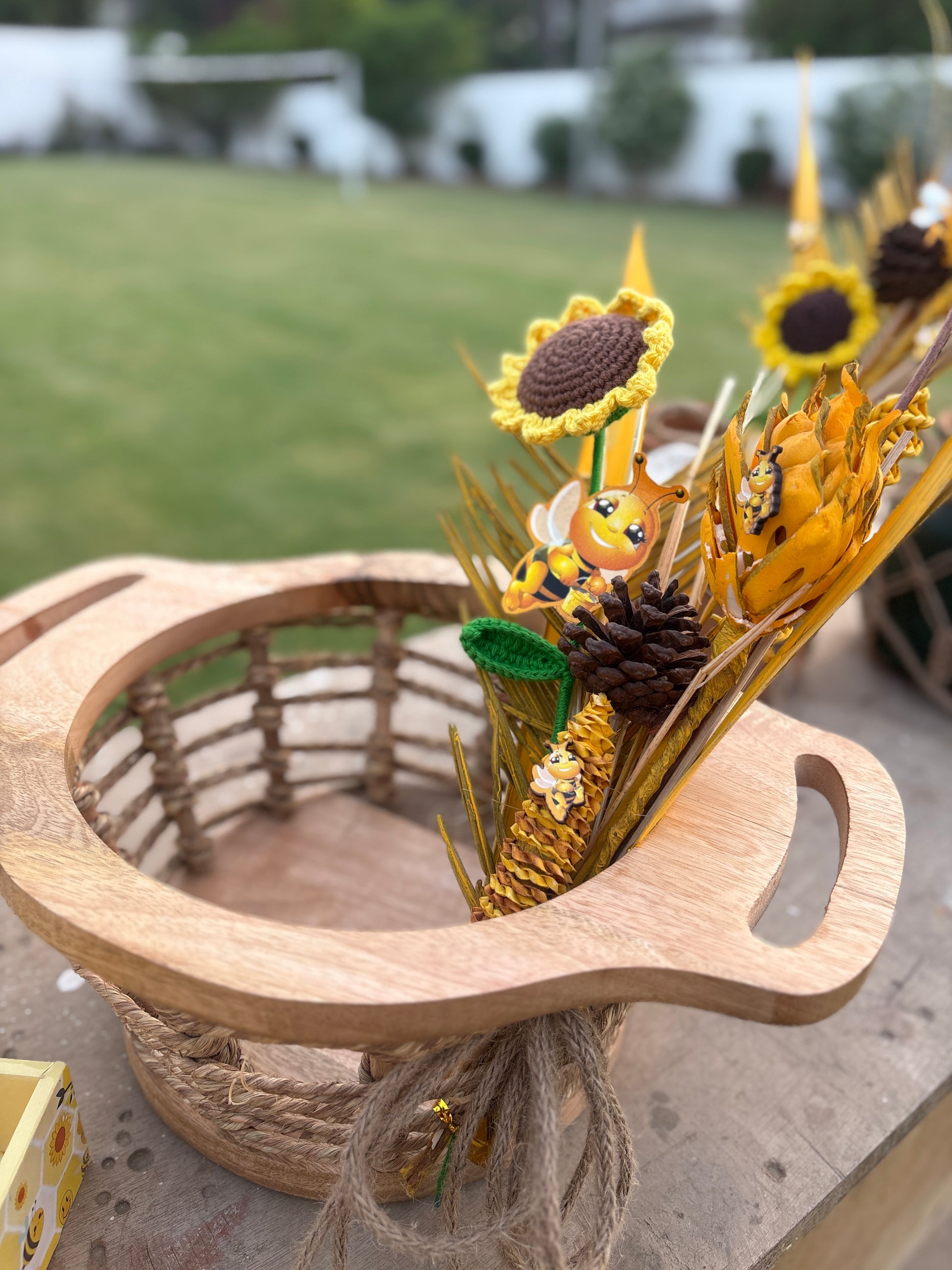 Celebrate your baby shower with this handcrafted bee-themed shower collection, featuring bee themed trays, baskets, and floral decor adorned with cheerful blooms, pinecones, and adorable bee accents. Perfect for announcements, favors, or centerpieces, this charming setup brings sunshine and joy to your special day.