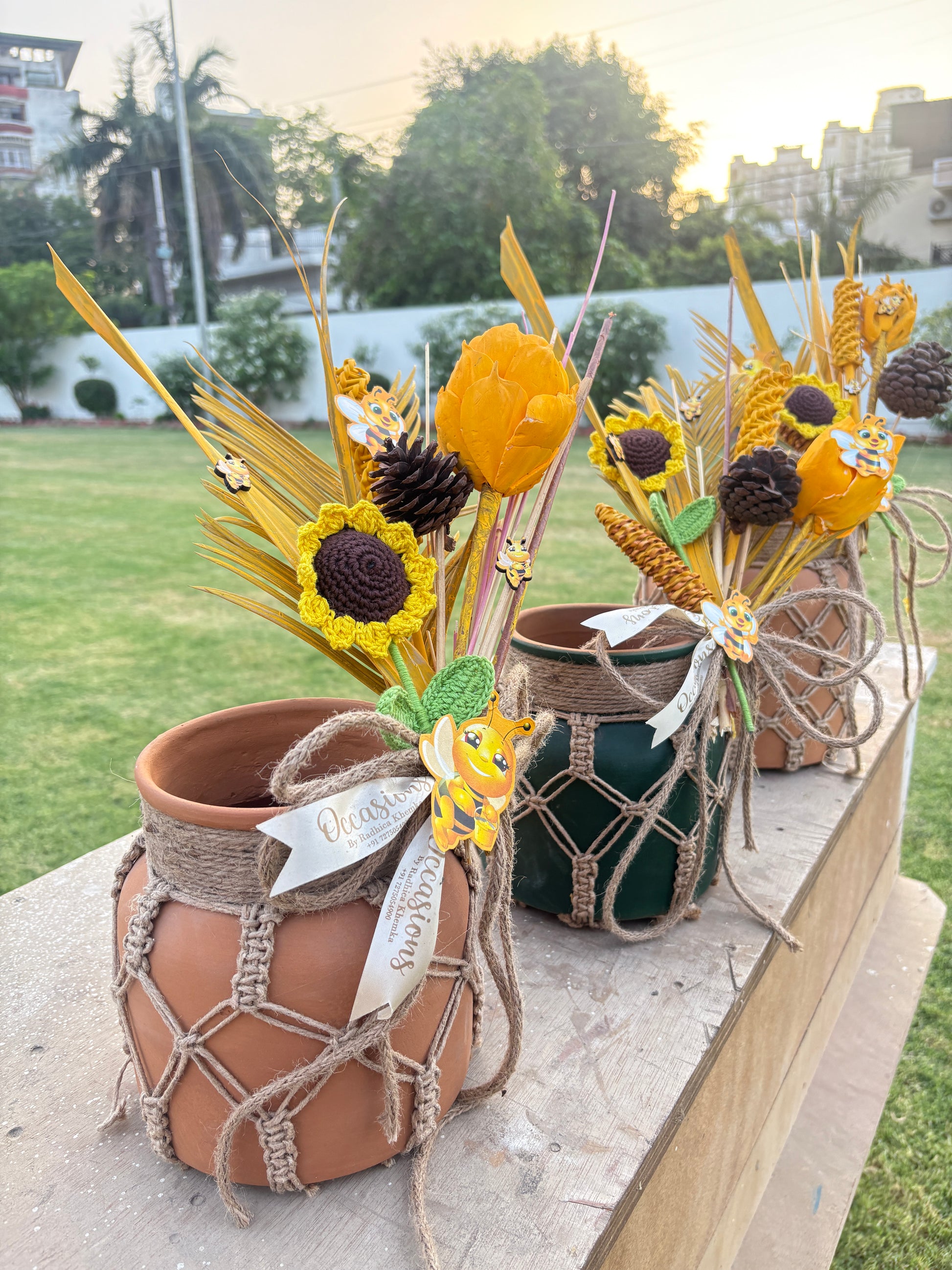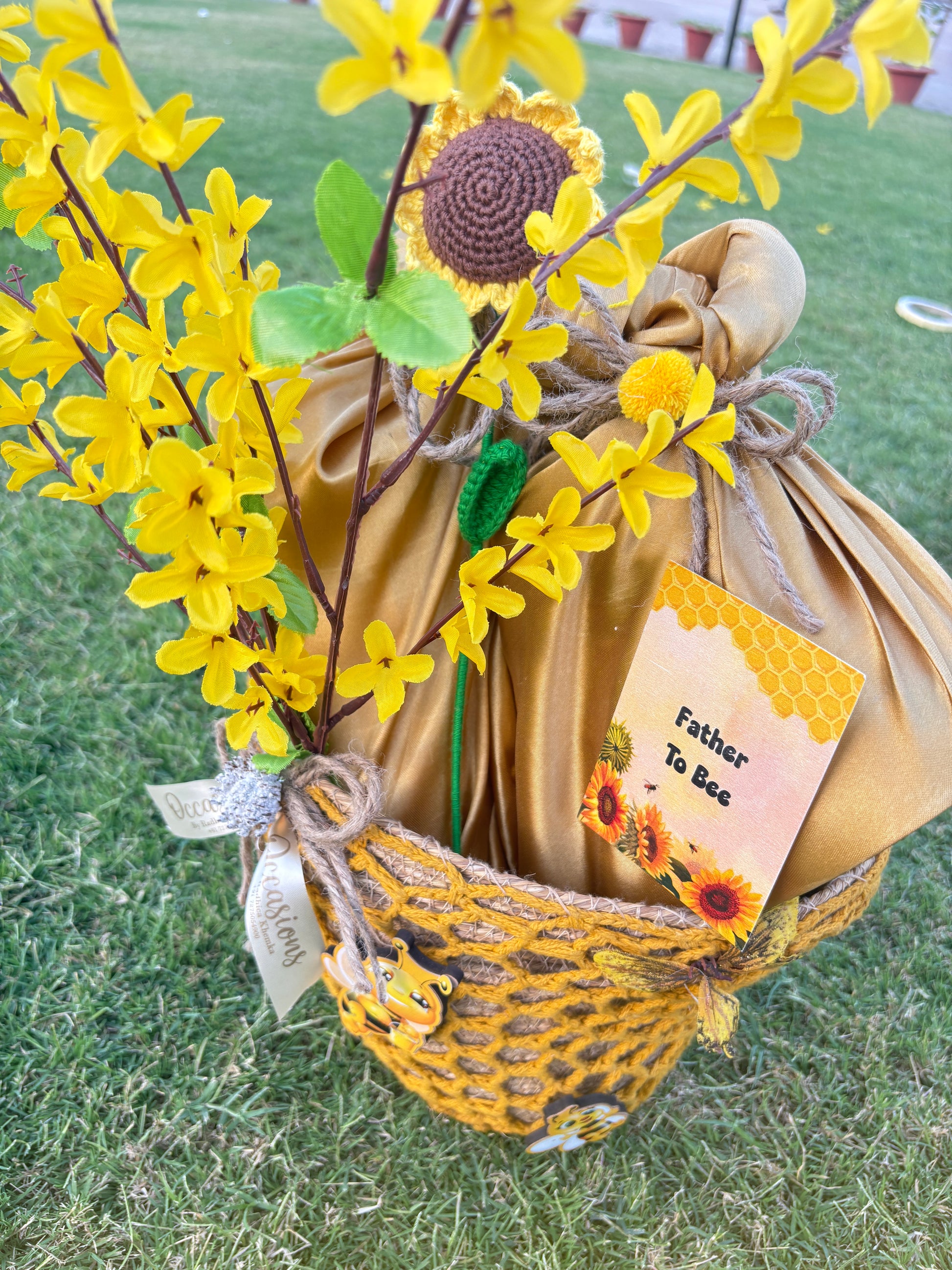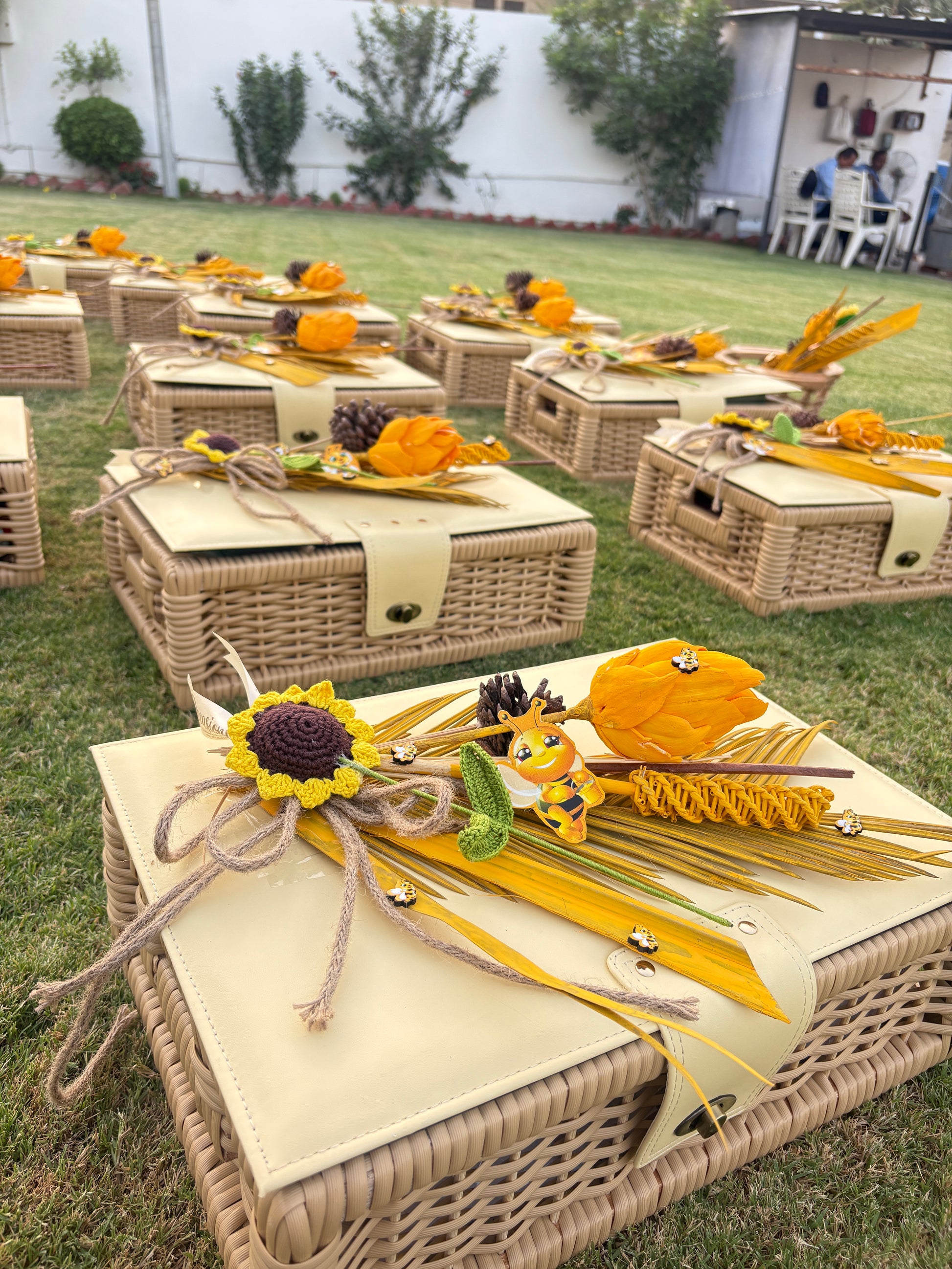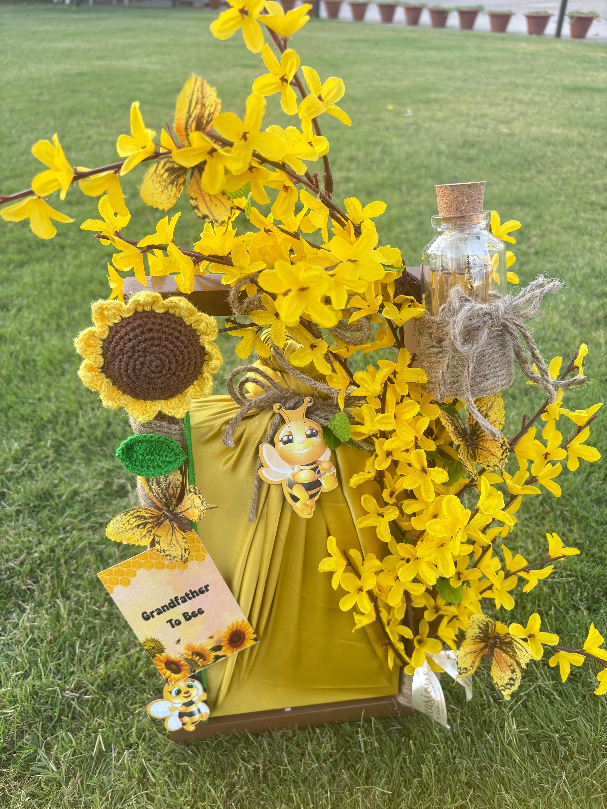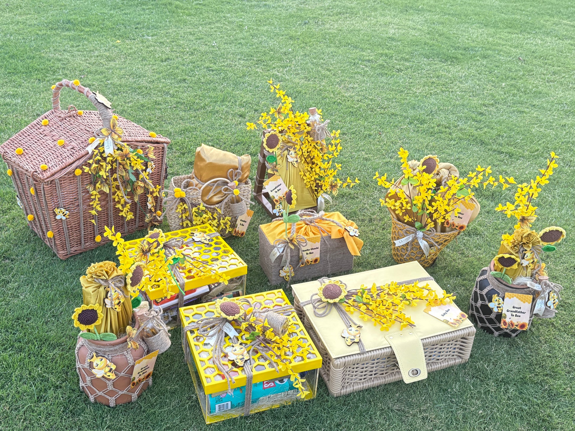 Celebrate your baby shower with this handcrafted bee-themed shower collection, featuring bee themed trays, baskets, and floral decor adorned with cheerful blooms, pinecones, and adorable bee accents. Perfect for announcements, favors, or centerpieces, this charming setup brings sunshine and joy to your special day.