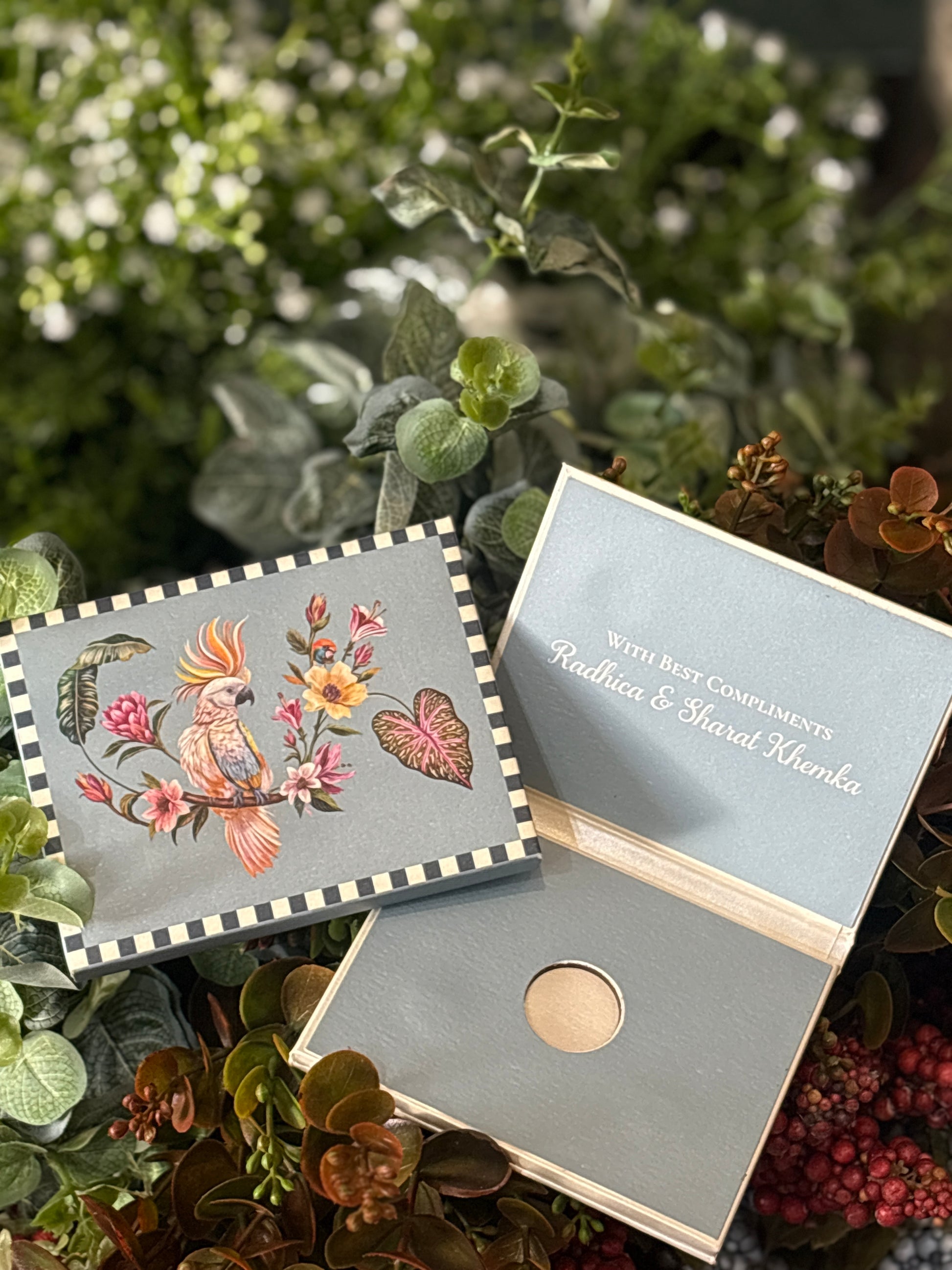 A charming ginni case adorned with a vibrant cockatoo and floral motifs, adding a whimsical yet elegant touch to festive gifting.