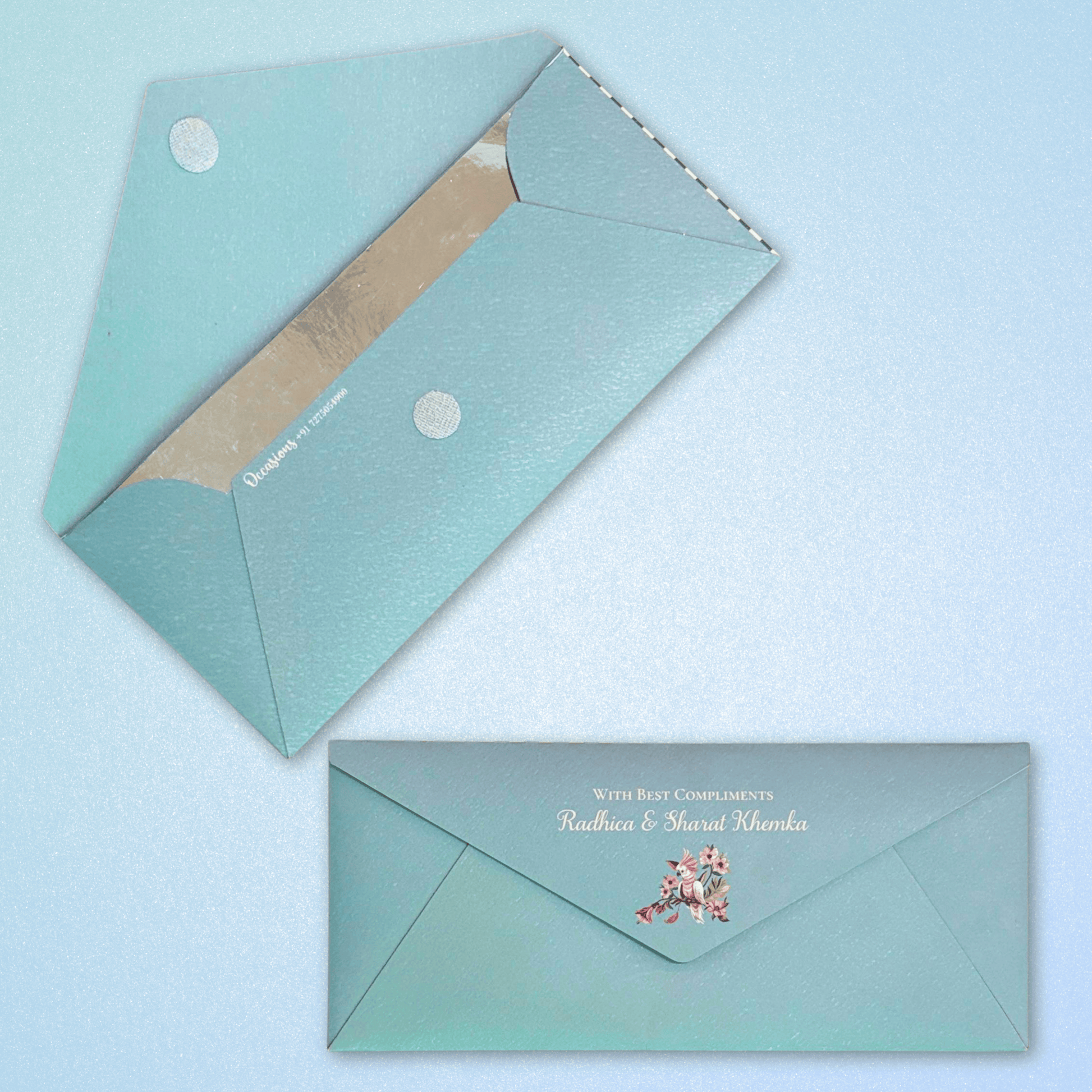 A chic blue money envelope featuring vibrant floral art and a tropical bird, framed with a bold checkered border—perfect for elegant gifting.