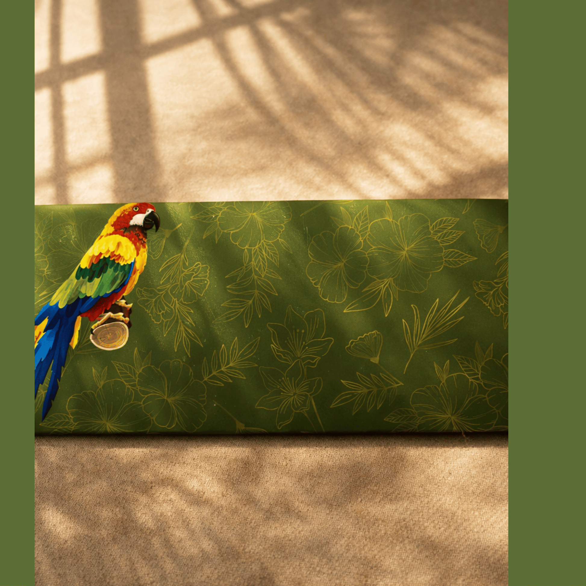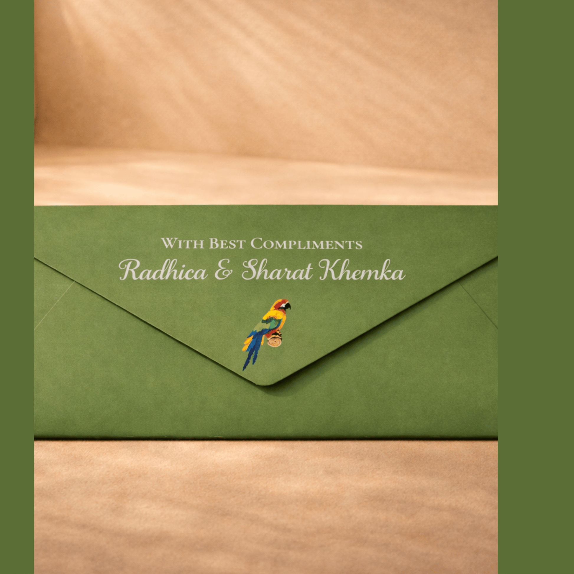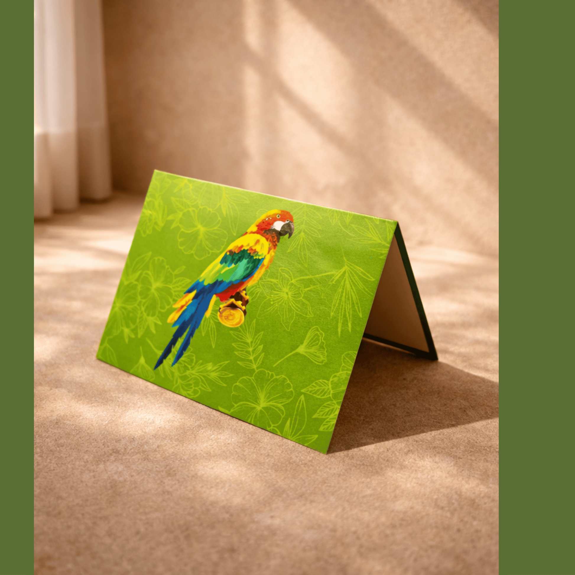 This elegant gift set includes 10 personalized envelopes, 5 gift bags, 5 bottle bags, 5 note cards, 5 gift tags and 1 ginni case which features a vibrant, scarlet macaw motif set against a lush, forest-green background with delicate floral line art.