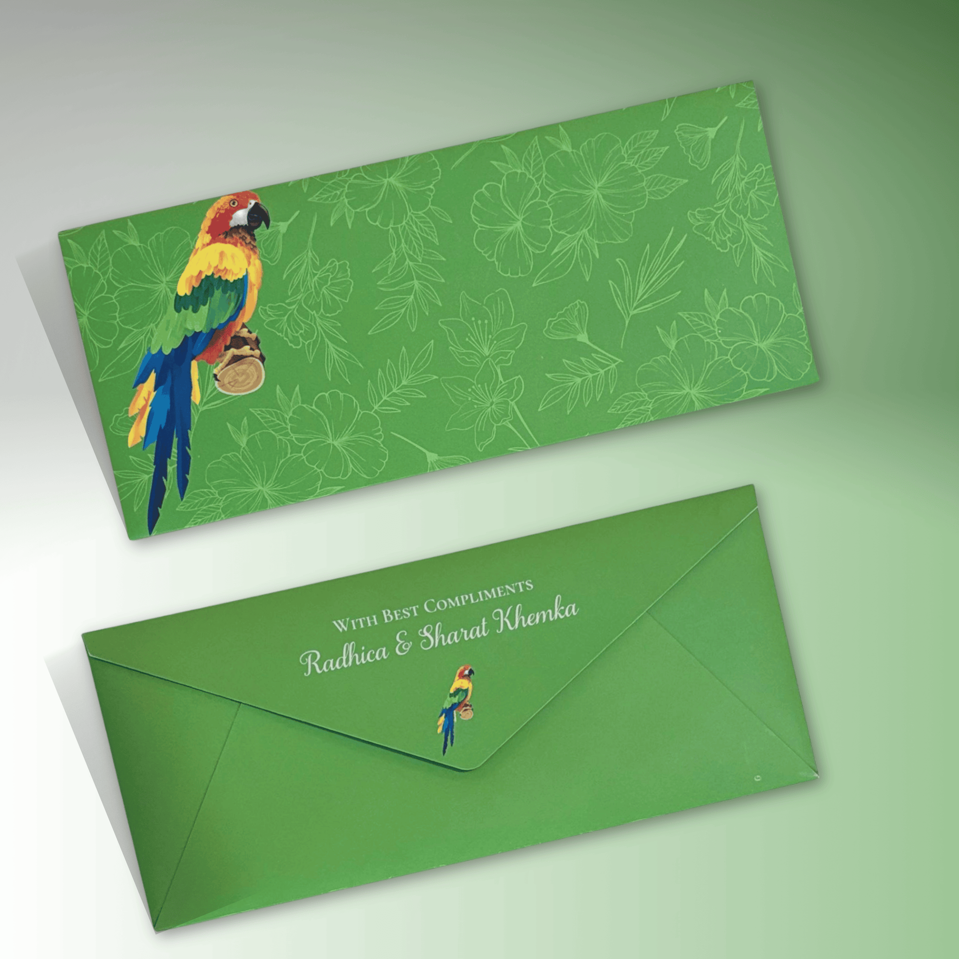 A vibrant green envelope featuring a colorful parrot with subtle floral line art—perfect for cheerful and lively gifting occasions.