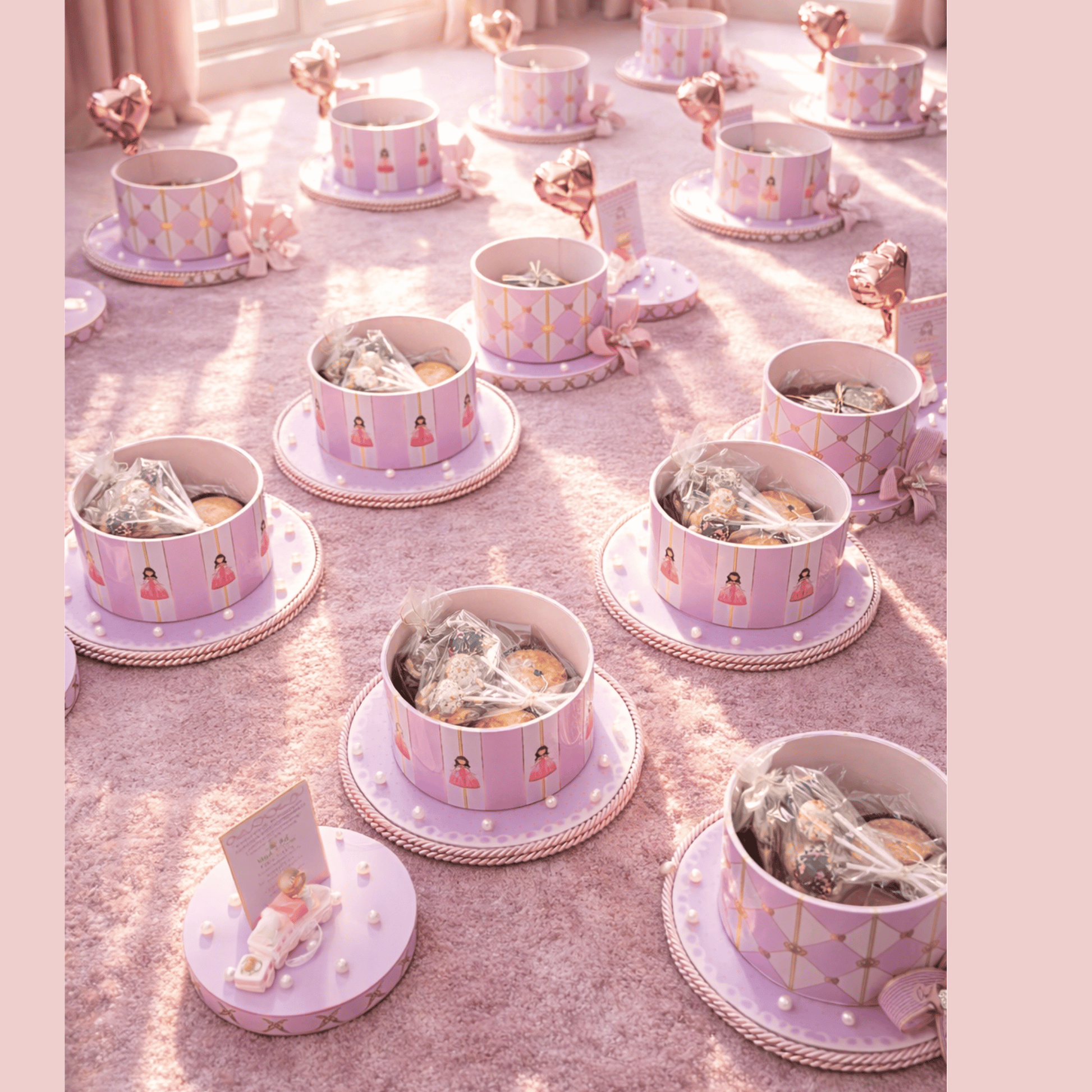 Our all-wooden, two-tier princess cake is more than a baby girl announcement—it’s a fairy-tale confection come to life. Elegantly wrapped in soft shades of pink and lavender, it features dainty ballerina illustrations, pearl embellishments, and satin ribbons for a picture-perfect finish. Each tier opens to reveal a selection of delightful treats—from decadent desserts to gourmet goodies—thoughtfully packed inside. Crowned with a playful topper of a princess riding a pastel train and accompanied by rose-gold balloons, this piece is as functional as it is enchanting. Graceful, whimsical, and made to be treasured—this announcement is pure magic in Every tier.