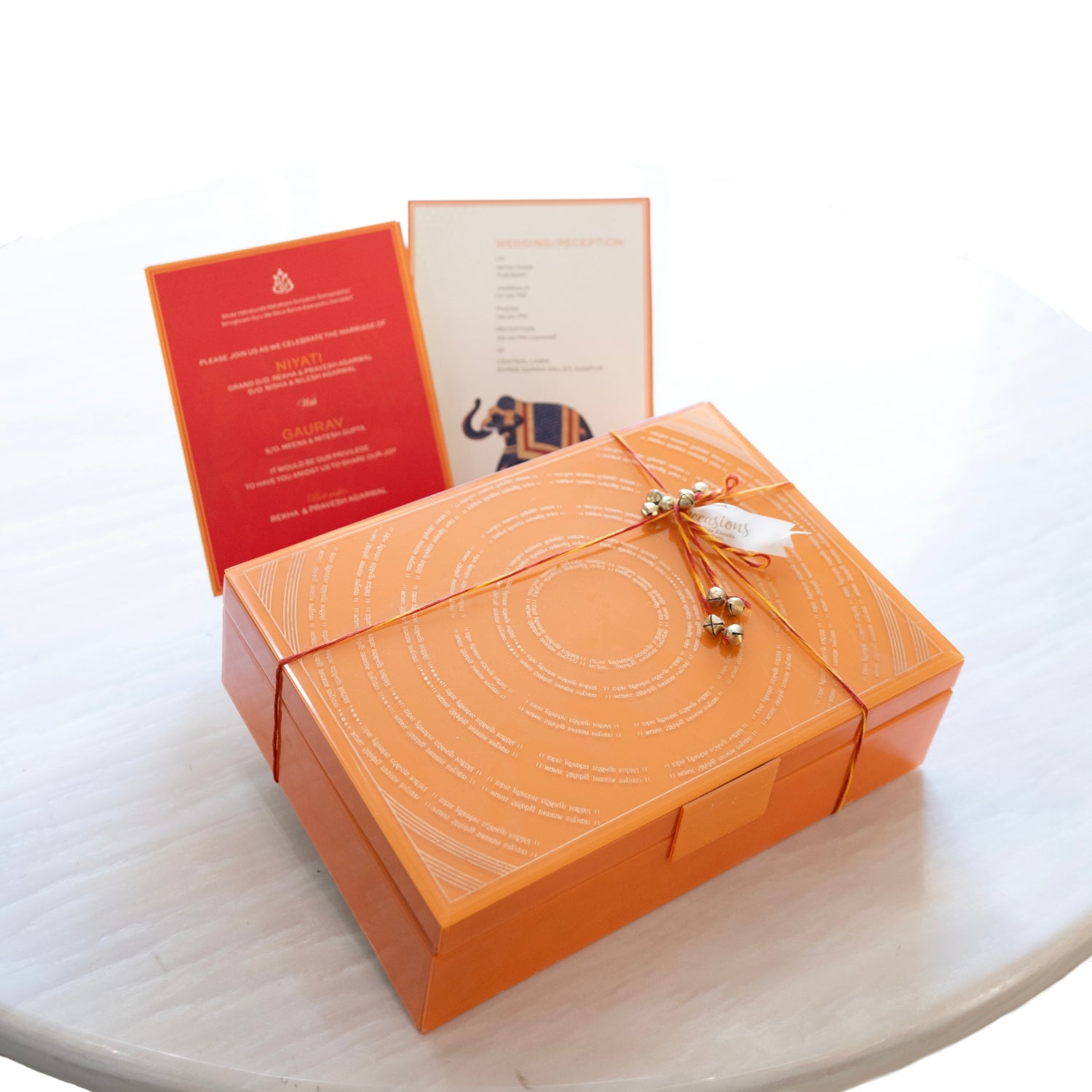 A vibrant orange wedding invitation box features embossed Sanskrit verses in concentric circles. Red and gold threads crisscross the top, adorned with tiny golden bells. The packaging suggests a traditional, auspicious, and elegant celebration with rich cultural craftsmanship.