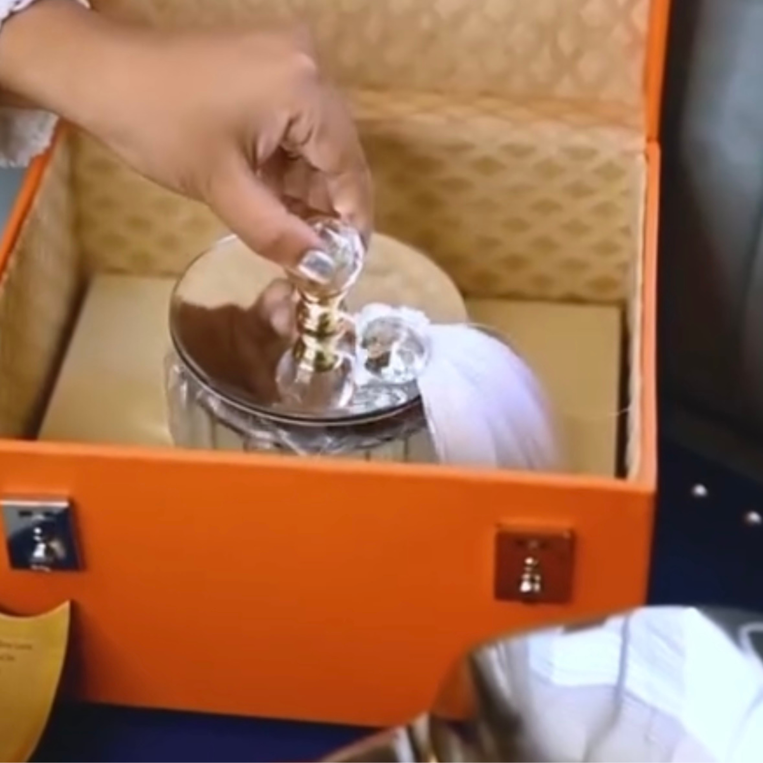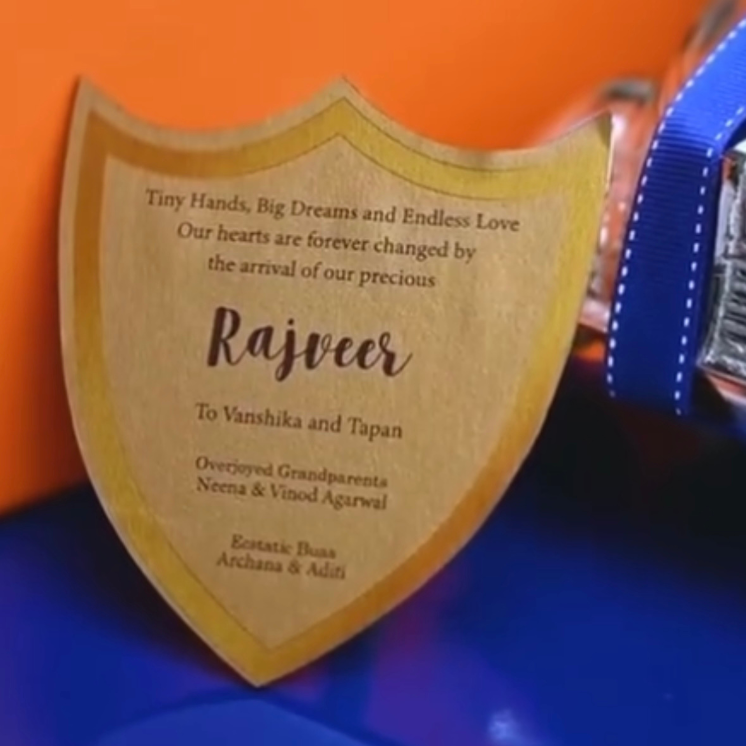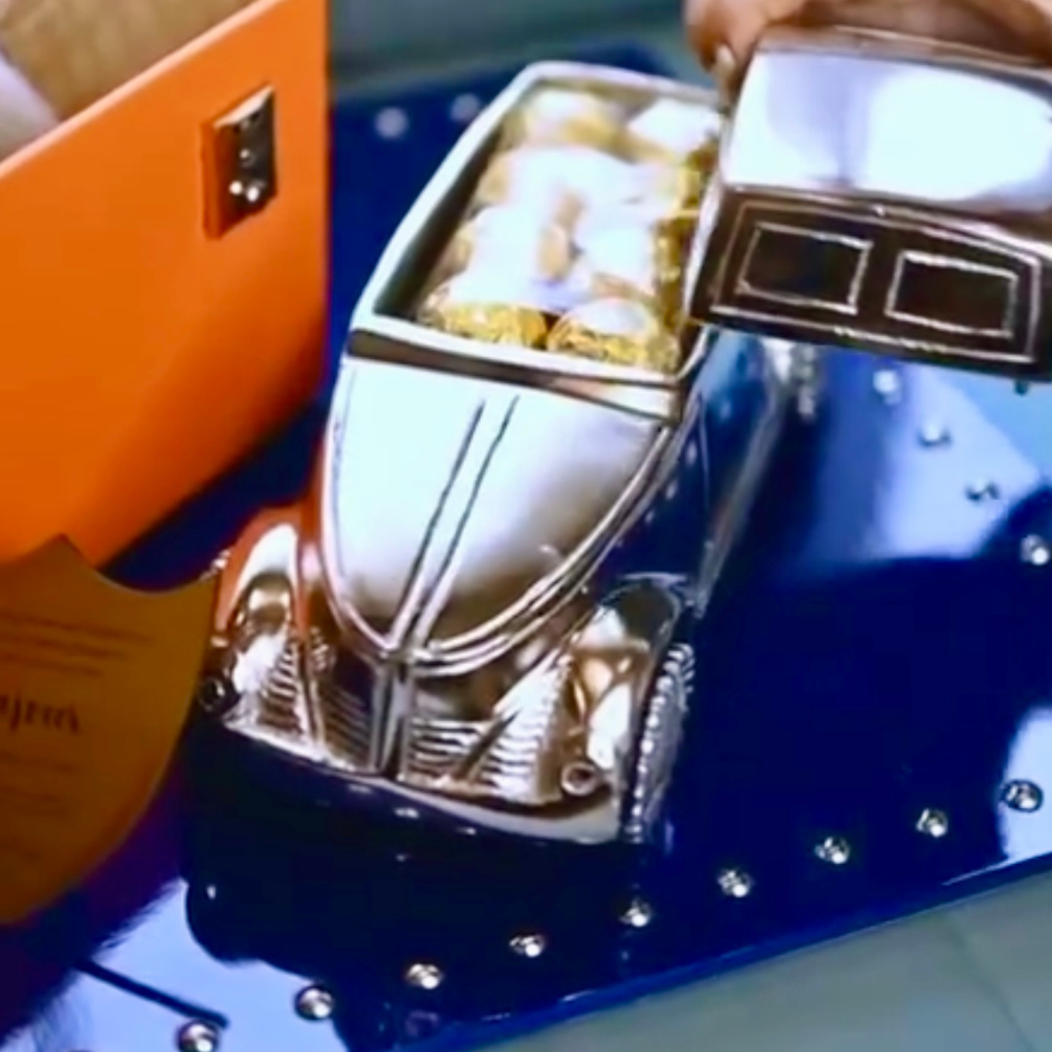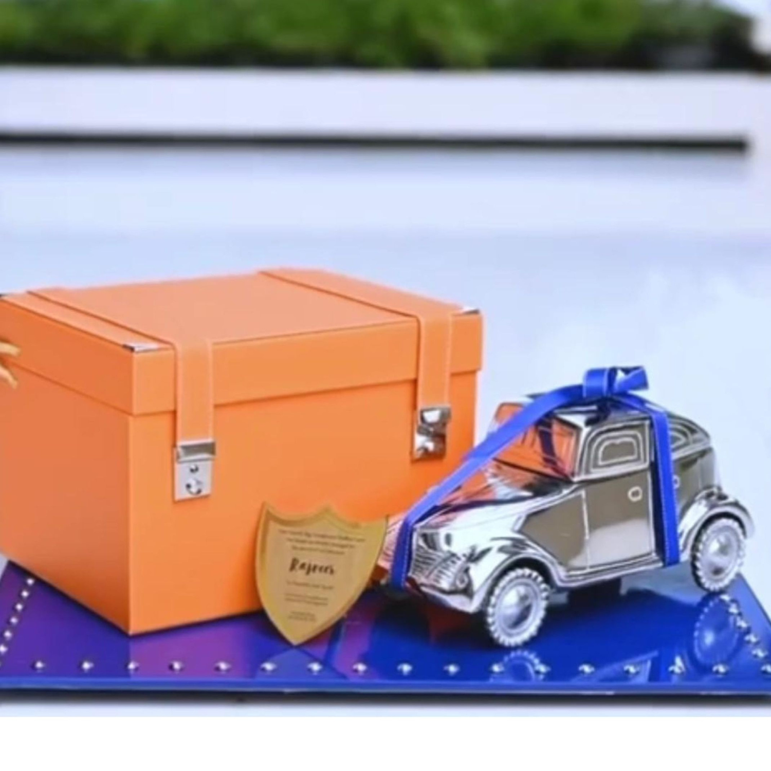 Set on a bold blue wooden platter studded with silver accents, this piece is a perfect blend of regal and retro. An orange leatherite box with silver hardware holds a jar of Rasgullas, while a beautifully crafted vintage car beside it opens up to reveal goodies like granola bars. The announcement itself shines through a golden MDF emblem, adding that final luxe touch.
